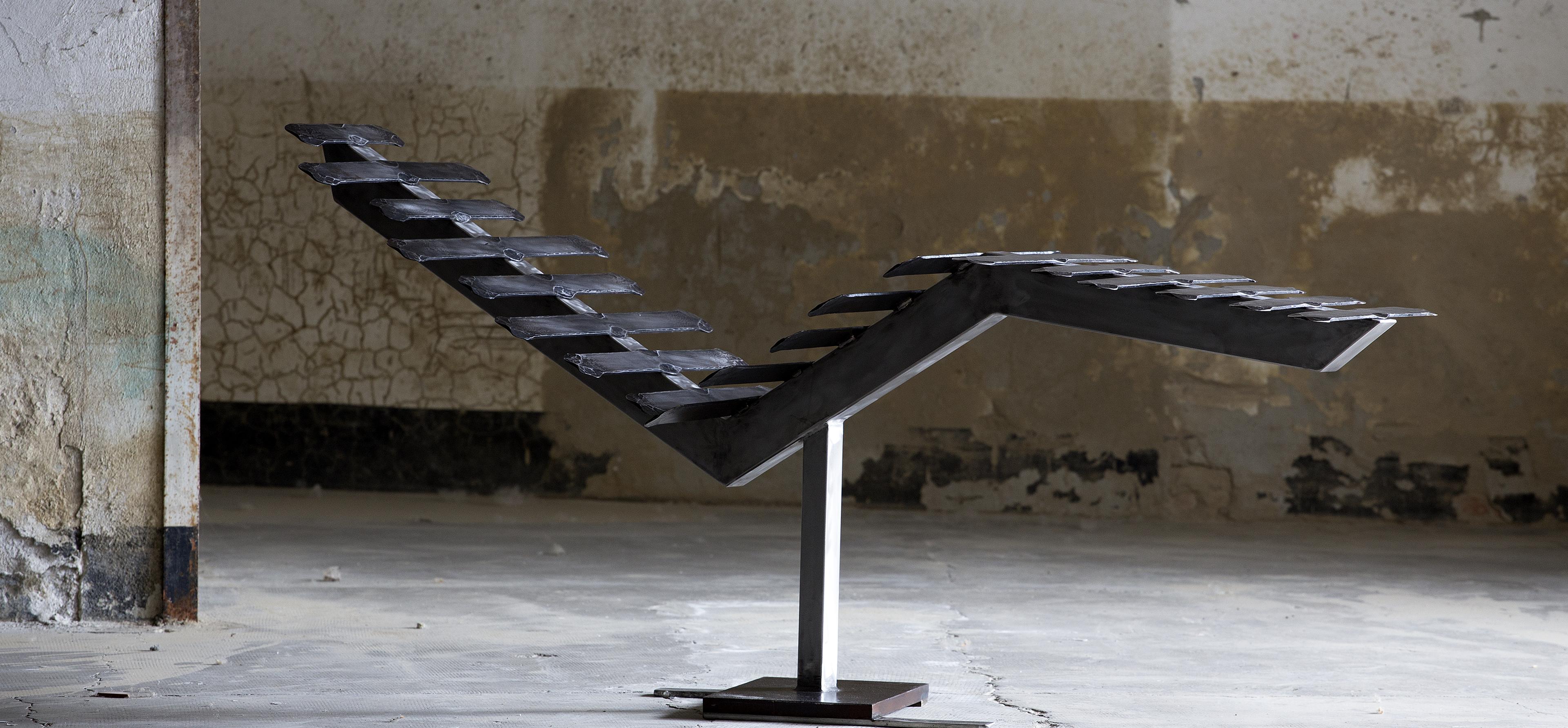 Pont raffiné et élégant entre l'art et le design, cette chaise longue est une sculpture étonnante habilement fabriquée à la main en acier inoxydable pour la base et en fer pour le siège, composée de 19 lattes, chacune soigneusement battue à la main. Toute imperfection témoigne du caractère unique de cet objet d'art et d'ameublement extraordinaire.