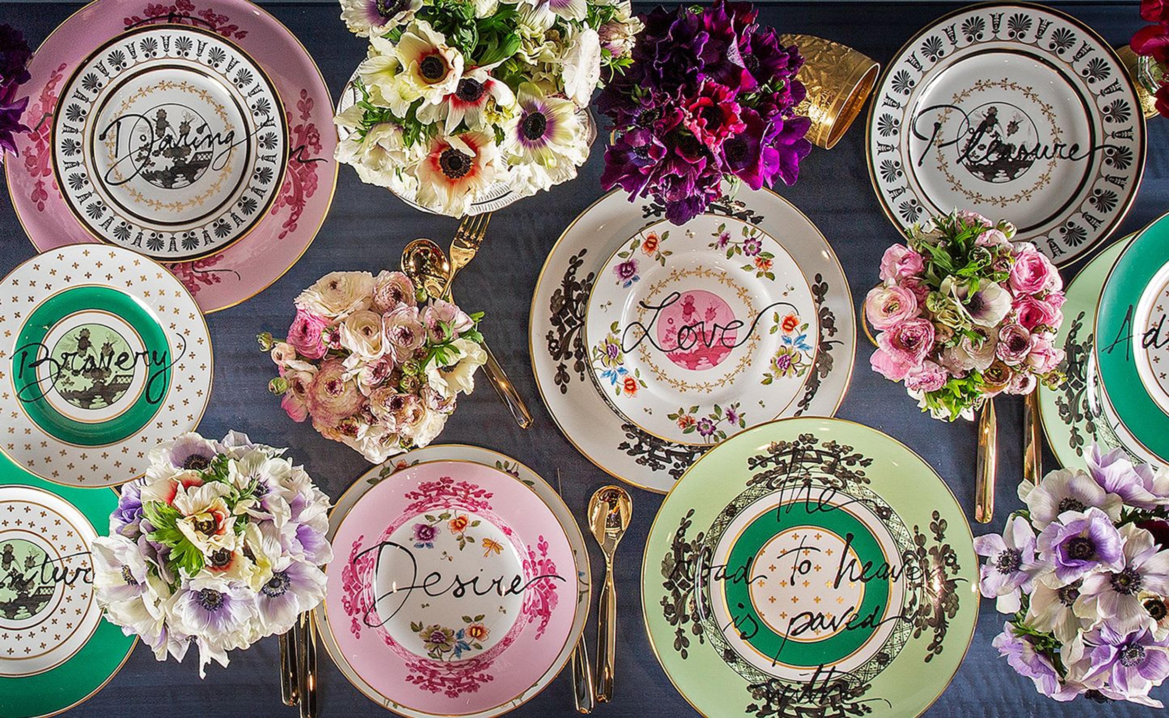 Loosely inspired by the poet William Blake, the charming collection of porcelain plates trimmed with golden details is called “The Road to Heaven is Paved with Excess”, and it brings to life an exclusive series of unique decorative items. The tradition and excellence of Richard Ginori’s porcelain is combined with the glamorous and luxuriant vision of artist and designer Ippolita Rostagno, reinterpreting the most famous and classic Richard Ginori motifs with new exuberant concepts. Each plate has a different word, telling a playful and whimsical story: the simple act of having lunch becomes a sophisticated game.