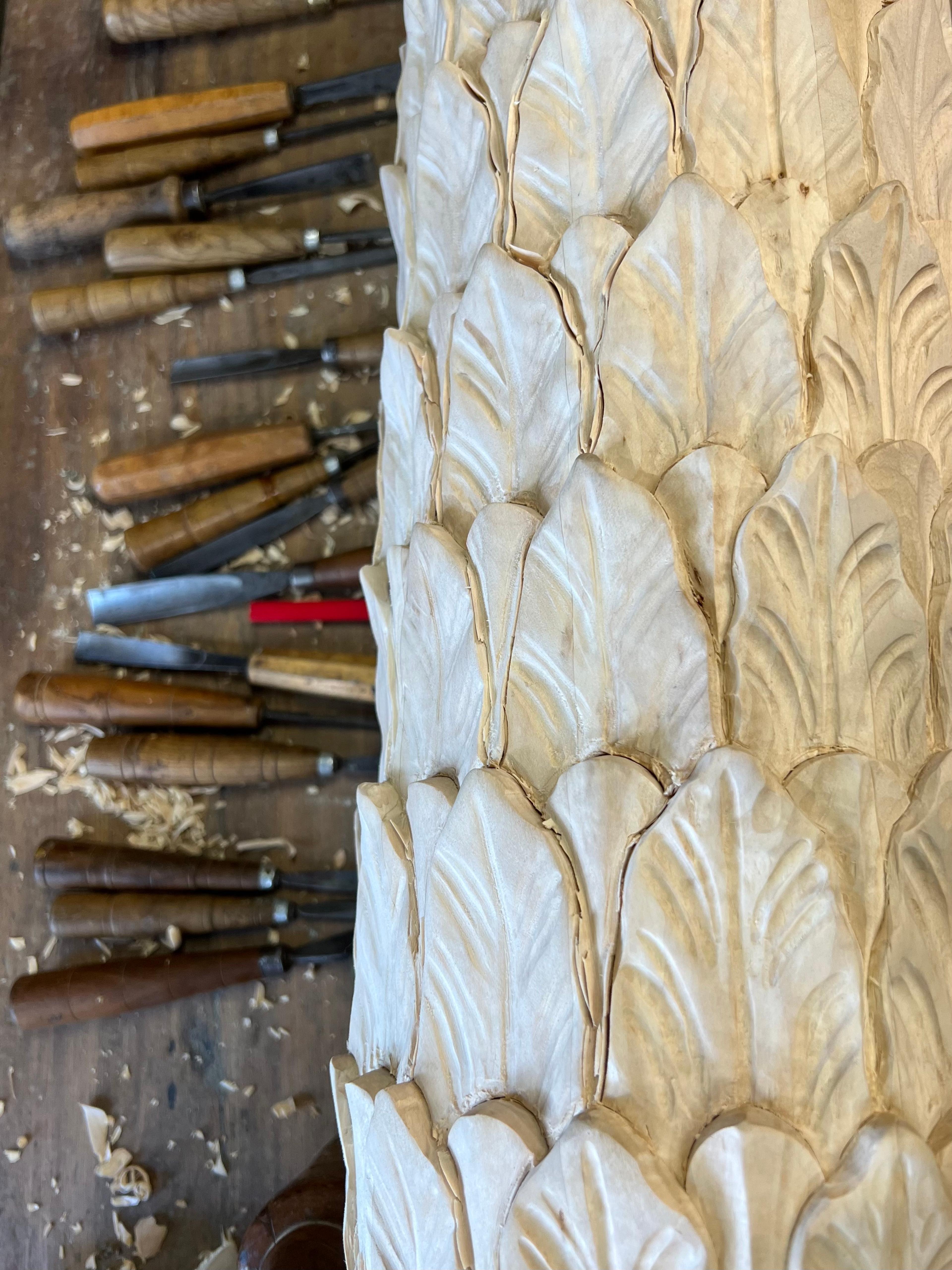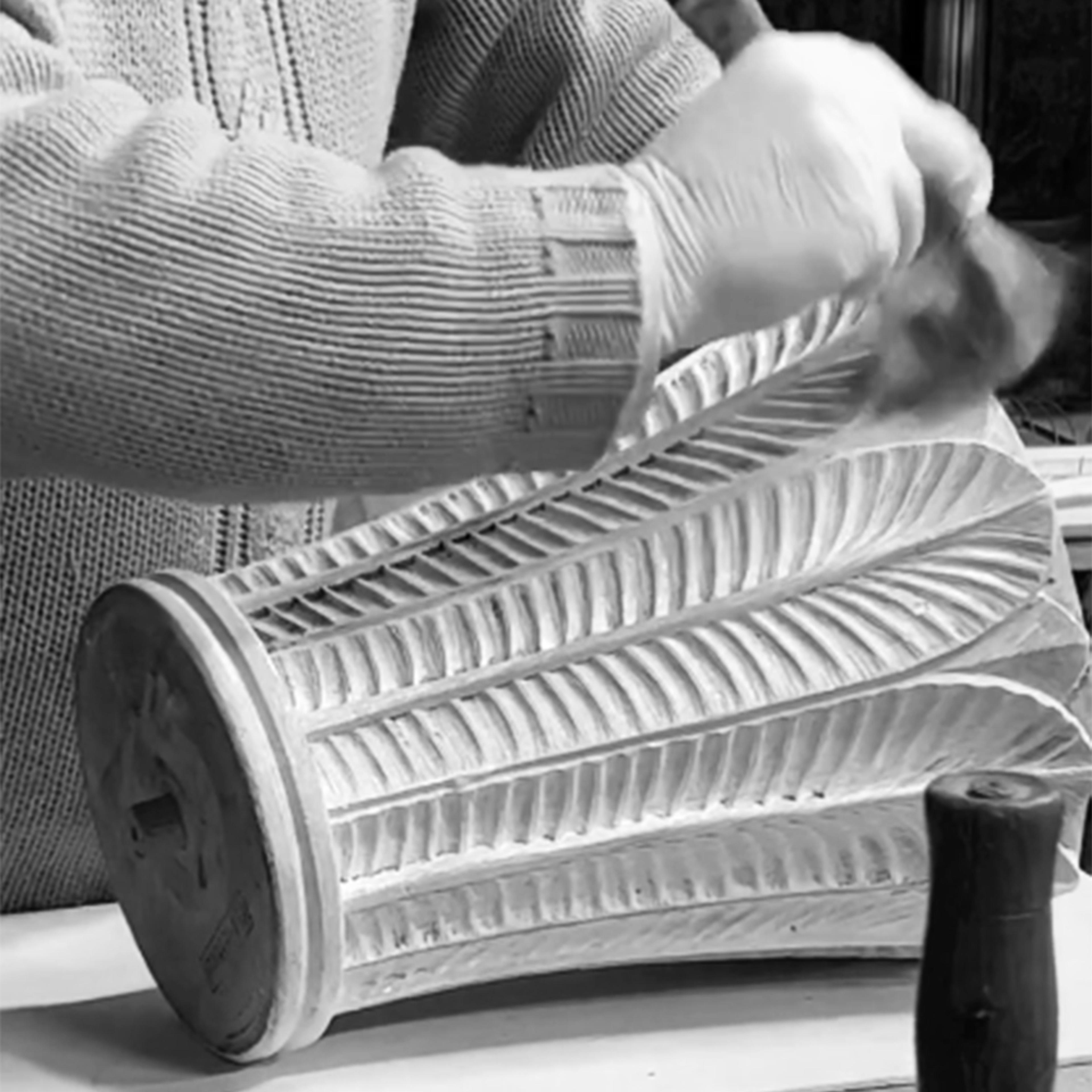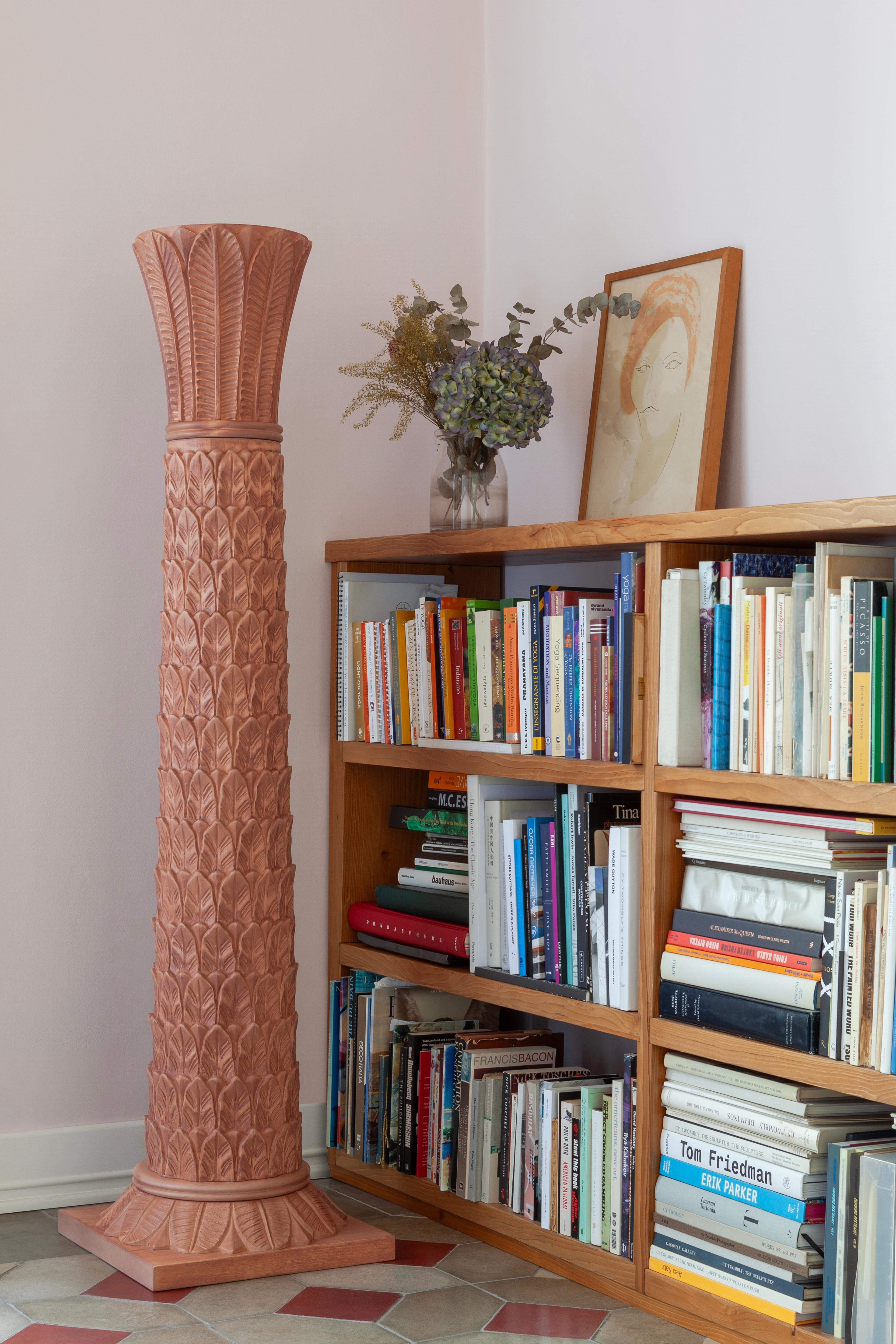 Die Säule Anne zum Beispiel, die sie auf ihrer ersten Mailänder Designwoche 2023 vorstellten, ist eine Mischung aus dieser Suche nach dem Alten und dem Modernen: Nachdem sie aus massiven Lindenholzstücken die Form einer Säule zusammengesetzt haben, wird sie auf einem Pantographen geformt und anschließend von Hand geschnitzt (eine Woche Arbeit pro Säule allein für die Schnitzerei). Beim Einfärben wird die Farbe aufgetragen und dann von Hand mit einem Tuch "ausgefranst", um einen etwas verblassten Effekt zu erzielen und eine Ähnlichkeit mit der Inspirationsquelle für diese Palette herzustellen: die