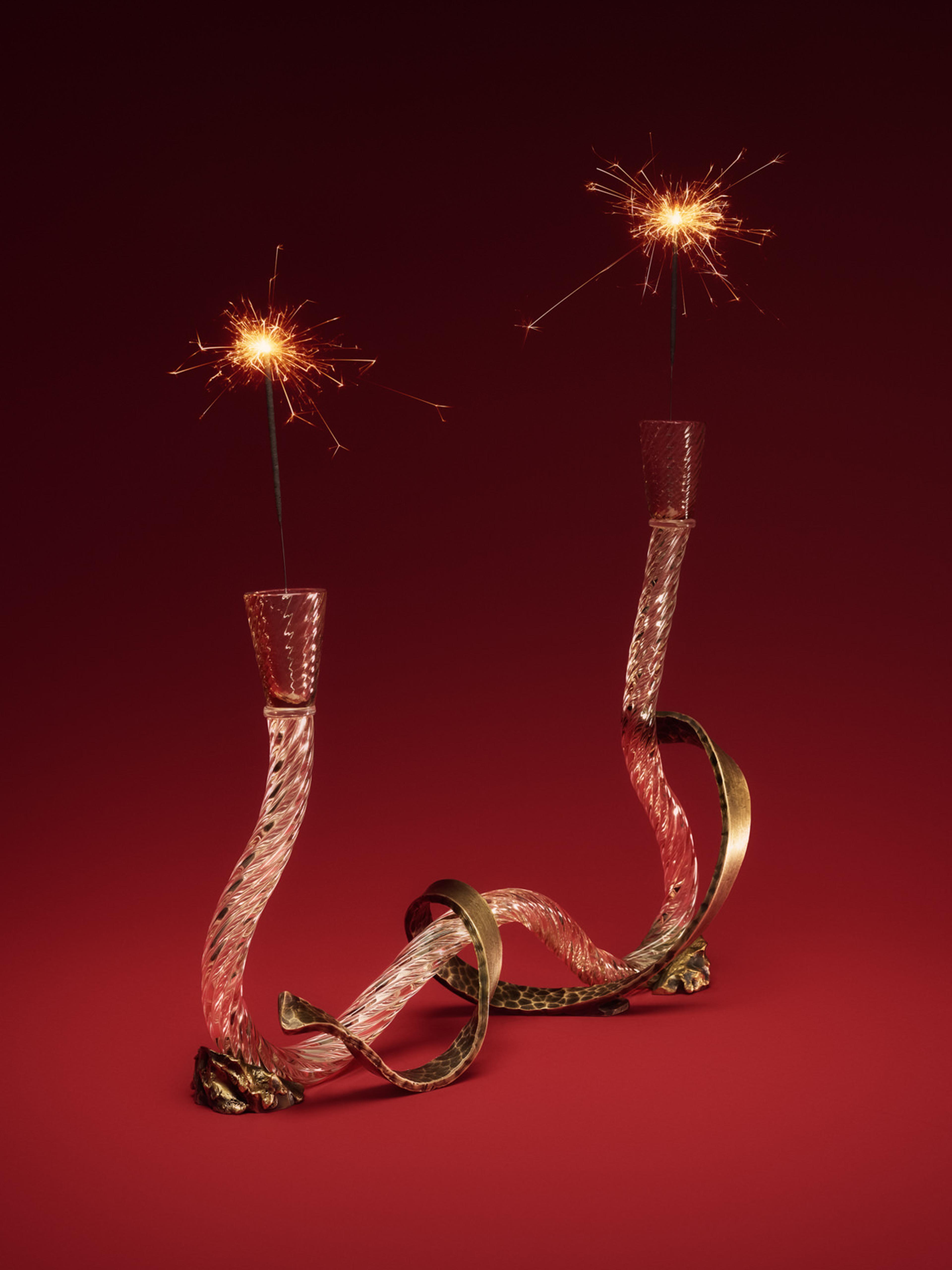 Der von Aina Kari handgefertigte Kerzenhalter Ribbon aus Muranoglas ist ein atemberaubendes Beispiel italienischer Kunstfertigkeit, das die reiche Schönheit des venezianischen Glases mit eleganten, von Hand geschwungenen Messingakzenten kombiniert. Seine fließende, geschwungene Silhouette schafft ein dynamisches Zusammenspiel von Form und Textur, während die taktile, gehämmerte Oberfläche des Messings die Tiefe und Farbe des Glases hervorhebt. Das Set besteht aus zwei Kerzenhaltern mit Kerzen, die ein harmonisches und raffiniertes Mittelstück für jedes Interieur darstellen.