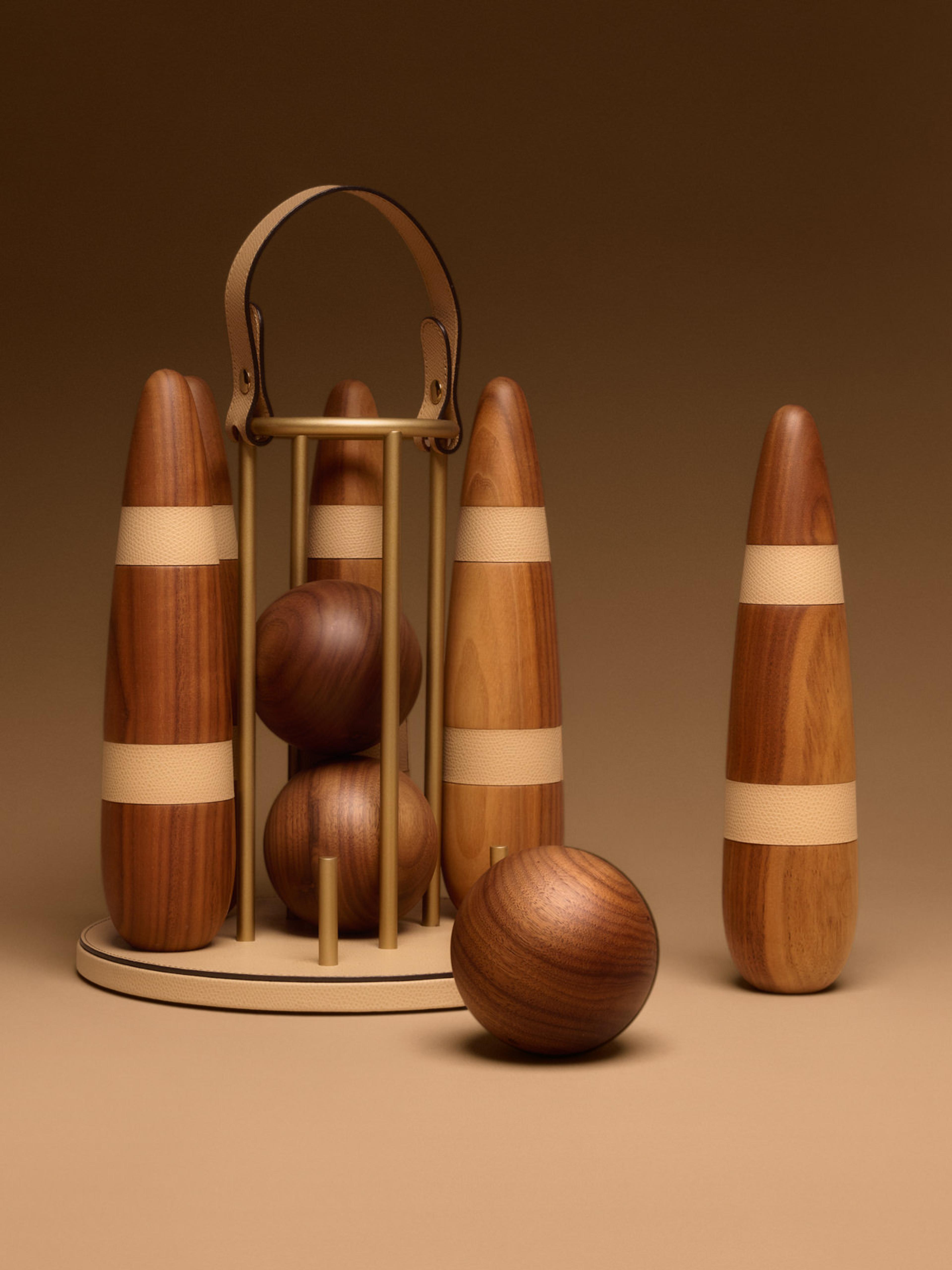 Dieses elegante, von Pinetti handgefertigte Bowling-Set aus Canaletto-Nussbaum verwandelt einen klassischen Zeitvertreib in ein raffiniertes Designobjekt. Es ist mit sechs eleganten Pins und drei Kugeln ausgestattet und mit biskuitfarbenen Lederdetails verziert, die seinen raffinierten Charakter unterstreichen. Die stilvolle Halterung mit Ledergriff und satinierten Messingeinsätzen macht es leicht zu tragen und schön zu präsentieren.