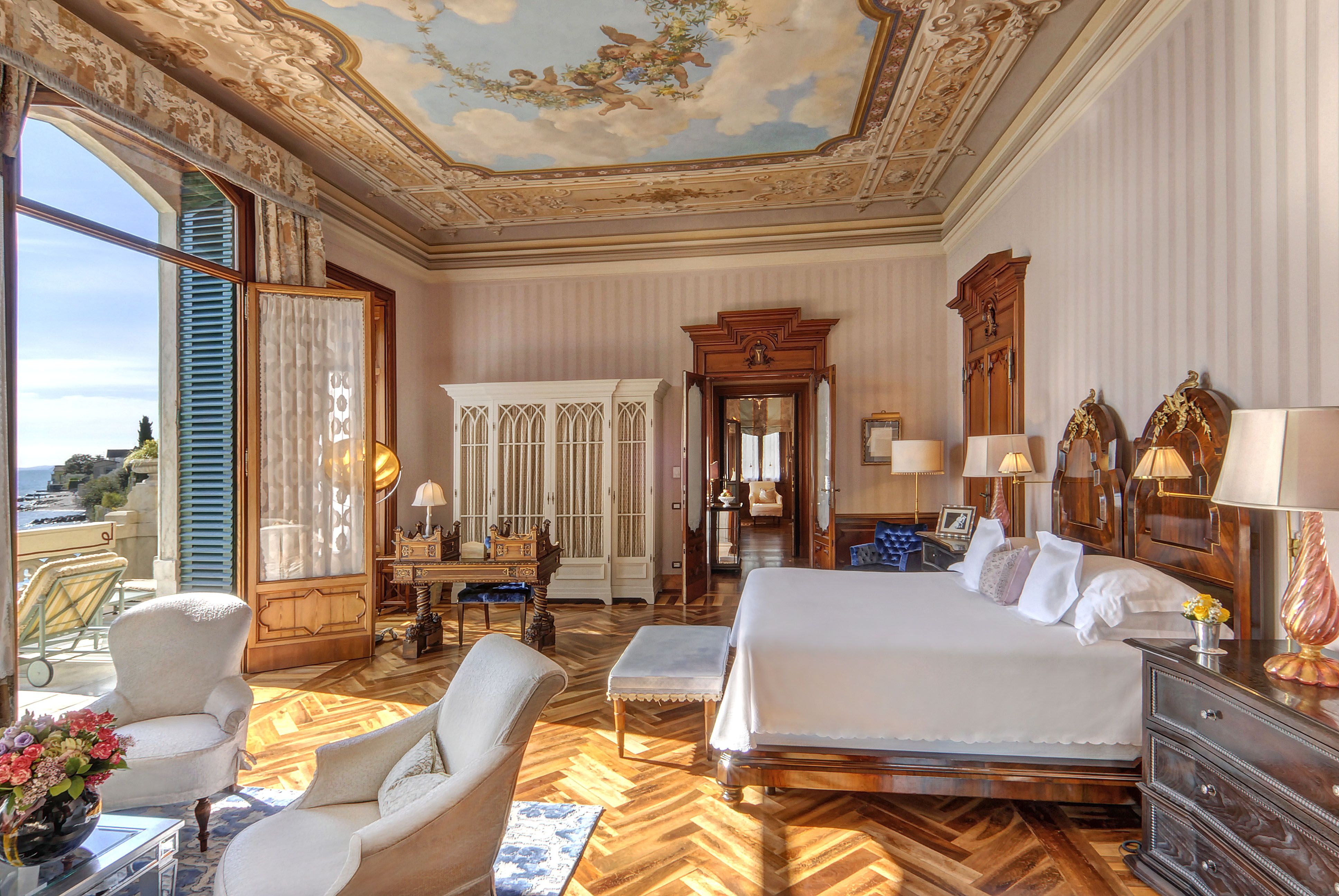 Zur Einrichtung gehören handgefertigte Lampen aus venezianischem Glas, in Silber gerahmte Fotografien und Schreibtische mit handbedrucktem venezianischem Papier, während die Badezimmer mit beheizten Marmorböden, vernickelten Armaturen aus London und tief eindringenden französischen Porzellanwannen ausgestattet sind. Sogar die Vorhänge sind kunstvoll: ein zart bestickter Stoff, der von Rubelli aus Venedig nach einem in der Villa gefundenen Original inspiriert wurde.