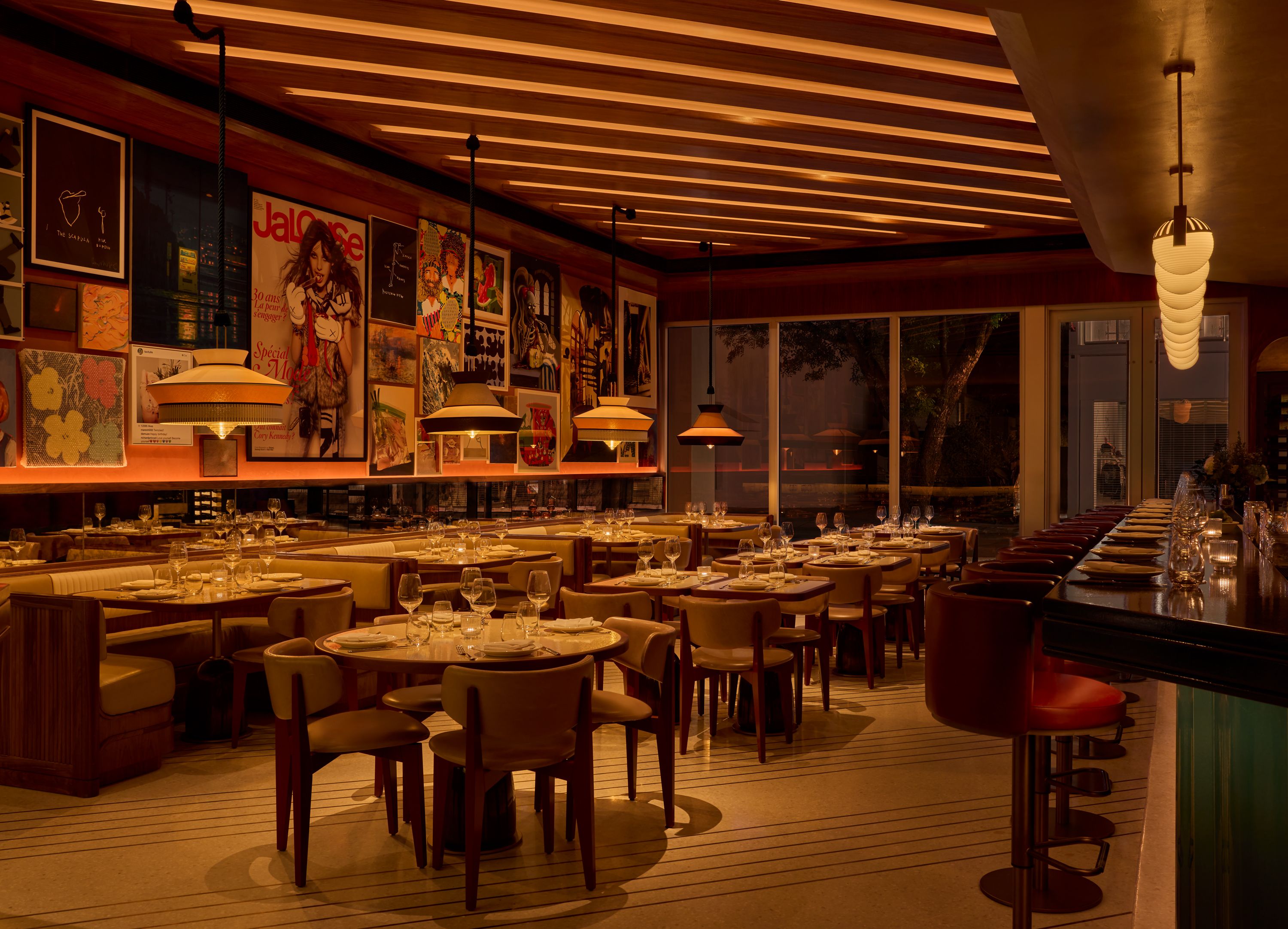 Die von der Rockwell Group entworfene und exklusiv für Le Specialià gefertigte Beleuchtung aus Messing und Glas beleuchtet die Bar. Die in Venetien gefertigten Kugeln aus mattiertem, geblasenem Glas werden von Metallhalterungen aus Messing getragen und verleihen der Bar Wärme, Tiefe und eine skulpturale Präsenz, während sie gleichzeitig die Materialsprache der Einrichtung unterstreichen.