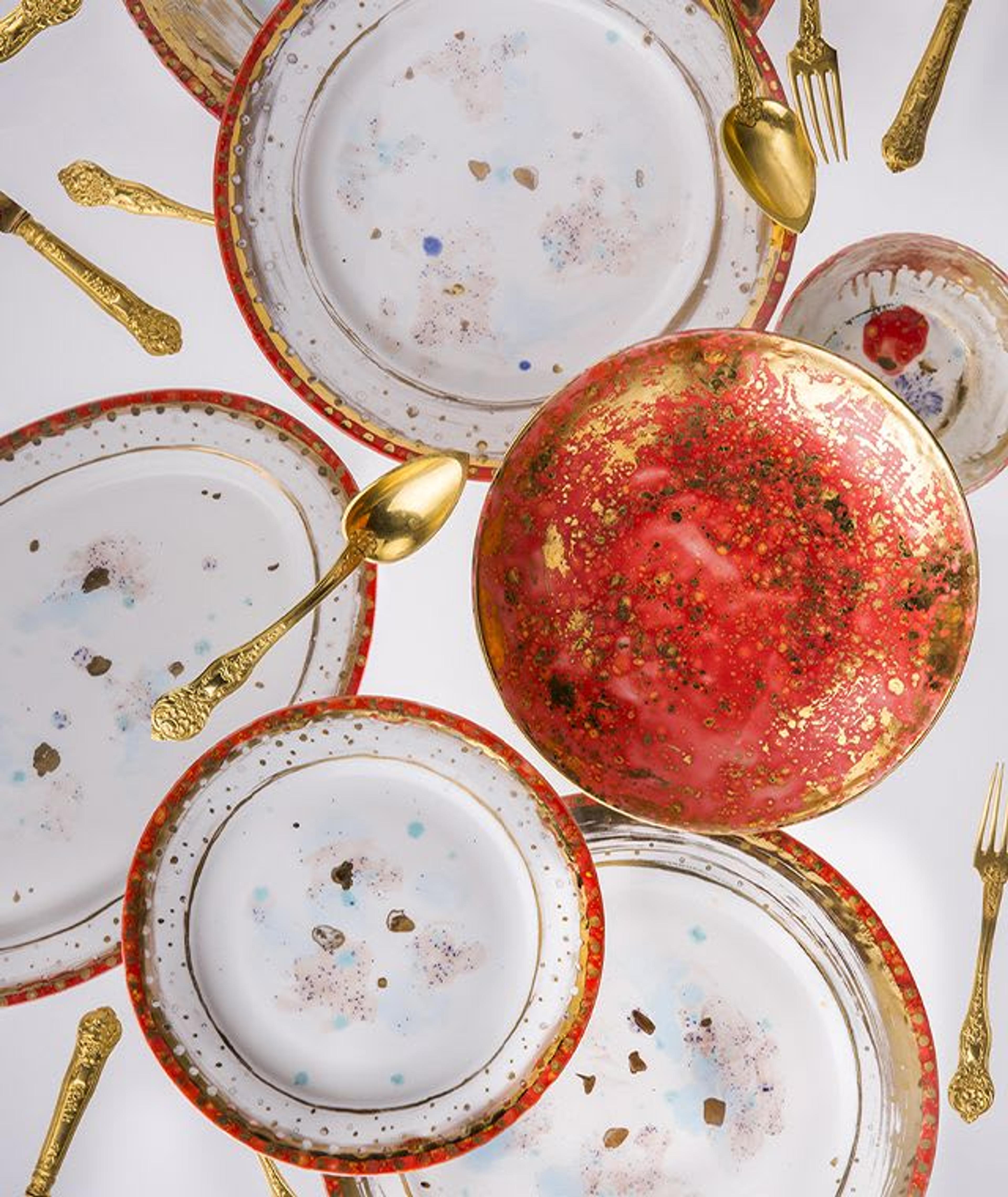 Ich verwende auch viele andere Materialien, aber ich habe mich entschieden, Porzellan in Szene zu setzen. Ich bevorzuge Knochenporzellan, das den Vorteil hat, dass es dank seiner widerstandsfähigen chemischen Struktur strukturierte Dekorationen tragen kann, während andere europäische Porzellane sehr leicht zerbrechen würden. Gold und Silber bringe ich ins Spiel, weil sie meinen Kreationen einen ätherischen Touch verleihen, ähnlich wie das Gold in der sakralen Kunst, in barocken Kirchen, in der religiösen Ikonographie und auf den goldenen Hintergründen von Holztafeln aus dem 14. und 15.