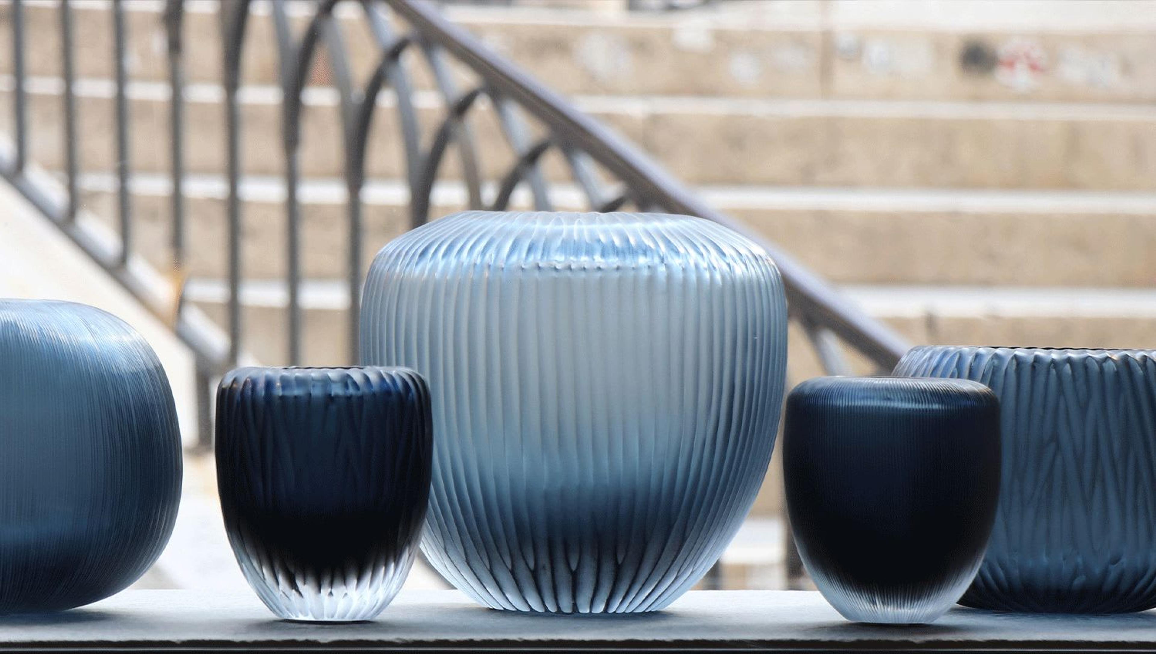Unser Ansatz und unsere Ästhetik sind sehr persönlich und zeitgemäß, aber der kreative Prozess bleibt den traditionellen Techniken treu. Das Glas wird im Feuer geformt und in seinem glühenden Zustand von Hand geblasen. In einigen Fällen wird das Glas nach dem Abkühlen bearbeitet und mit Diamanträdern graviert, die die nun gehärtete Oberfläche formen. Die "kalte" Gravurtechnik von Murano, die einen Großteil unserer Arbeiten auszeichnet, ermöglicht es uns, Facetten zu schaffen, die Lichtreflexe erzeugen, die denen des Lichts auf dem Wasser ähneln. Der Übergang vom Feuer zum Wasser, die Kombination von heißer und kalter Arbeit, ist gerade einer der überraschendsten Aspekte dieses Materials und seines Verfahrens.