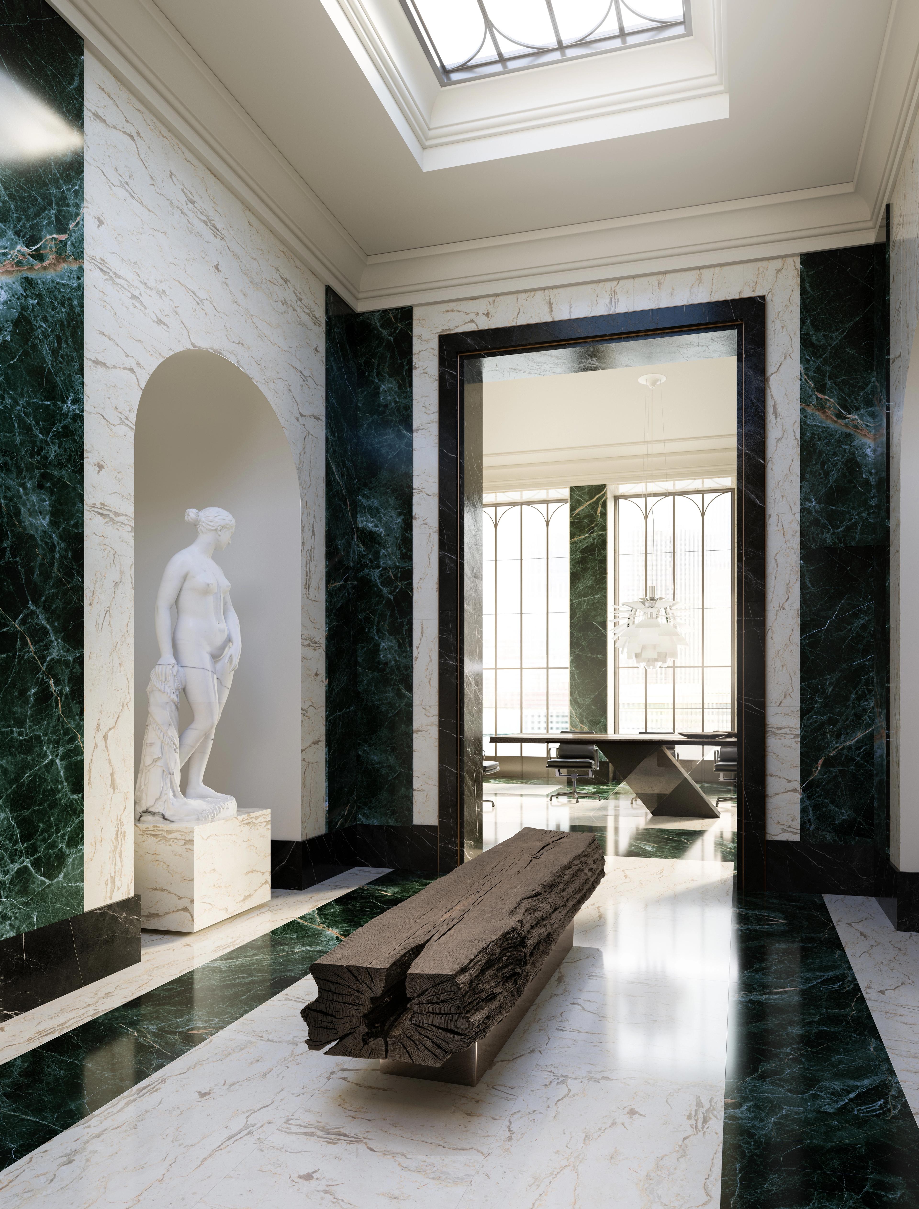 Lambda, mit dem in seinem Kern eingebetteten Licht, stellt ein Design von unvergleichlicher, uralter Schönheit dar, das mühelos der natürlichen Form der sinusförmigen Wellenbewegungen der Wellenlängen folgt. Jedes Stück ist ein zeitgenössisches Unikat, das nach den höchsten Standards traditioneller Techniken von Hand gefertigt wird und mit der neuesten LED-Technologie ausgestattet ist. Das fertige Stück strahlt ein warmes, geheimnisvolles Licht aus, das den gesamten Wohnraum erfüllt und die zeitlose Natur der versteinerten Eiche perfekt widerspiegelt. Lambda erzählt eine faszinierende Geschichte für alle, die auf der Suche nach nachhaltigem Luxus sind, ohne die bestehenden Wälder zu schädigen und mit einer Produktion, die die Umwelt nahezu nicht belastet.