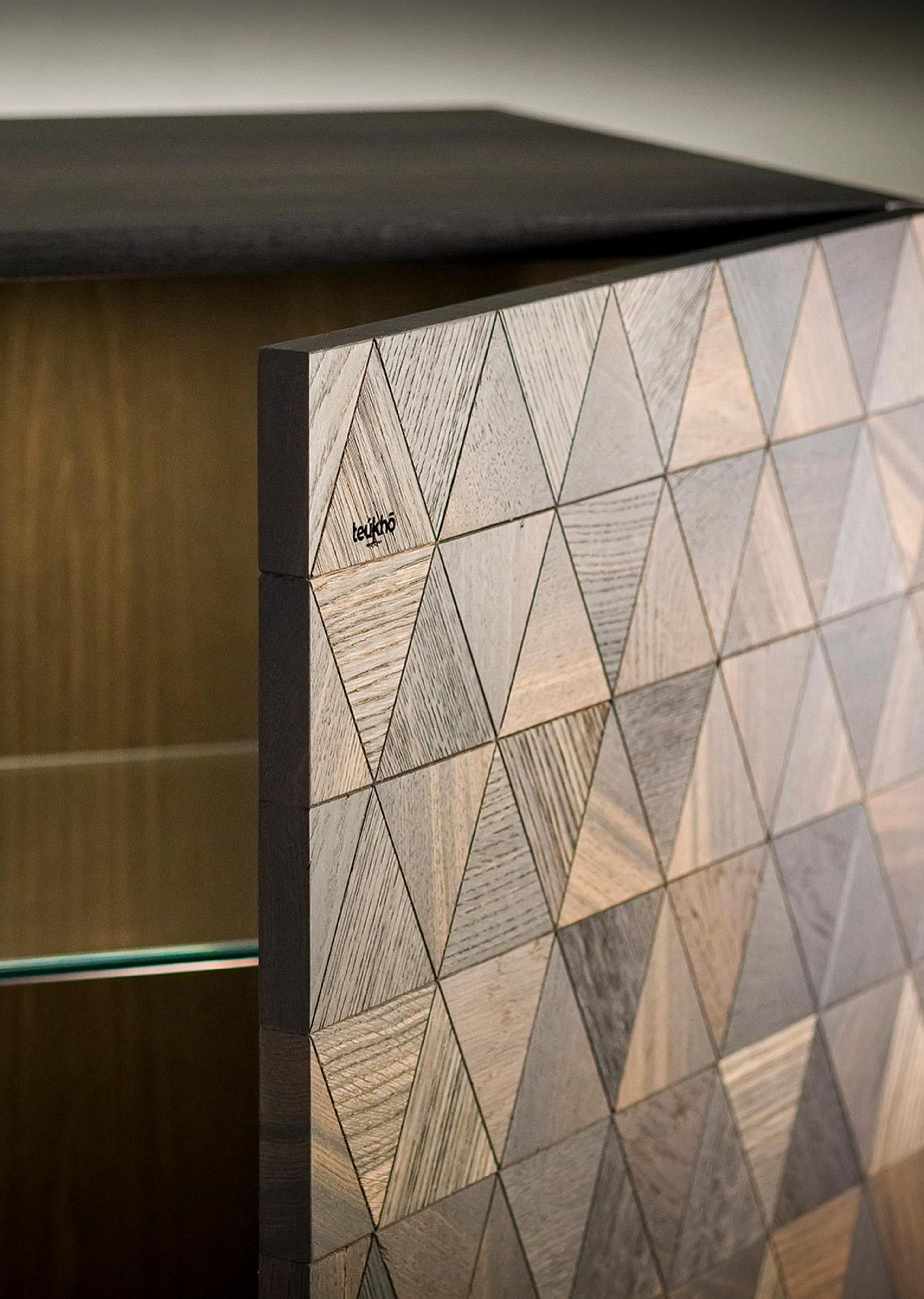 Heutzutage sind CNC-Maschinen zweifellos unverzichtbar für jede Produktion, aber einige Arbeitsschritte erfordern die fachmännische Hand eines Handwerkers. Bei der Anrichte Trigono erfordert die Vorbereitung der Dreiecke für die Türen eine sorgfältige Arbeit bei der Zusammenstellung der Farben, der Überschneidung der Maserungen und der Vorbereitung aller Montageverbindungen. Ohne die Hilfe erfahrener Handwerker wäre dies nicht zu bewerkstelligen.