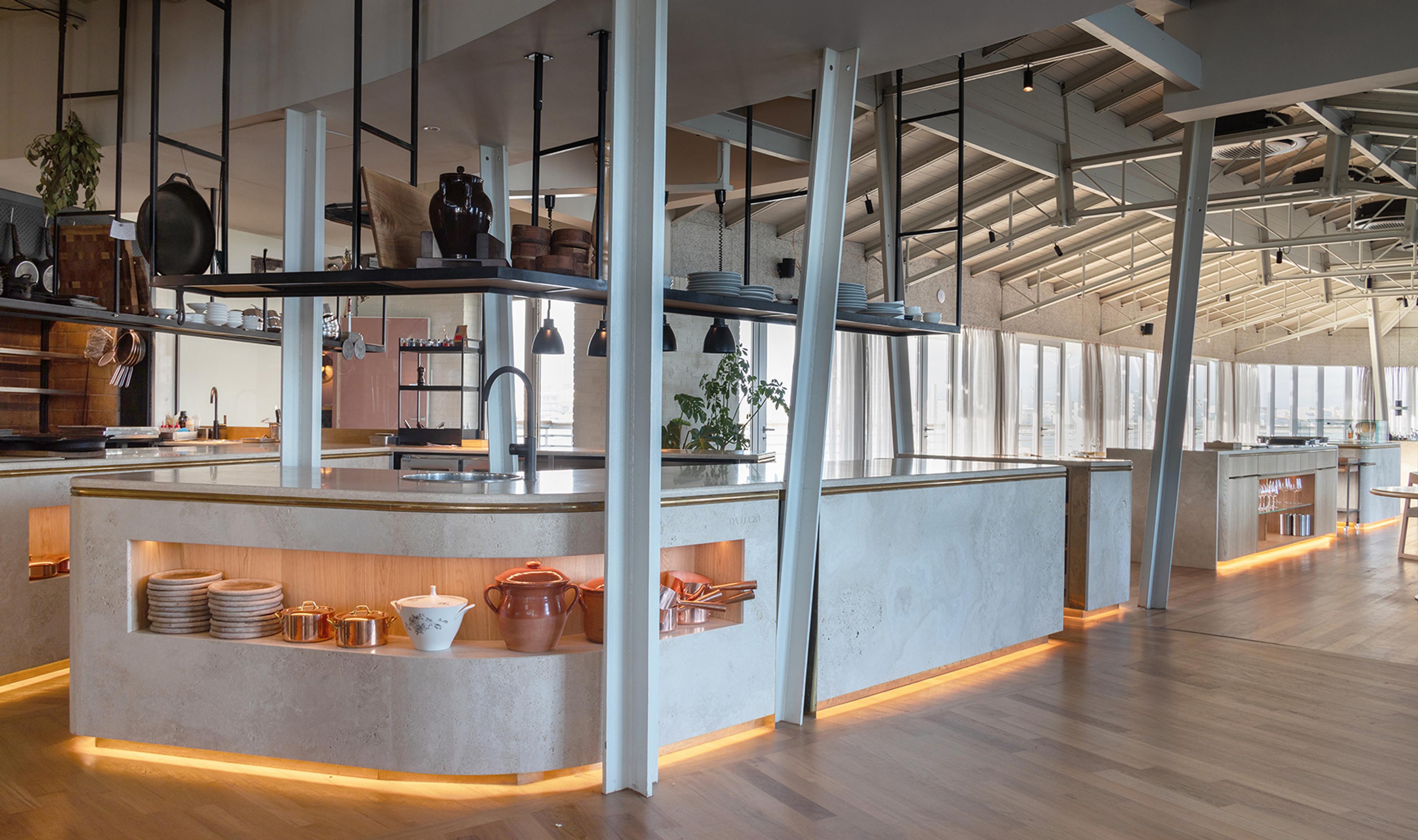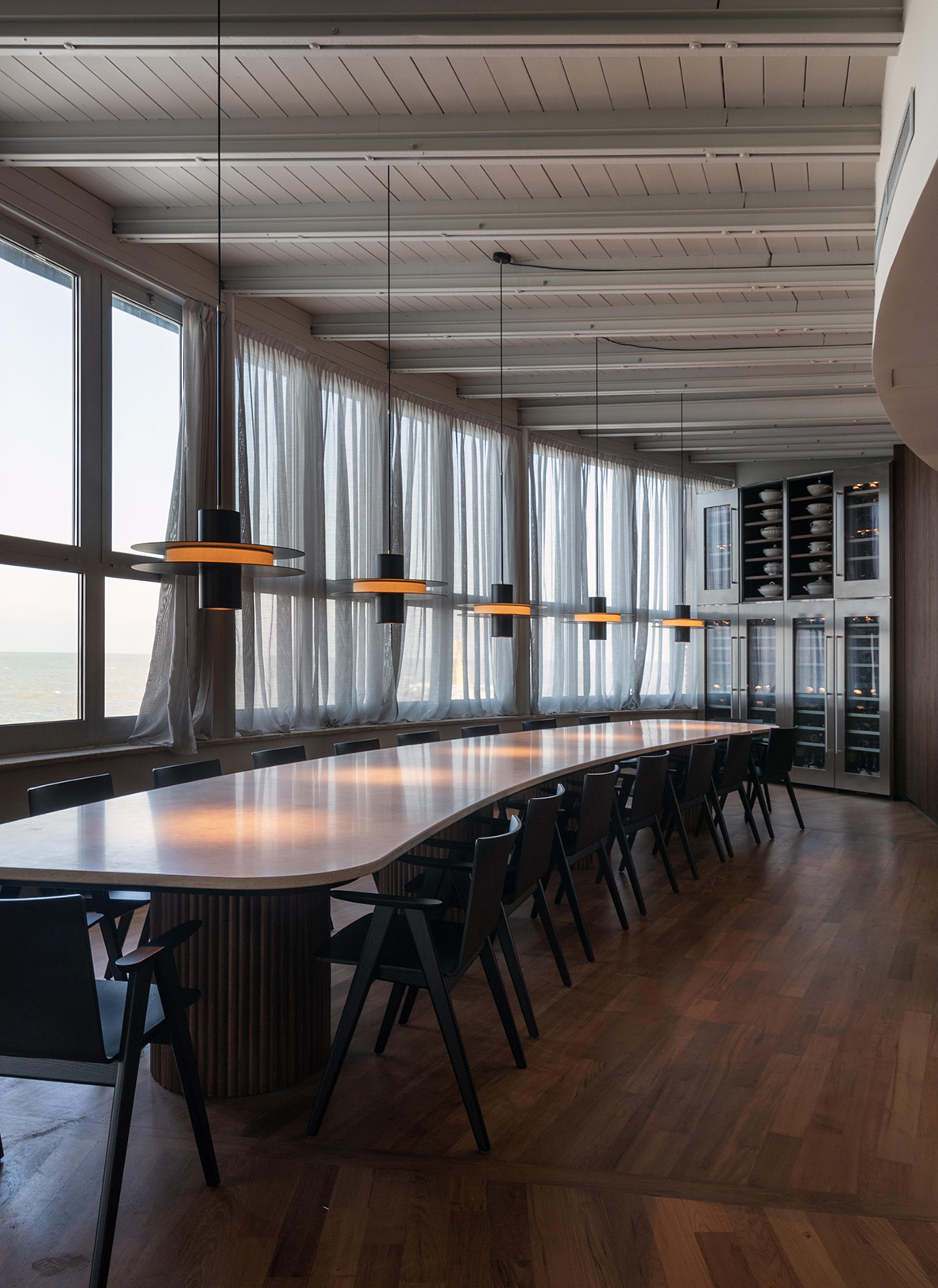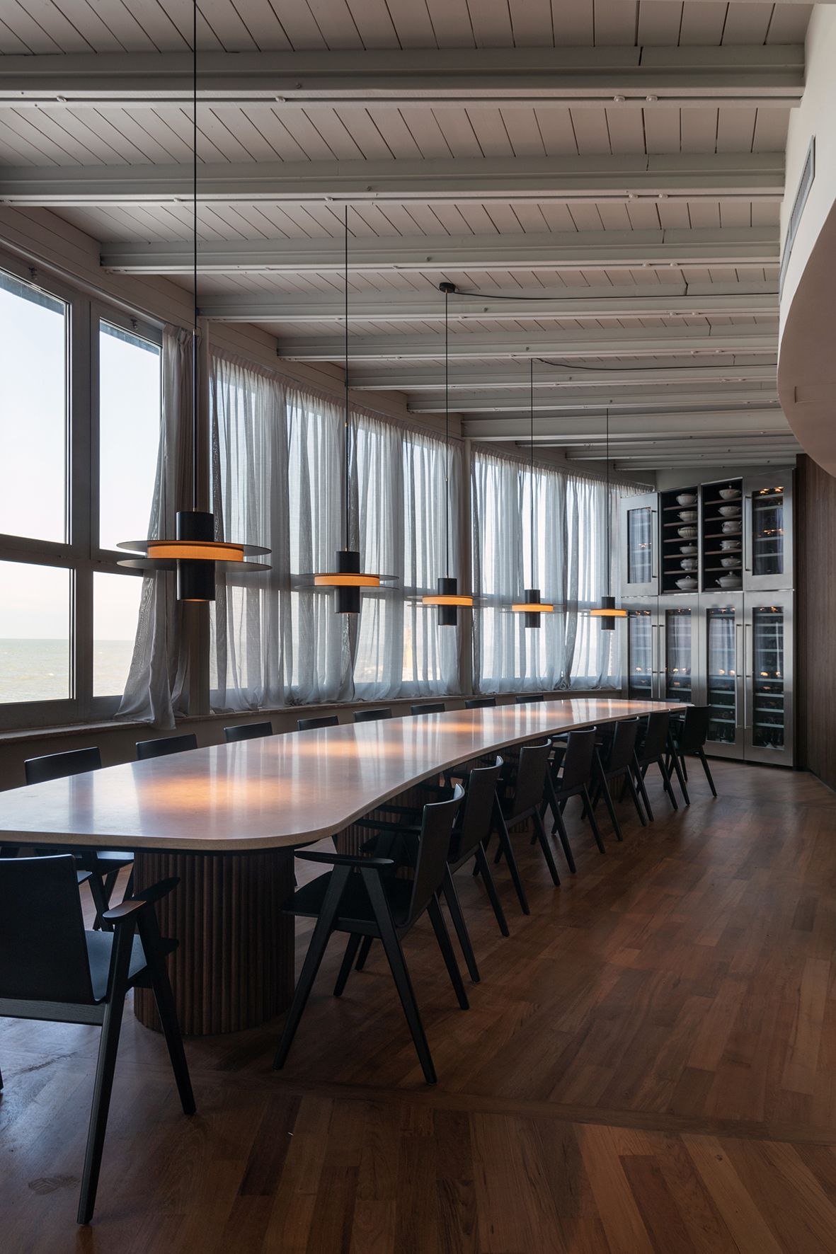 Das Licht spielt in dieser Szenografie eine entscheidende, fast unsichtbare Rolle. Das Beleuchtungsdesign - entwickelt in Zusammenarbeit mit dem italienischen Kunsthandwerker Renzo Serafini - folgt einer Philosophie der Subtraktion: Das Überflüssige wird eliminiert, um das wirklich Wichtige hervorzuheben. Weiches, diffuses Licht schafft Wärme und Intimität, während subtile, gerichtete Akzente Texturen und Formen offenbaren, ohne den Raum zu überwältigen. Das Ziel ist es, dass das Licht das Erlebnis begleitet, den Meereshorizont und die Theatralik der offenen Küche hervorhebt, ohne jemals die Szene zu stehlen. Die Leuchten von Renzo Serafini fügen sich nahtlos in die architektonische Vision von Monticelli ein und tragen zu einer Atmosphäre bei, die sich im Laufe des Tages sanft entwickelt.
