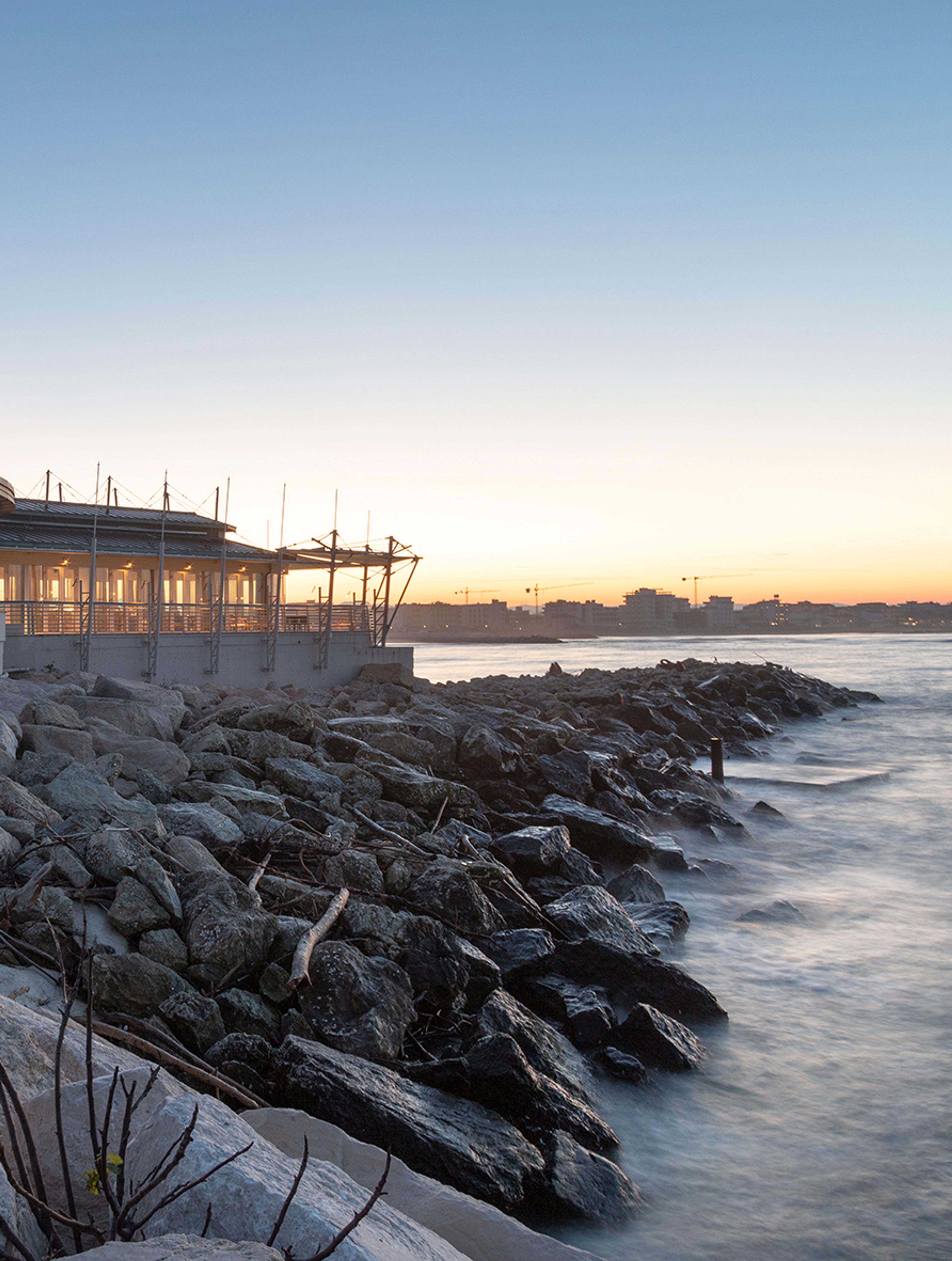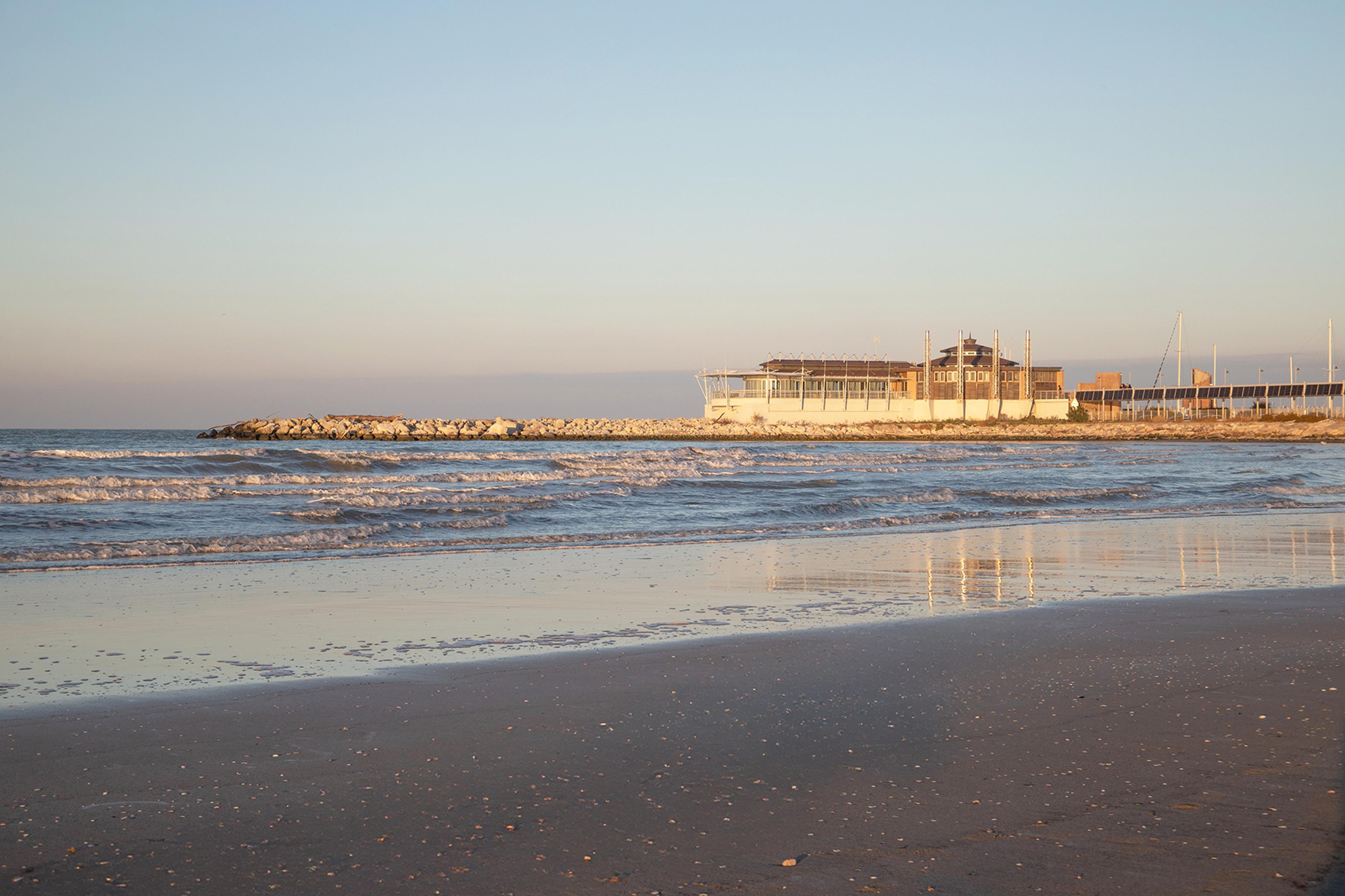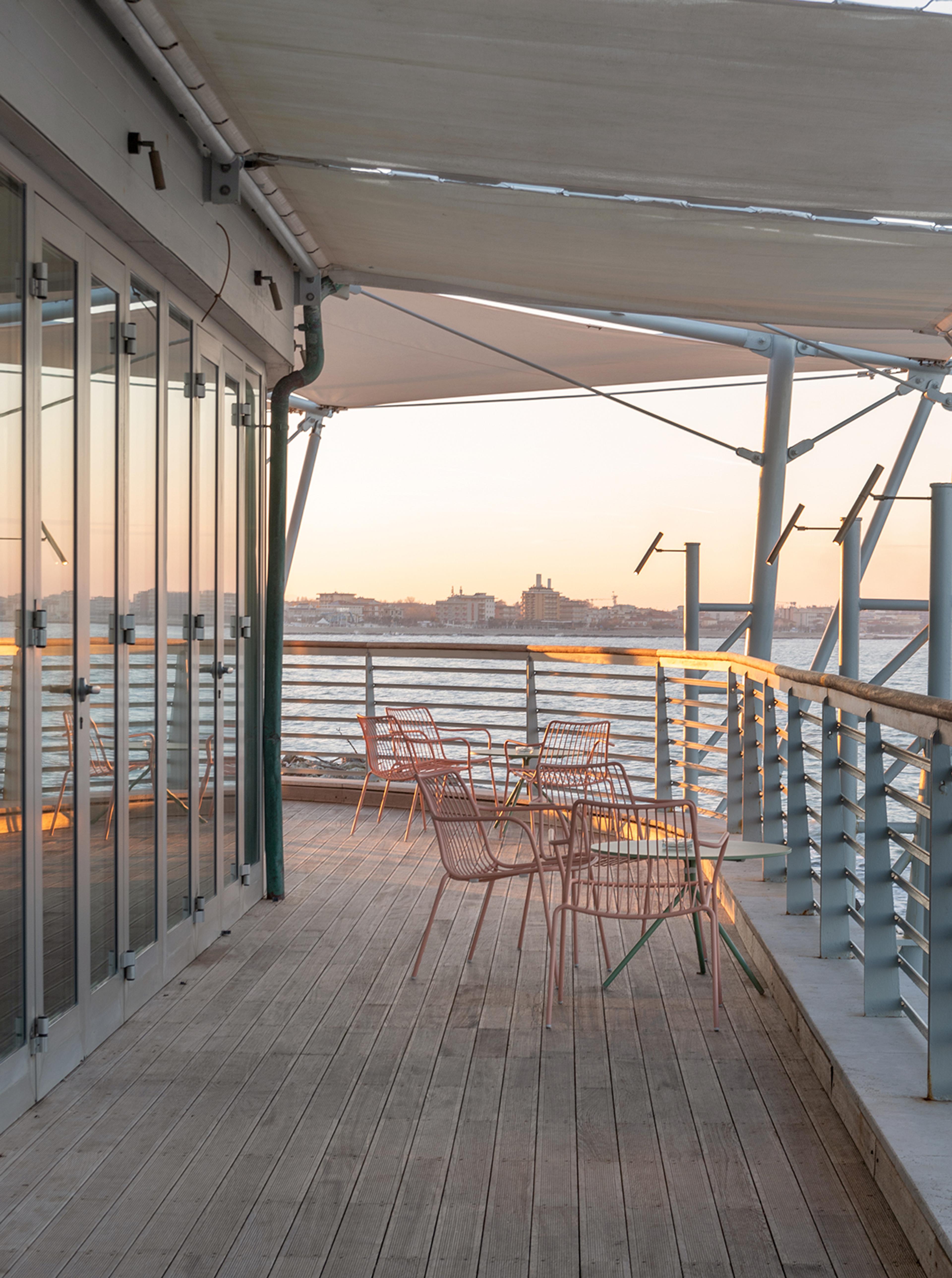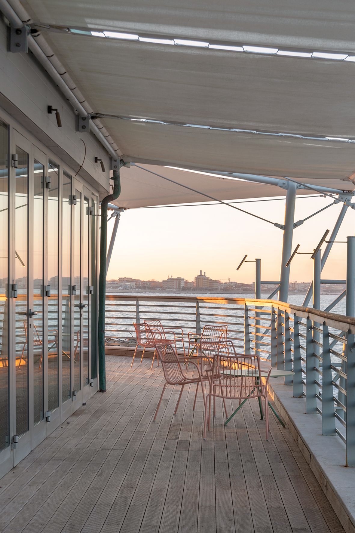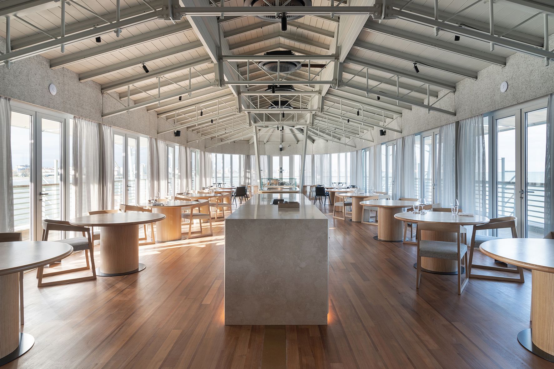 Als Küchenchef und Gründer Jacopo Ticchi das Da Lucio im September 2024 umzog, wechselte er nicht nur den Ort, sondern erfüllte sich einen Lebenstraum. Das Restaurant, das 2025 mit dem ersten Michelin-Stern ausgezeichnet wurde, befindet sich nun buchstäblich im mezzo al mare, auf einem ehemaligen Pier im Yachthafen von Rimini - einem Bauwerk, das sich über das Wasser erstreckt und die Adria auf drei Seiten umarmt.