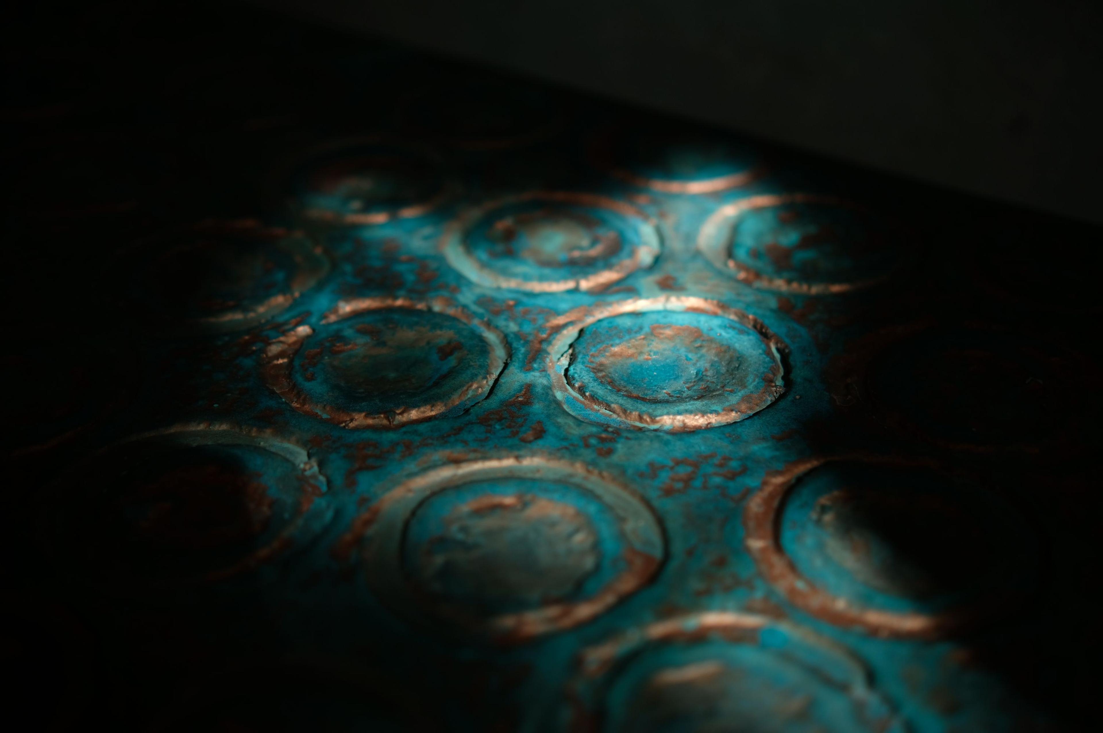 Dieser "Stuck", den ich selbst entworfen habe, ist nicht auf dem Markt erhältlich. Darauf folgen Oberflächenbehandlungen, Patina und metallische Polymere, die das endgültige Aussehen definieren. Nach der Erkundung von Gold, Kupfer und Bronze neige ich jetzt zu weniger konventionellen Patinas, mit Farbtönen von Rosa bis Blau, während ich immer noch tiefes Schwarz umarme.