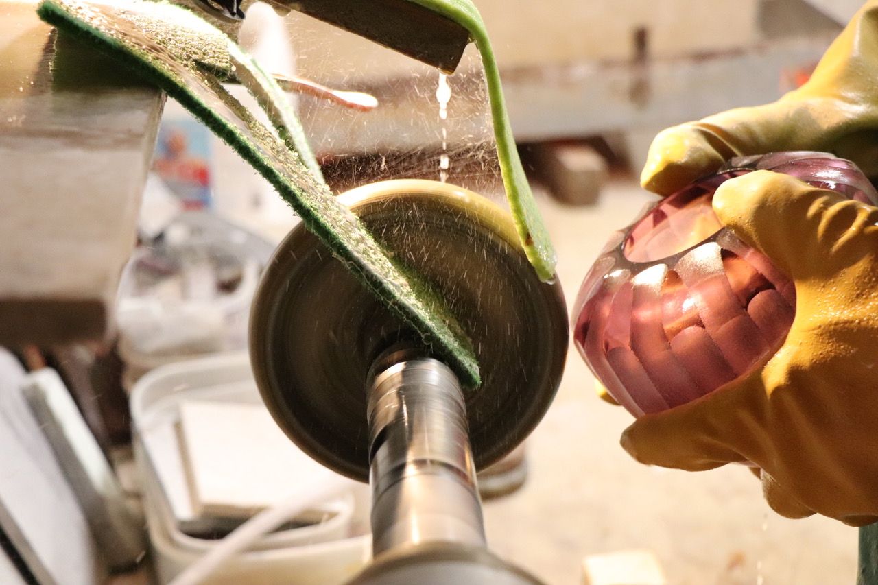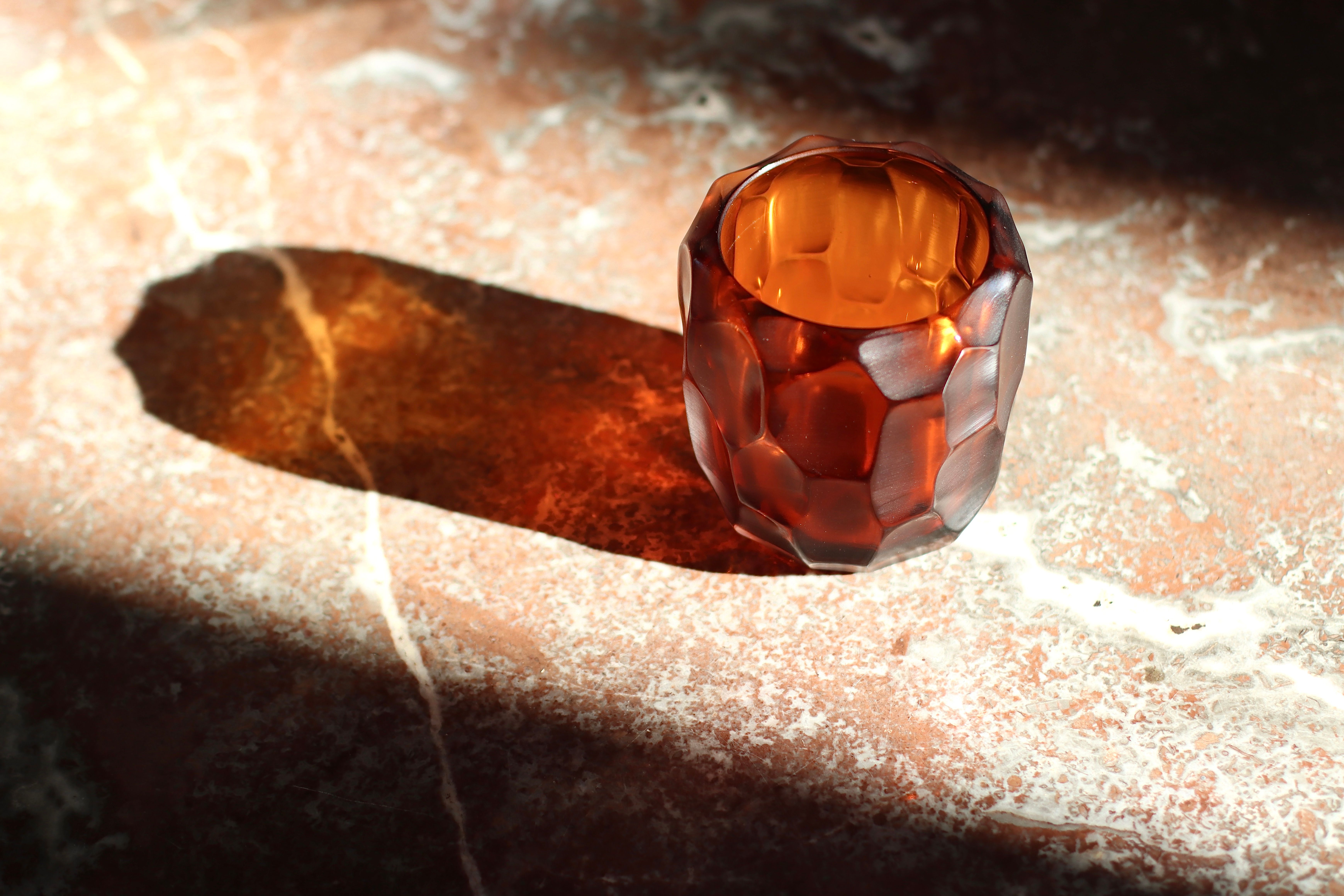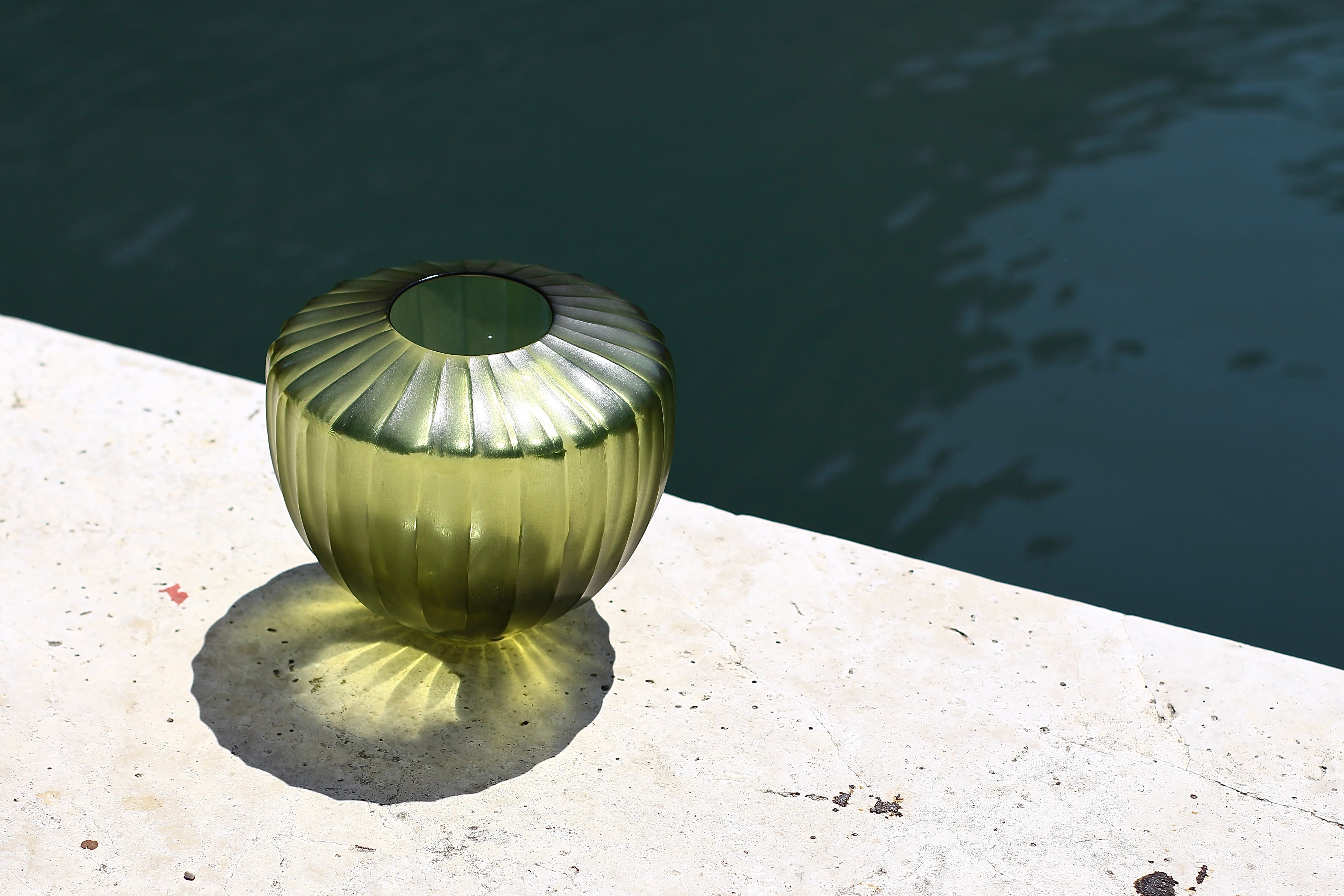 Unser Ansatz und unsere Ästhetik sind sehr persönlich und zeitgemäß, aber der kreative Prozess bleibt den traditionellen Techniken treu. Das Glas wird im Feuer geformt und in seinem glühenden Zustand von Hand geblasen. In einigen Fällen wird das Glas nach dem Abkühlen bearbeitet und mit Diamanträdern graviert, die die nun gehärtete Oberfläche formen. Die "kalte" Gravurtechnik von Murano, die einen Großteil unserer Arbeiten auszeichnet, ermöglicht es uns, Facetten zu schaffen, die Lichtreflexe erzeugen, die denen des Lichts auf dem Wasser ähneln. Der Übergang vom Feuer zum Wasser, die Kombination von heißer und kalter Arbeit, ist gerade einer der überraschendsten Aspekte dieses Materials und seines Verfahrens.
