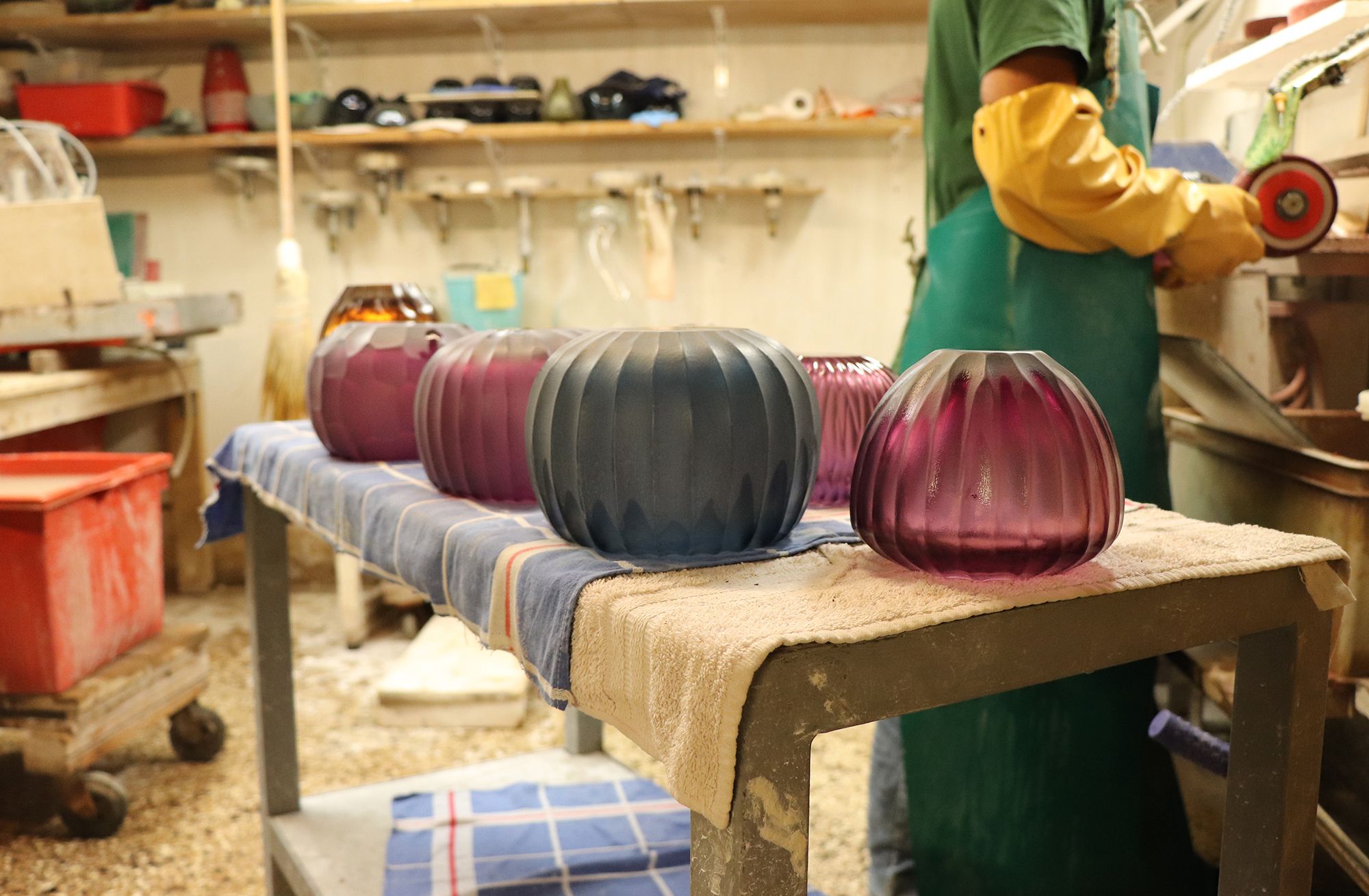 Jedes Stück unserer Kollektion ist einzigartig, unterschiedlich in Farbe, Form, Größe und Ausführung - die Möglichkeiten sind endlos! Alle Stücke zeichnen sich durch gravierte oder schillernde Oberflächen aus, die ihre Farben und Textur hervorheben und besondere Lichtreflexe erzeugen. Diese Effekte sind das Ergebnis verschiedener Prozesse, die wir nach und nach entdecken. Einige entstehen während der "fase a caldo", wenn das Glas in einem heißen Ofen geblasen und geformt wird, während es glüht. Diese Effekte werden hauptsächlich durch besondere manuelle Arbeiten und Anwendungen auf dem Glas erzielt. Andere Techniken werden angewandt, um das endgültige Aussehen zu definieren, und zwar in weiteren Schritten, wenn das Glas ausgehärtet, abgekühlt und erstarrt ist. In dieser "fase a freddo" wird die Glasoberfläche von Hand mit einer Schleifmaschine bearbeitet, um Gravuren zu erzeugen, die die Oberfläche und die Textur des Glases vollständig verändern. Ausgangspunkt dieses kreativen Prozesses ist immer ein bestimmtes Projekt, die Idee einer Form oder eines bestimmten Effekts, den man reproduzieren möchte. Diese können im Laufe des Herstellungsprozesses manchmal angepasst werden, wobei Raum für Improvisationen, Tests und Experimente bleibt, die auch aus dem ständigen Austausch zwischen dem Meister und seinen Handwerkern am Ofen resultieren. Das Endergebnis birgt immer ein Überraschungsmoment, das jedes einzelne Stück zu einem Unikat macht. Auch das ist Teil der Magie des Glases.