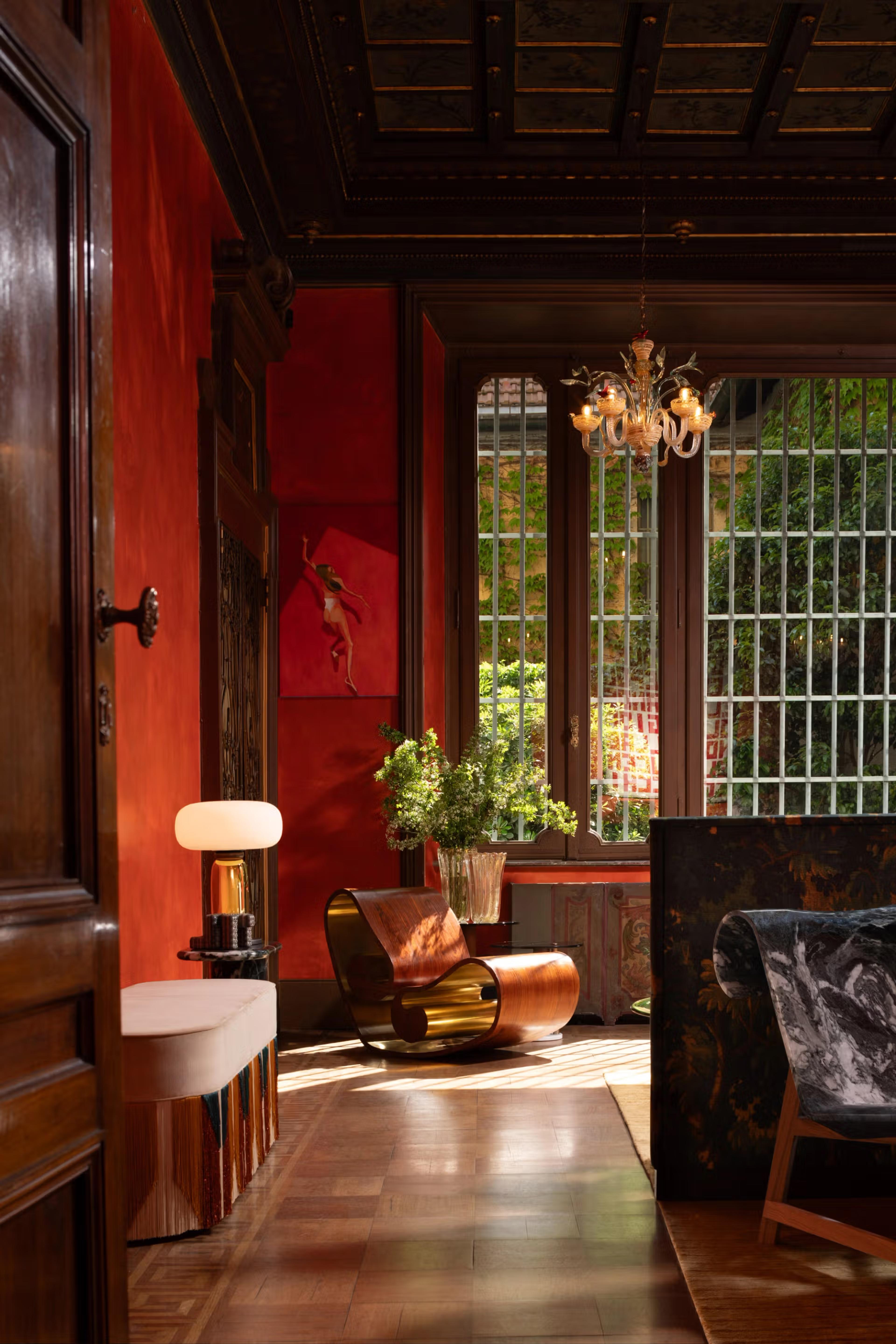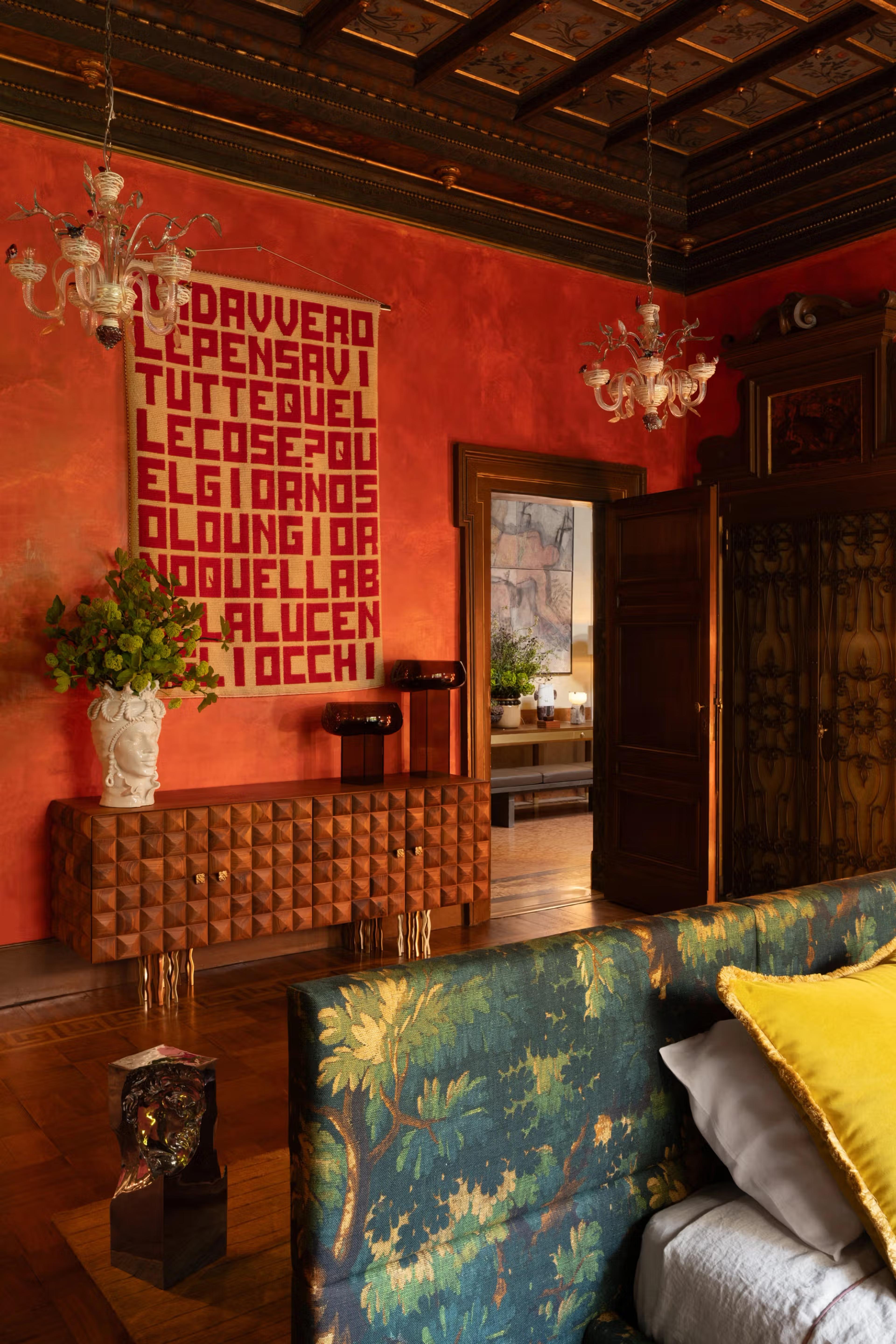 The bedroom of L’Appartamento, curated by Tamara Feldman Design, blends the designer’s Mexican heritage with the essence of Residenza Vignale. The room’s saturated palette, enriched by terracotta and wood details, evokes the atmosphere of a Mexican hacienda. The aim was to create a nature-inspired interior with botanical plants, wood, and stone, combining Italian design with Mexican charm. The colors of the foliage visible through the large window—yellow, green, and golden tones—complement the terracotta walls. This concept is best expressed in the Giopagani bed, upholstered in a fabric depicting a dense forest.