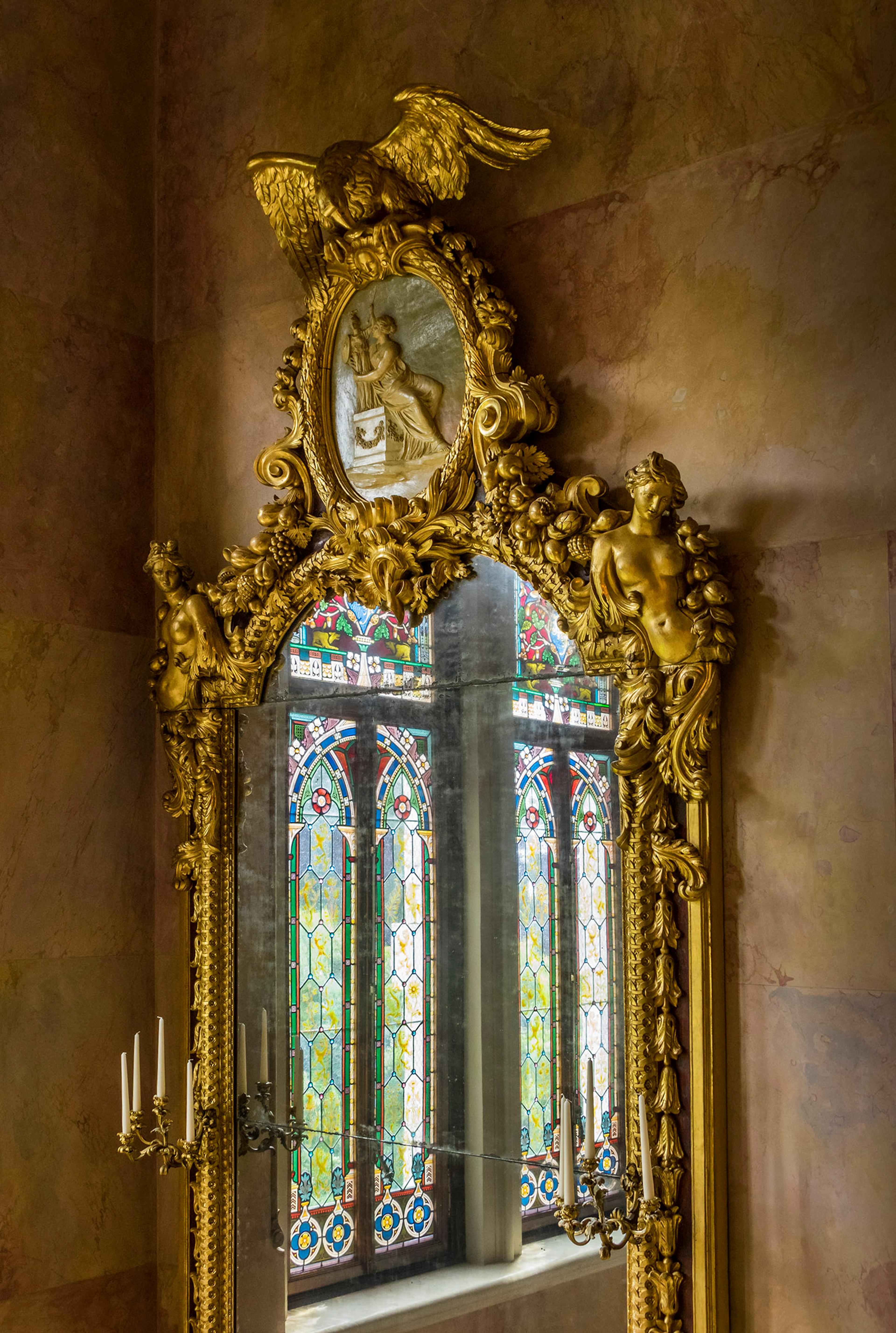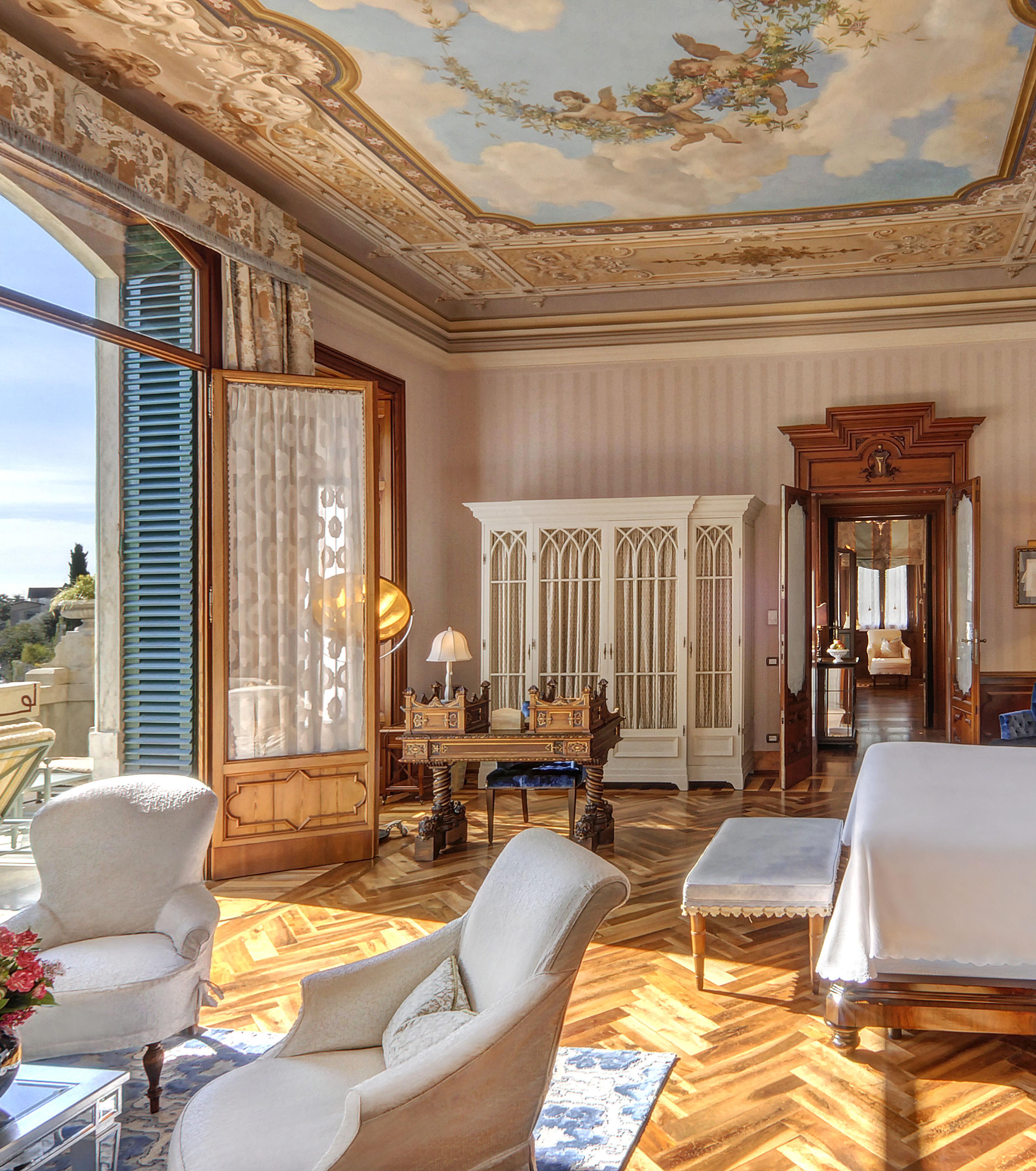 Furnishings include handcrafted Venetian glass lamps, silver-framed photographs, and desks outfitted with hand-printed Venetian paper, while bathrooms are fitted with heated marble floors, nickel-plated fixtures from London, and deep soaking French porcelain tubs. Even the draperies are artful: a delicate embroidered sheer recreated by Rubelli of Venice, inspired by an original fabric found within the villa.