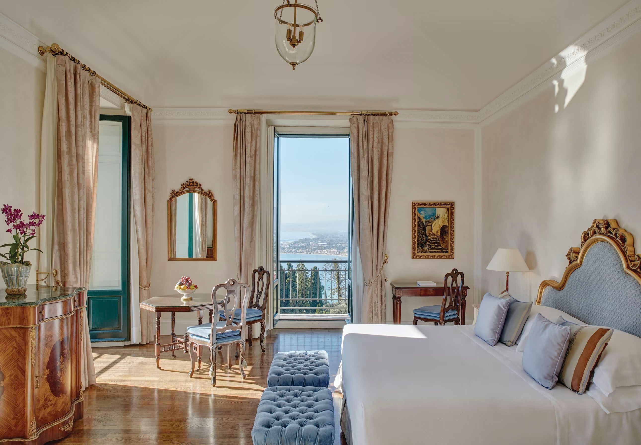 The suites have their terraces and balconies, where the guest can admire the stunning panorama and enjoy the gentle sea breeze. Ancient paintings and precious vintage mirrors adorn the walls, recalling the hotel’s glorious past.
