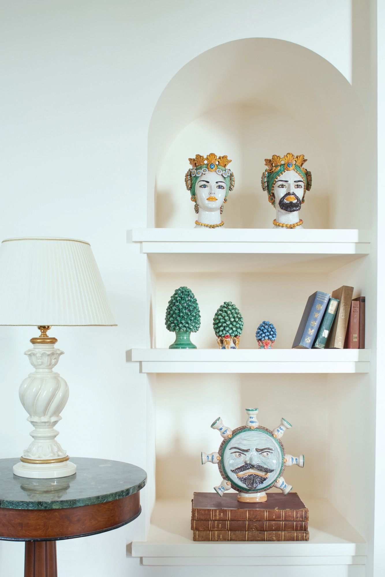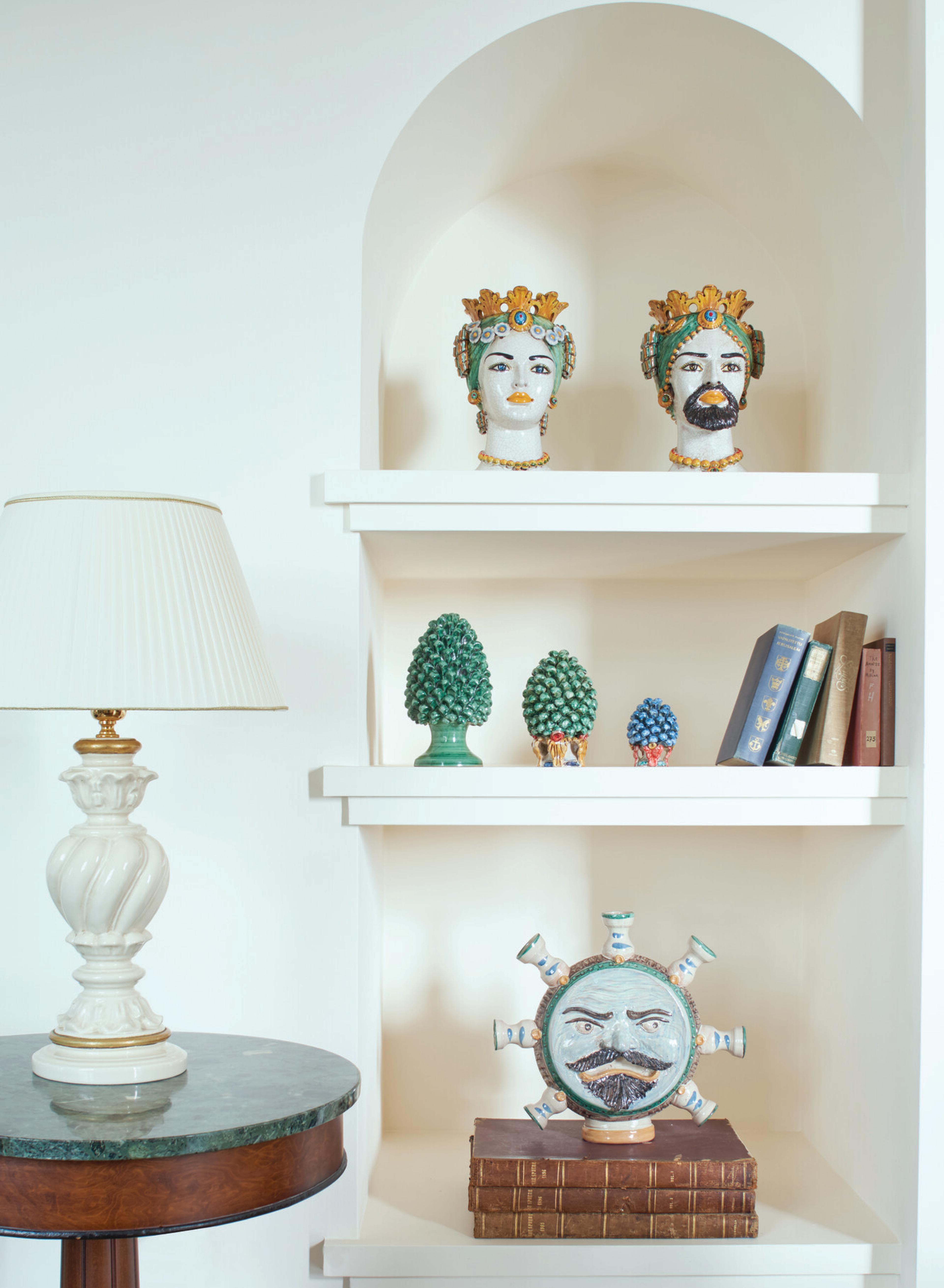 Each room features a tranquil pastel palette that fits the beautiful coastal location echoing the colors of the sea and the shades of the trees. Classic elegant furniture and lush materials populate the rooms, filling them with an unmistakable old-world allure. Inside, the decoration is inspired by Sicilian tradition, with legendary Moro heads and typical ceramics with colorful patterns.