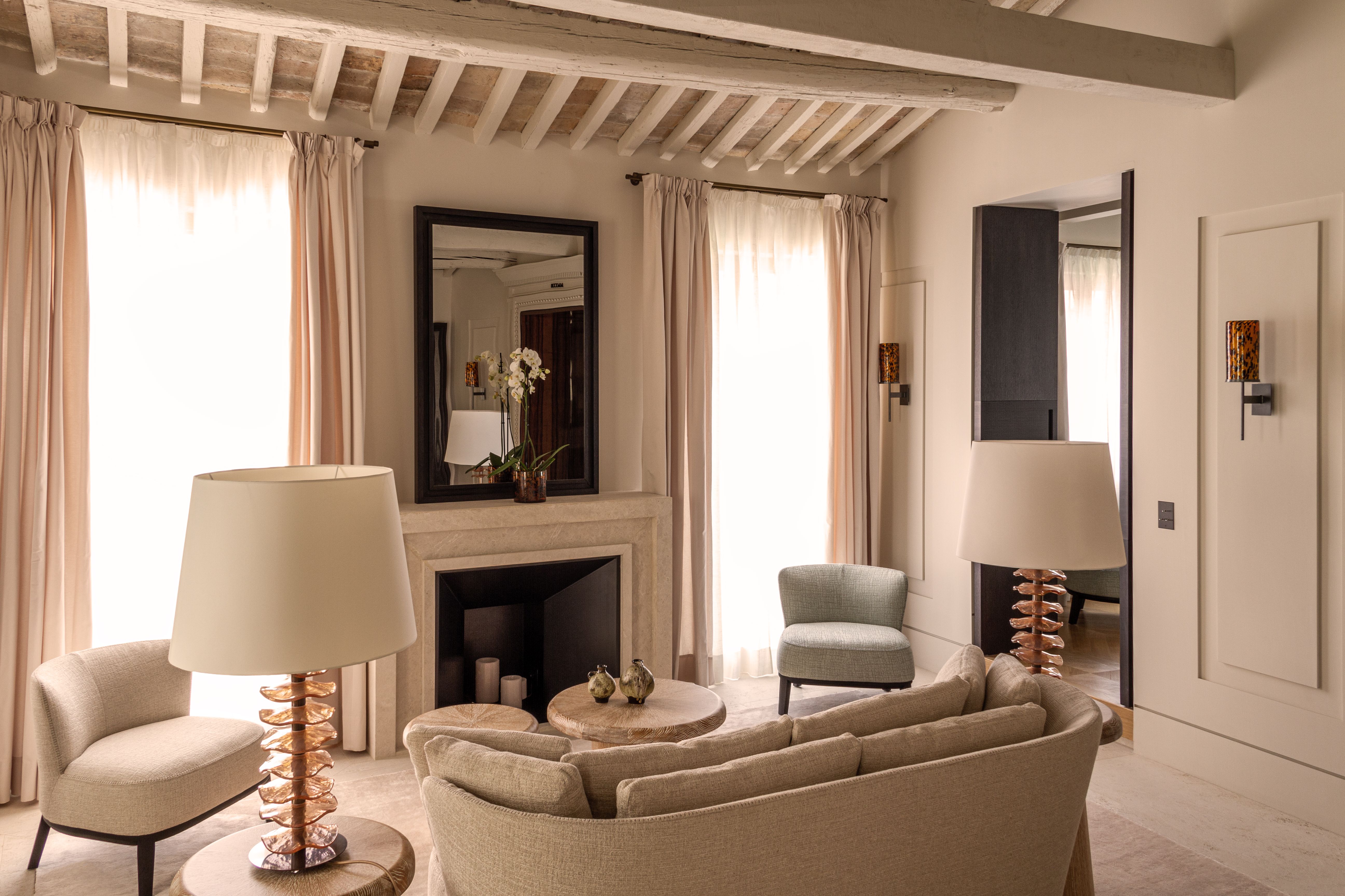 Every detail, from the natural oak and walnut finishes to the refined linen blankets, is part of a greater vision that reflects the essence of the lagoon while honoring its boundless heritage and beauty. Murano glass pieces were an inseparable part of this project. Renowned for its centuries-old tradition of mouth-blown glass, the island of Murano, with its unparalleled expertise admired worldwide, takes center stage at Palazzo Cristo, showcased through a bespoke collection of lamps, wall lights, and vases, each designed with care by Anna and Frédéric.
