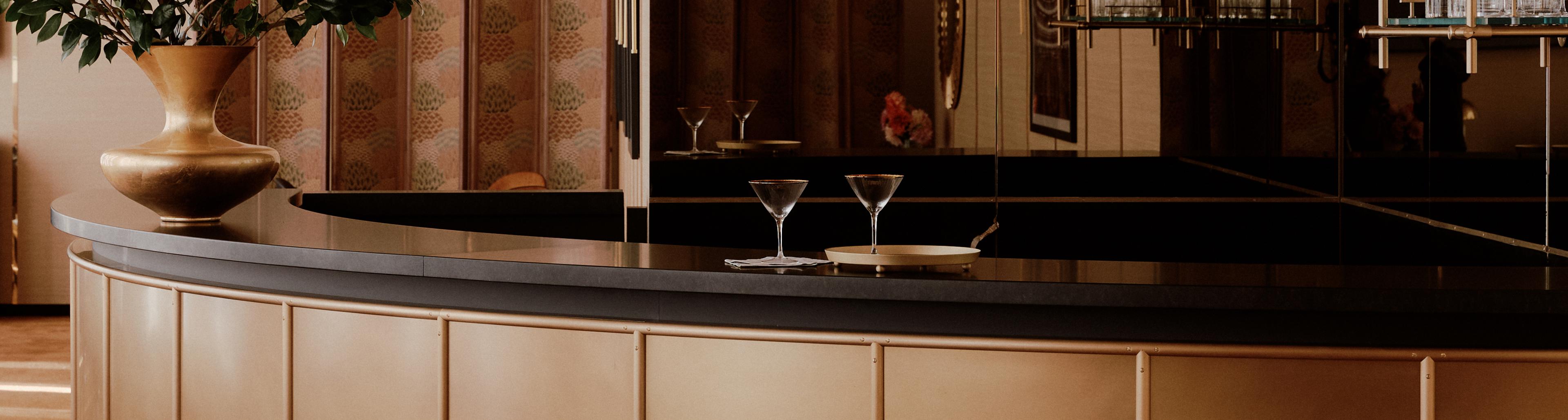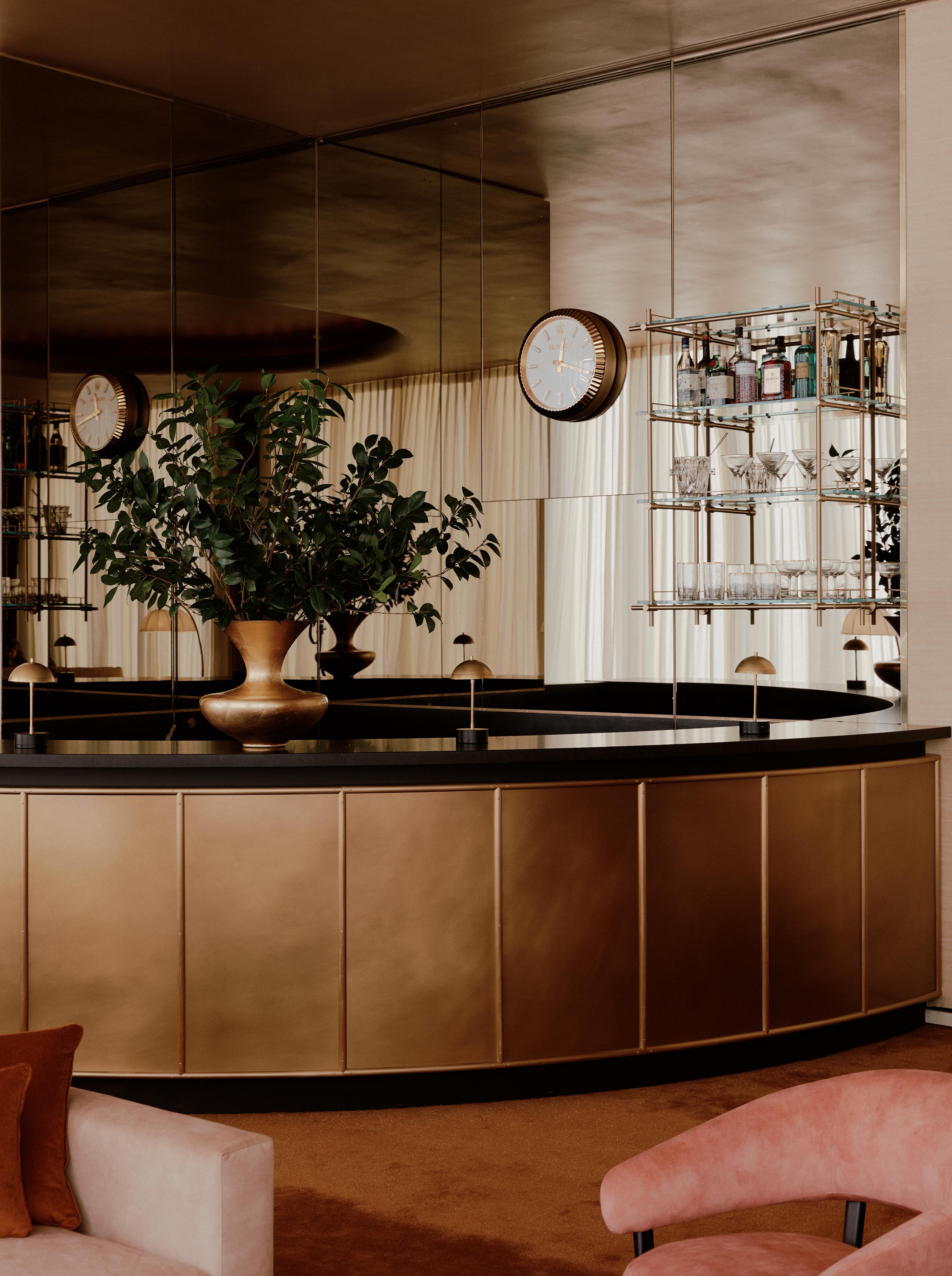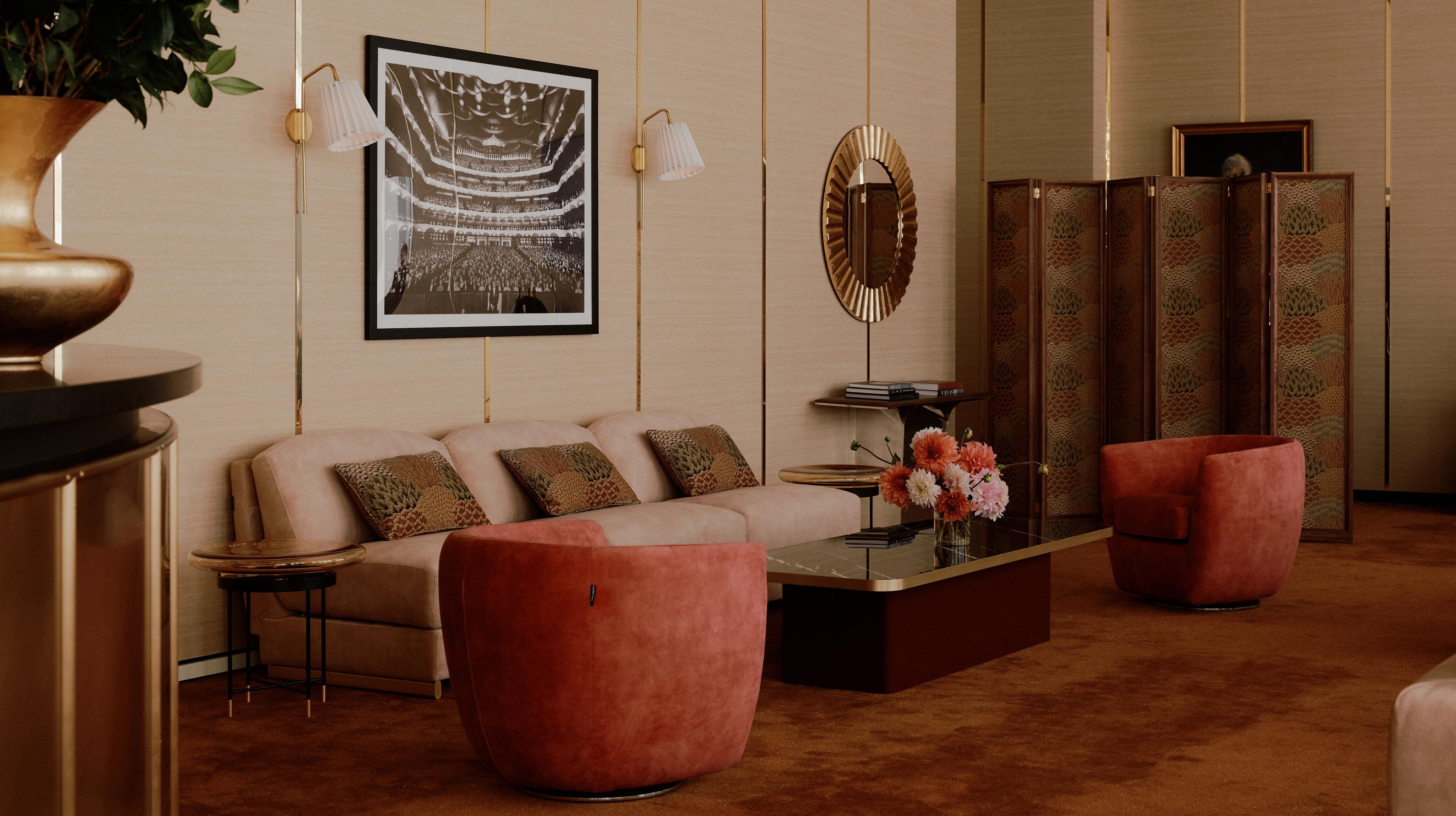 The new project revolves around the idea of a sophisticated yet warm and welcoming interior, drawing inspiration from the carefully documented lounge’s history and reinterpreting the glory of the Opera House. The lounge’s color palette is composed by blush, red and camel nuances, complementing the gold and travertine details of the main lobby with its iconic staircase.