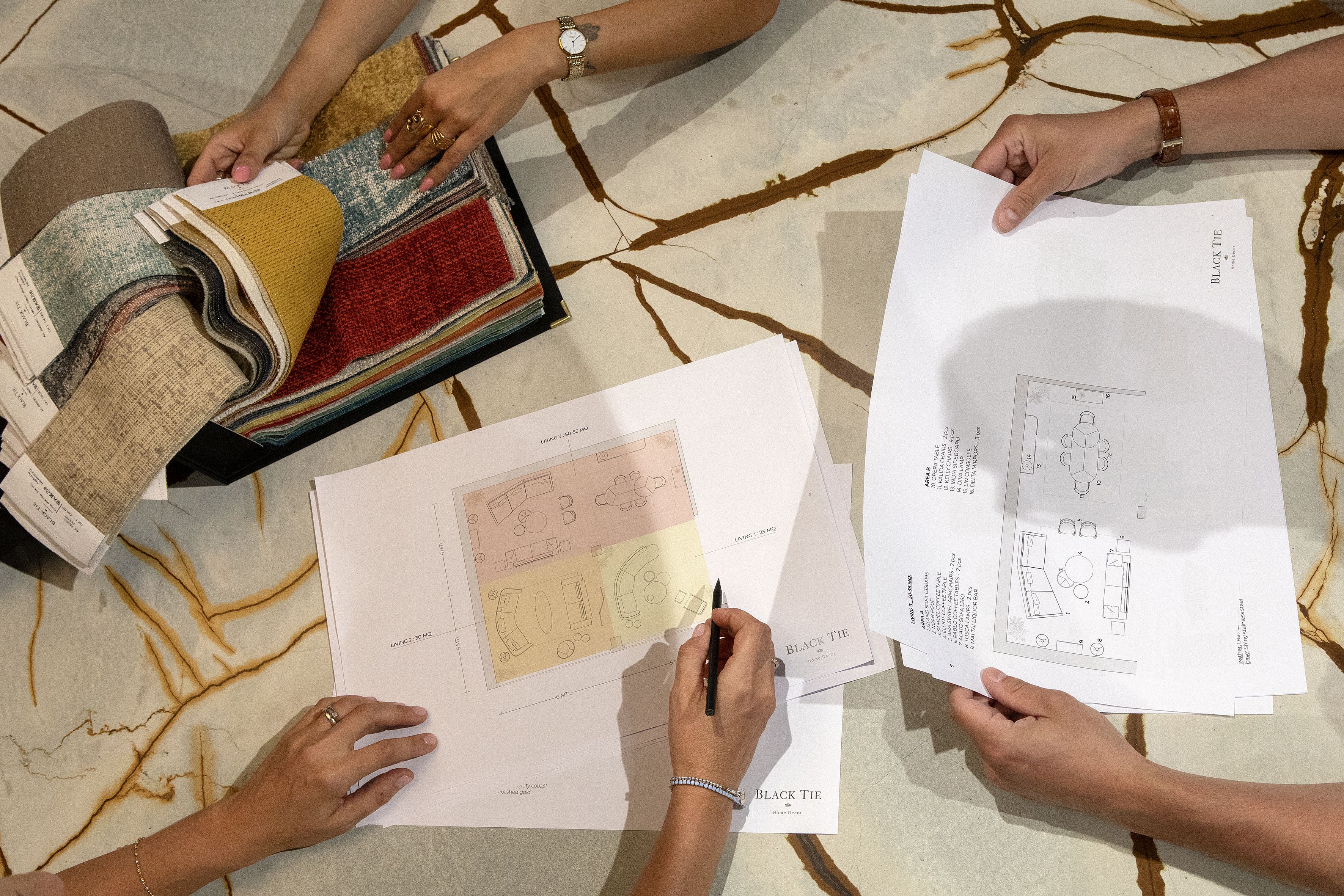 This is the starting point of all our projects: a table and a team sitting around it. Together, we imagine the space, touch the fabrics, feel the sensations, and ideas take shape. Time and again ideas change. Sometimes they are put aside and later picked up again. They are rearranged. They are fully embraced. That’s how a project is born, amongst creativity, logic, and meticulous attention to detail. That is how all unique, one-of-a-kind Black Tie pieces come into being.