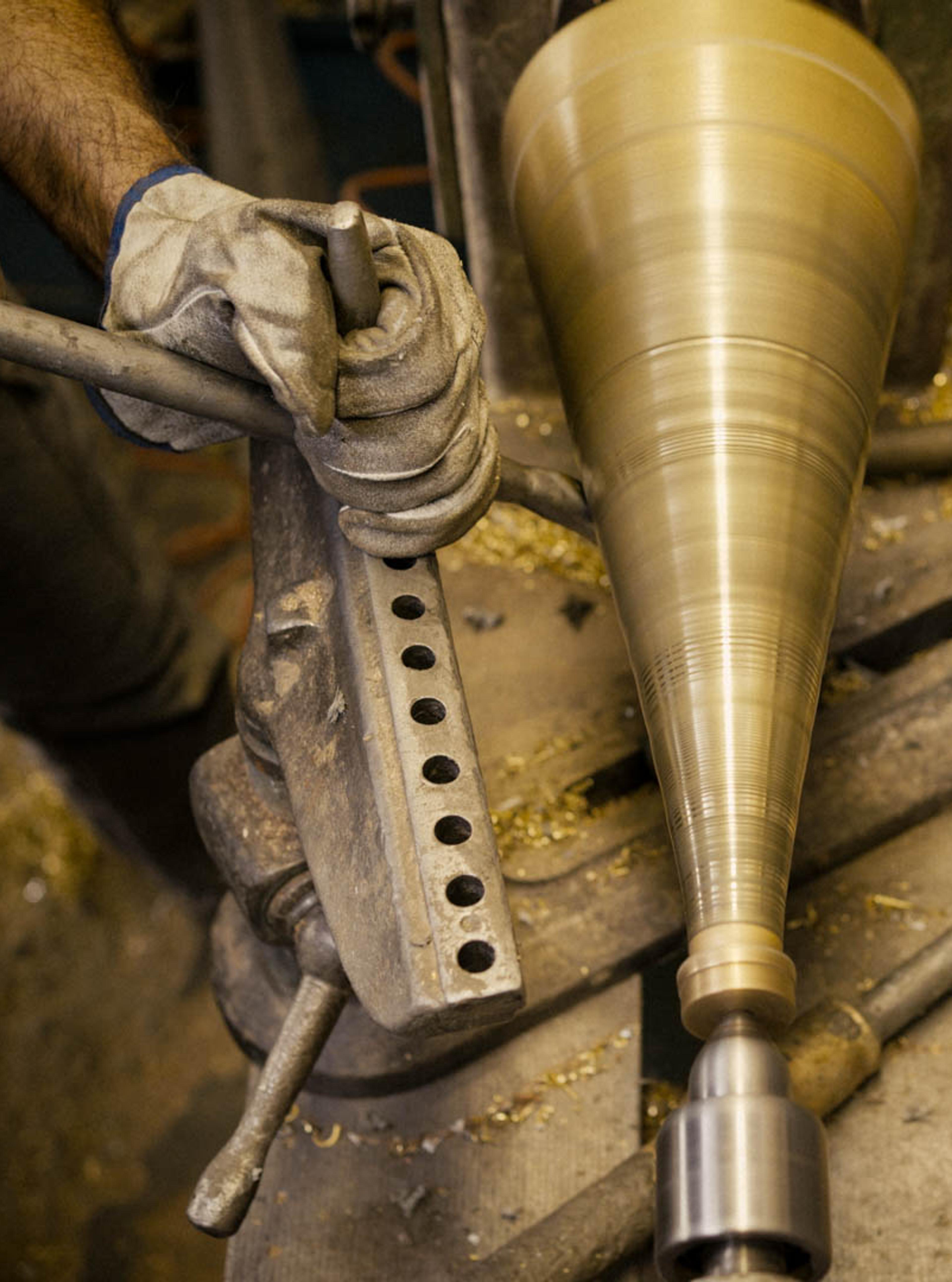 A classic example of our process is the ‘Cosmos’ lamp, a chandelier inspired by a 1950s design. The whole process begins with selecting materials, in this case alabaster slabs with a distinctive translucence. We are guided by the stone’s unique characteristics, such as veining and natural irregularities, which become an integral part of the design. Alabaster, with its ability to diffuse a soft, warm light, is combined with metal, particularly bronze or satin-finished brass, to create a refined contrast between the materiality of stone and the precision of metal.