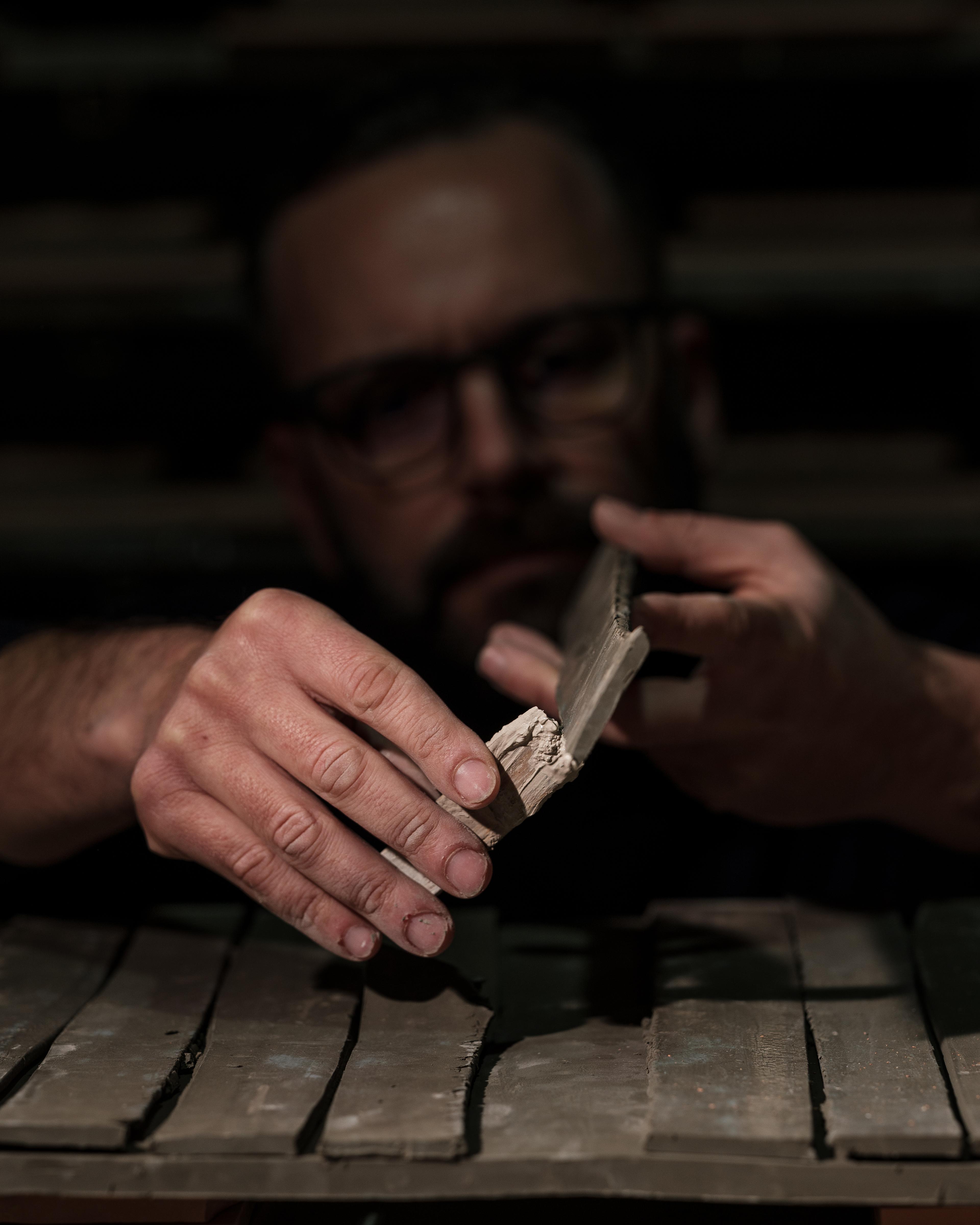 Most of his pieces are made with rudimentary techniques and equipment, which are sometimes even found among makeshift items or elements of nature: pieces of wood to forge the various types of clay used, fabrics that he uses to imprint textures with, pieces of metal to cut with imperfect precision the sheets of material before finally shaping them with his hands.