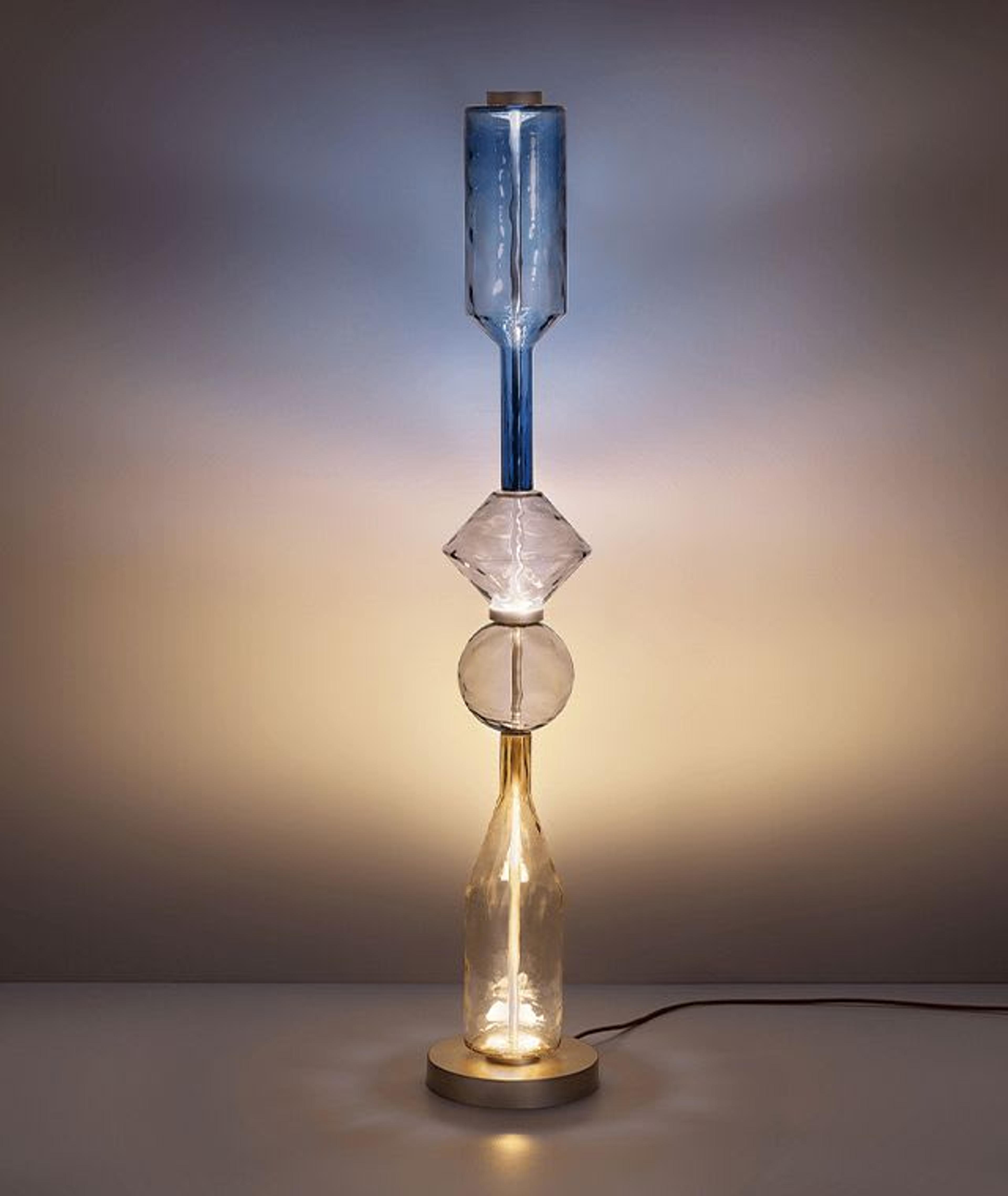 A mouth-blown of Murano glass lamp, the distinctive body features different geometric shapes stacked on each other: a smoky bottle and sphere, a tobacco diamond, and a cobalt blue bottle mounted upside-down to hold the light source. This floor lamp stands on a matte brass-finished metal base, with circular metal spacers in coordinating finish for a dynamic and texturally rich effect.