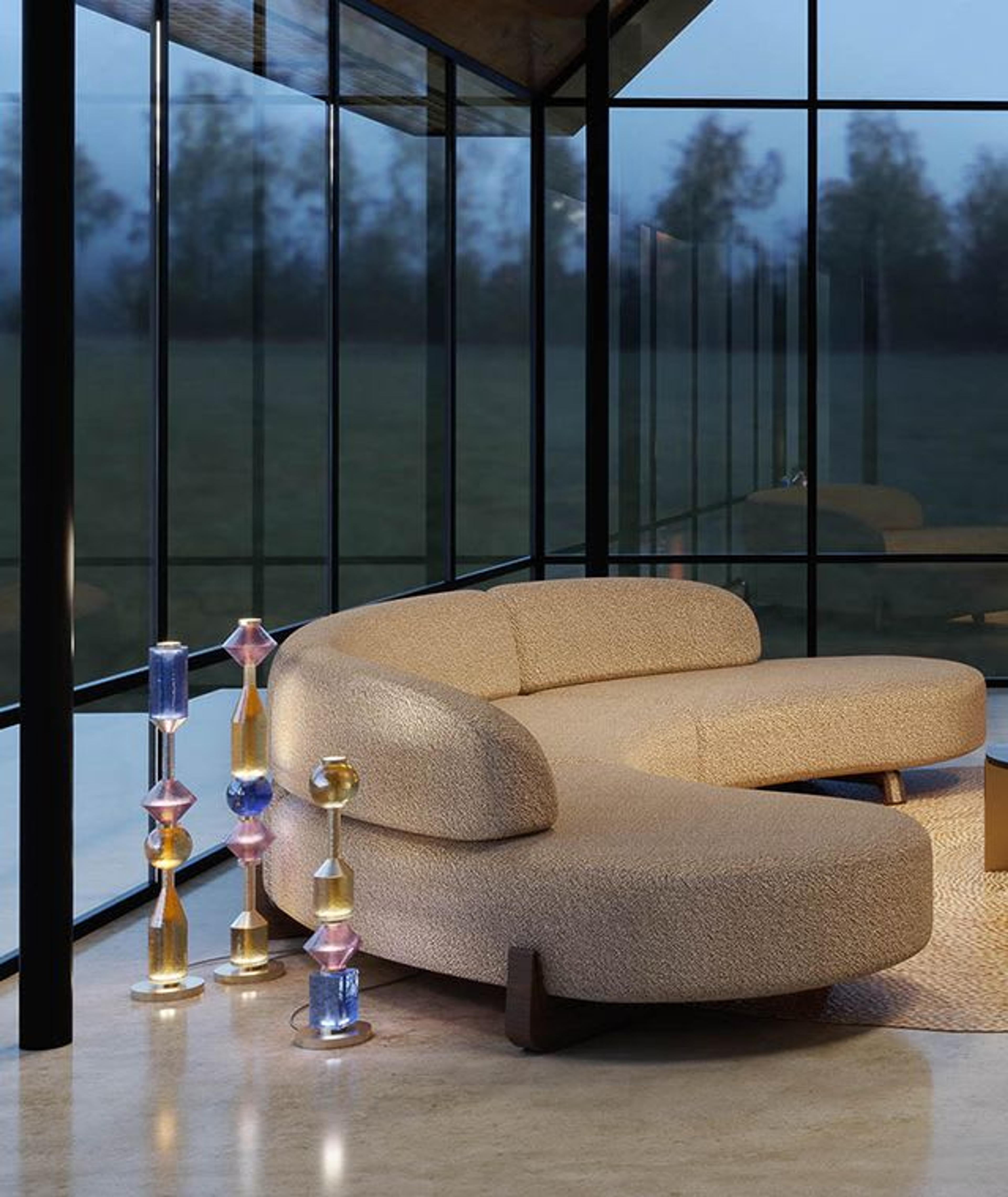 This unconventional armchair offers a wraparound seating experience in an eye-catching voluminous and geometric shape that will make a statement in a contemporary interior. The two-dimensional structure made of beechwood pentagons and hexagons develops into a three-dimensional shape with crystal-like inserts in certified vegetable natural oil and officinal herbs and natural fibers covered in gray fabric.