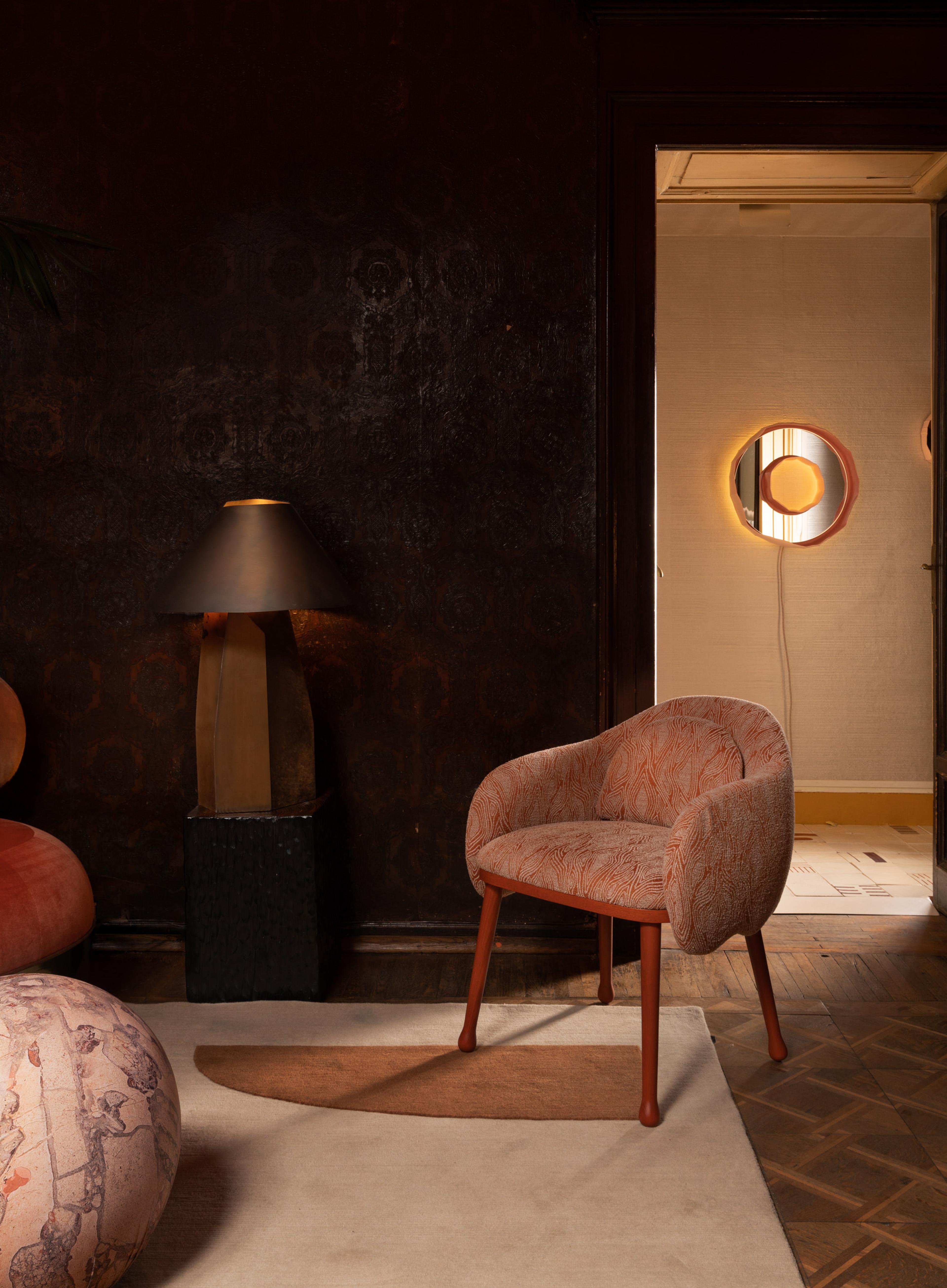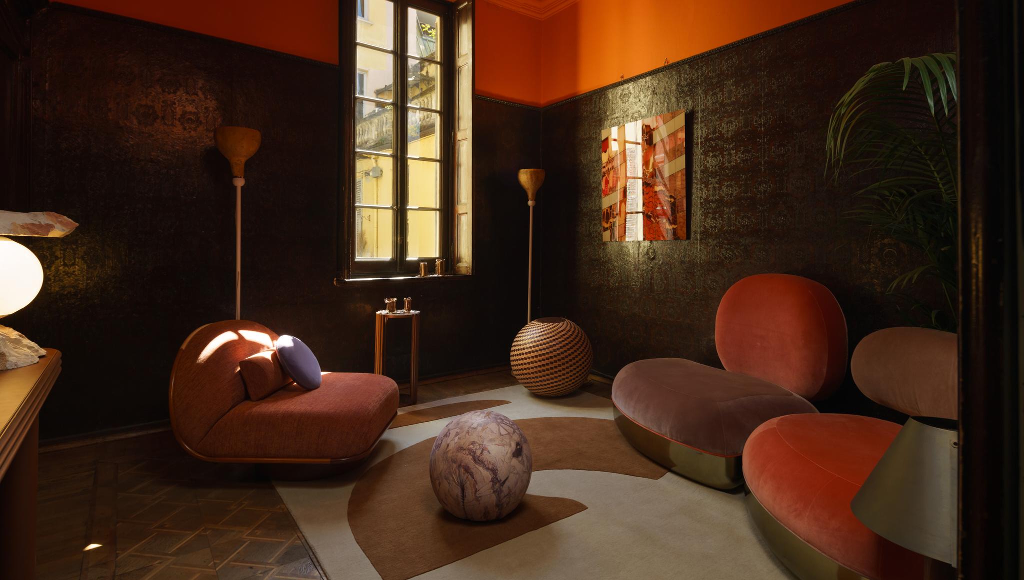 For L’Appartamento, Anne-Sophie Pailleret wanted to create a mix and contrast of sweet warm colors all over and graphic patterns, but also between round comfortable furniture s-shaped and surprising or contrasting creations for the lighting, and objects or wall decoration. For the studio, Anne-Sophie was inspired by the instinctive reaction she had when she first saw the apartment, and then by the possibility to style it with Artemest pieces. She chose round and futurist furniture’s shapes, avant-garde and surprising such as the Thumb Asymmetrical Rust Arcmhair by Fratelli Boffi and the Seychelles Morning Rouge by Tapis Rouge. To create the right atmosphere, Anne Sophie picked her favorite range of warm colors. Anne-Sophie’s style is chic, lively, but also tailor-made, with lots of details that can be joyful, surprising and fresh - never museum-like.
