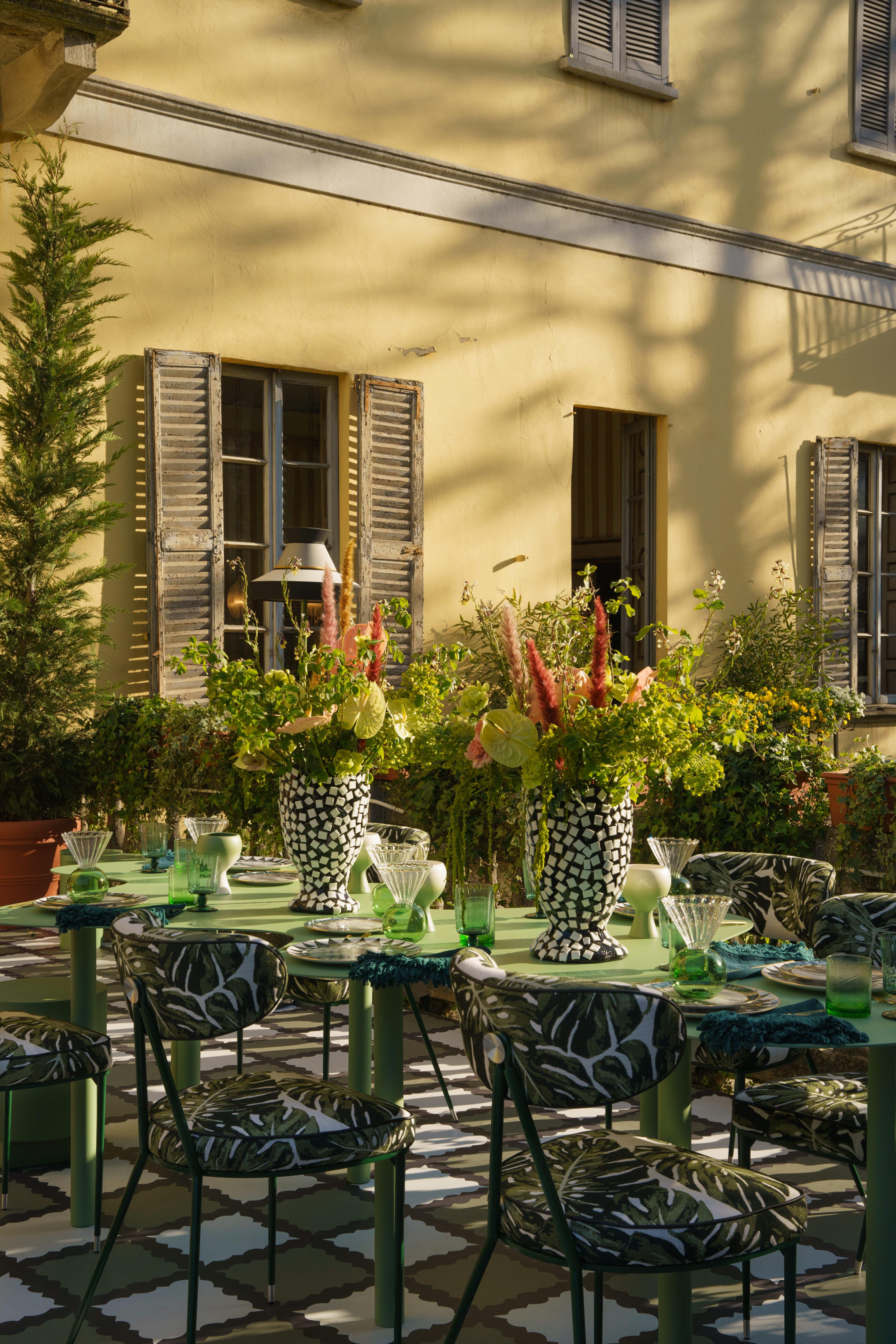 The terrace showcases elements that are strongly integrated in MONIOMI Design aesthetic and design language, bringing in color saturation and layered patterns that are a representation of the studio’s vibrant Hispanic roots embedded within Miami's culture. For L’Appartamento terrace MONIOMI has brought Miami to Italy, executing a tropical vibe with a fine layer of Italian craftsmanship, furniture and quality. That marriage is really the perfect fit for L'Appartamento exterior space.