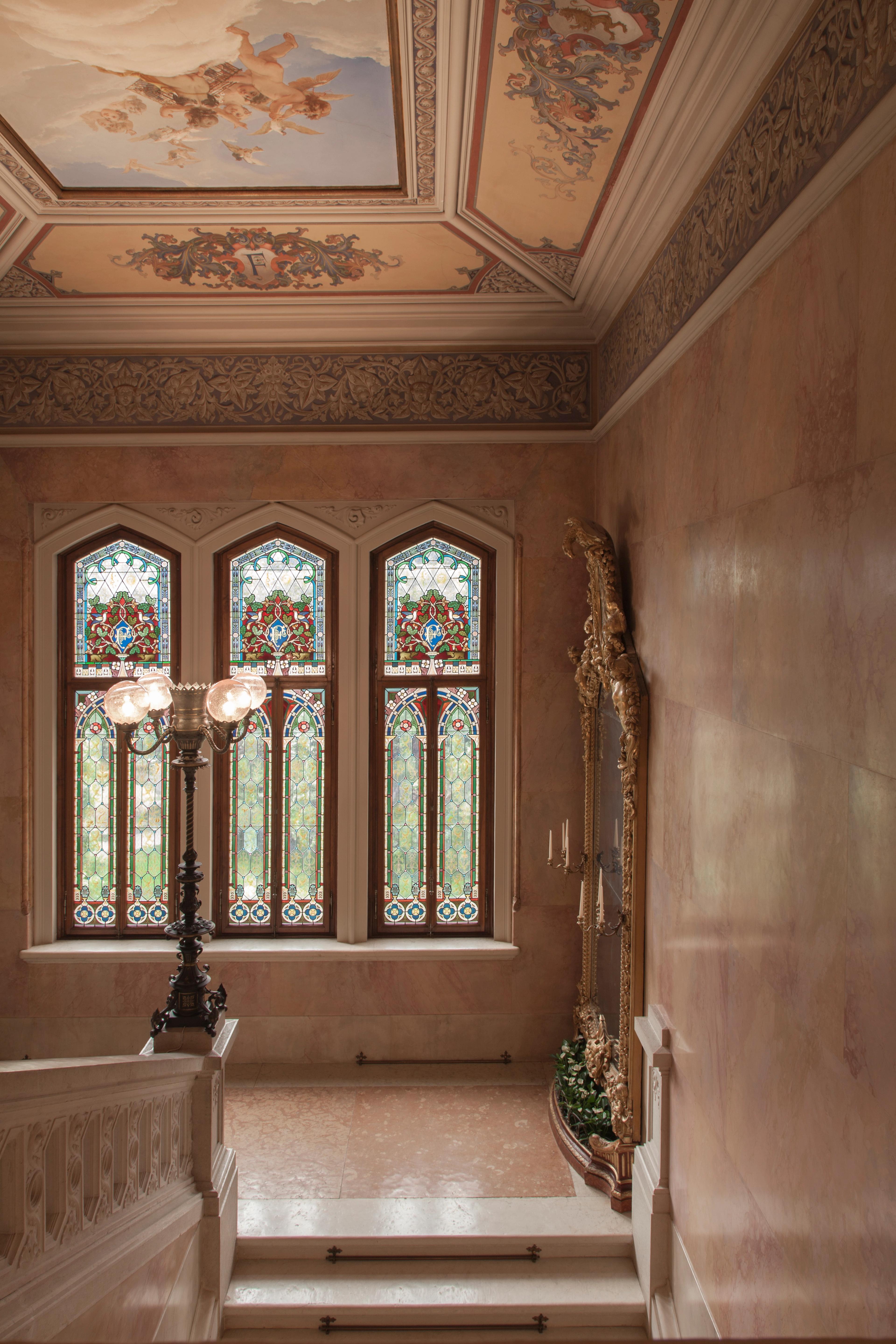 Furnishings include handcrafted Venetian glass lamps, silver-framed photographs, and desks outfitted with hand-printed Venetian paper, while bathrooms are fitted with heated marble floors, nickel-plated fixtures from London, and deep soaking French porcelain tubs. Even the draperies are artful: a delicate embroidered sheer recreated by Rubelli of Venice, inspired by an original fabric found within the villa.