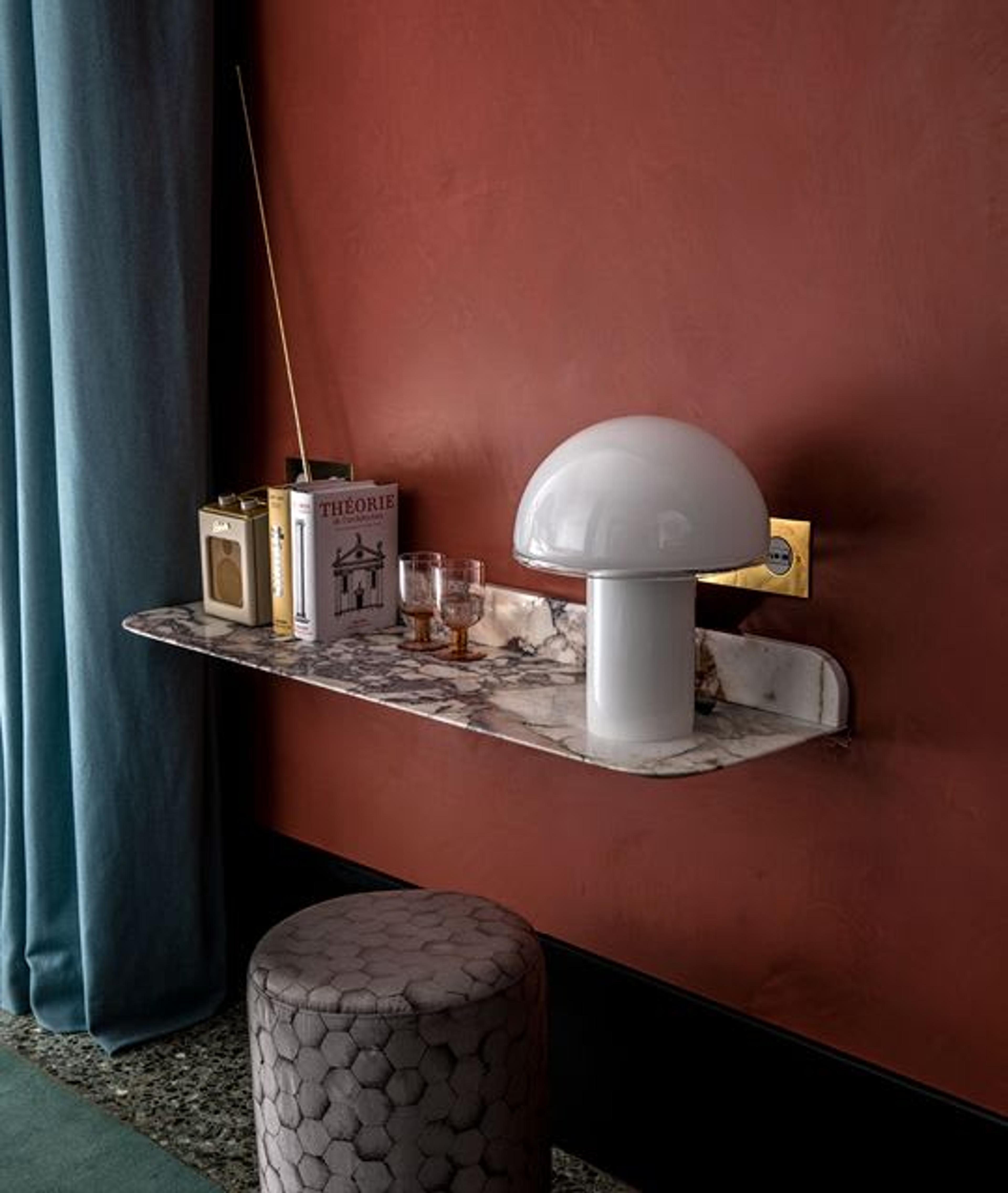 Inside the beautiful Palazzo Experimental, there are 32 stylish rooms and suites that pay a tribute to the classic Italian elements. The ’80s Memphis inspired color palette of deep red, terra cotta, sky blue, pale yellow, silvery grey and cream radiate the interiors of the hotel. Venetian Glass Lamps from Luciano Vistosi, Breccia Capraia Marble topped tables, silk-screened aluminum nightstands, all come together to form a strong identity.