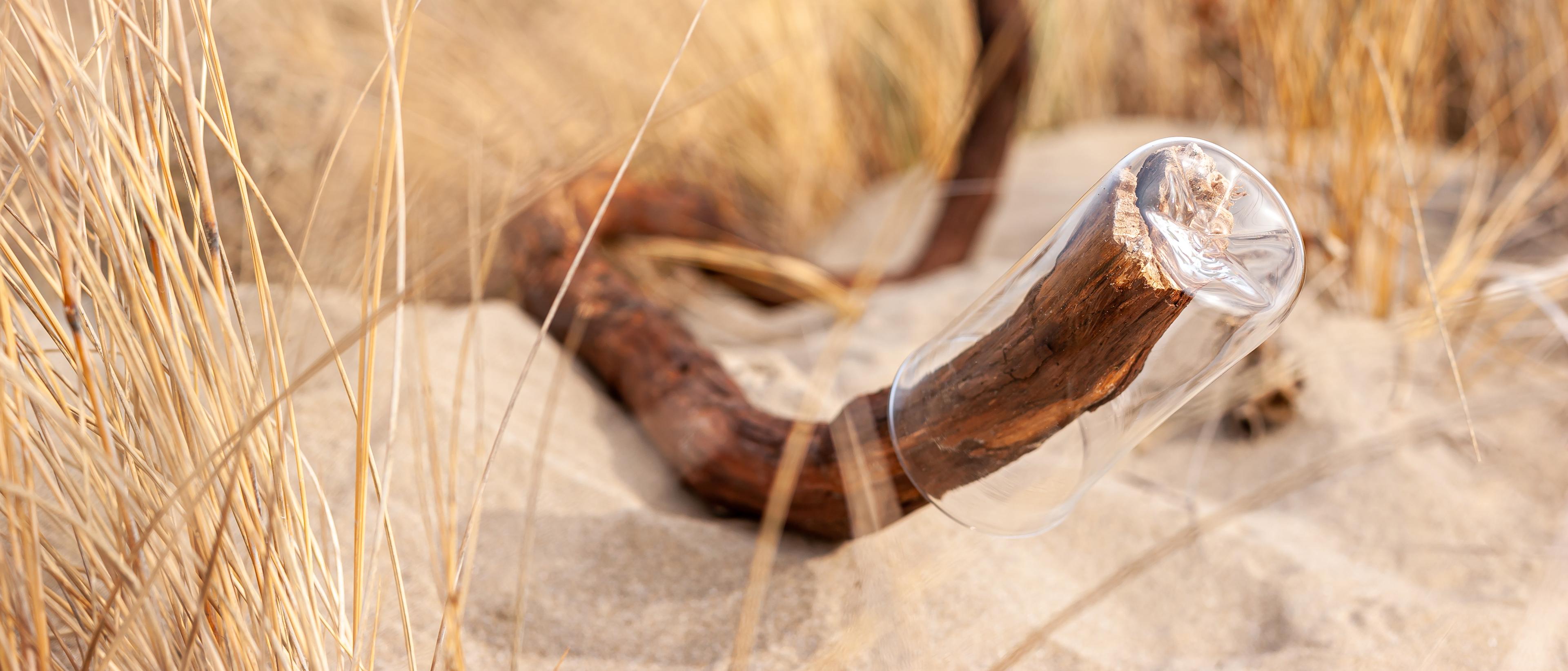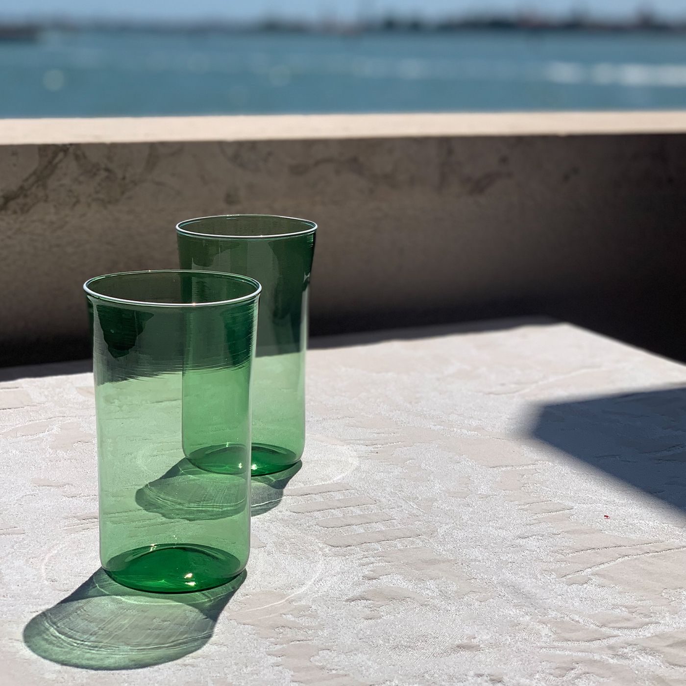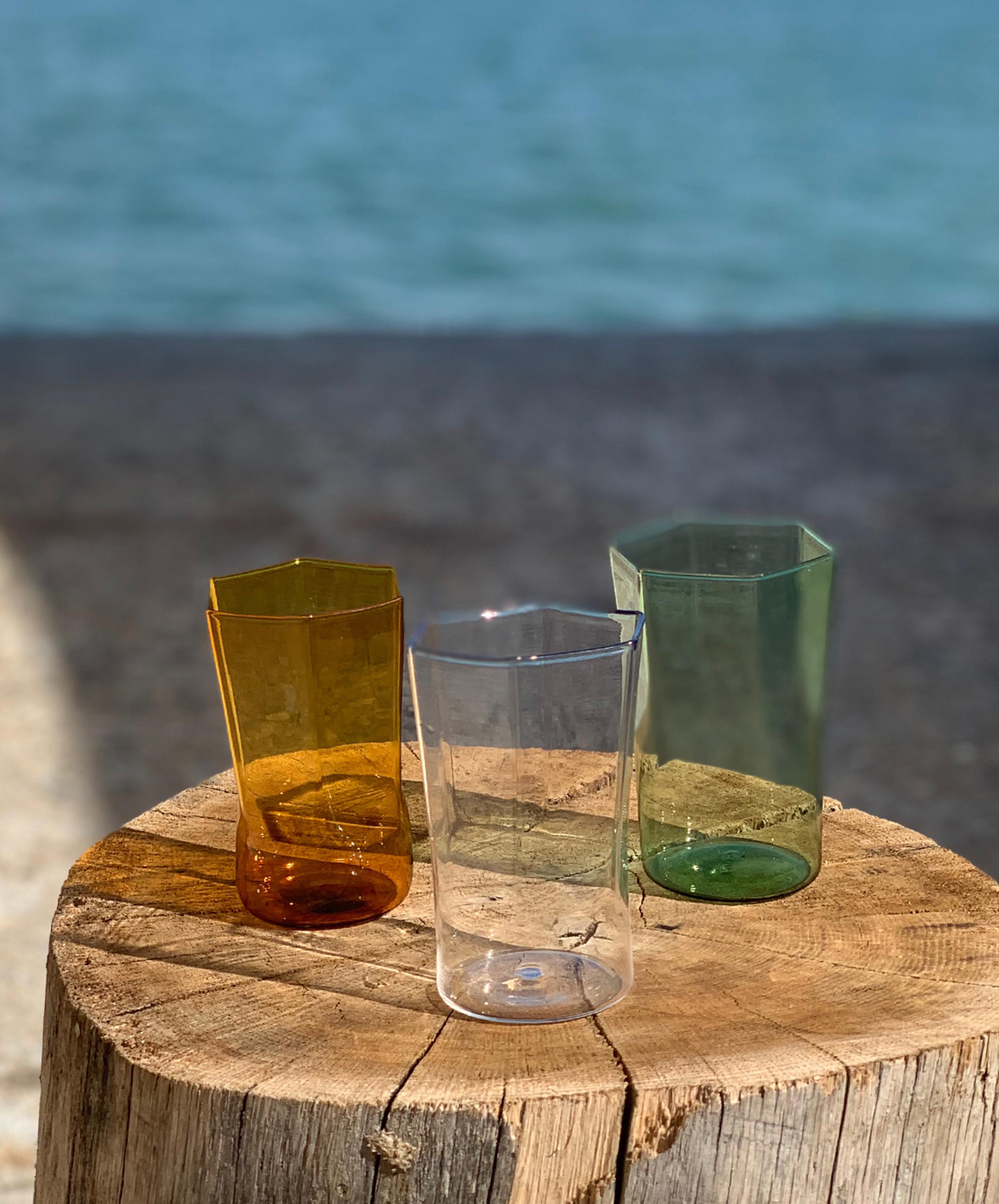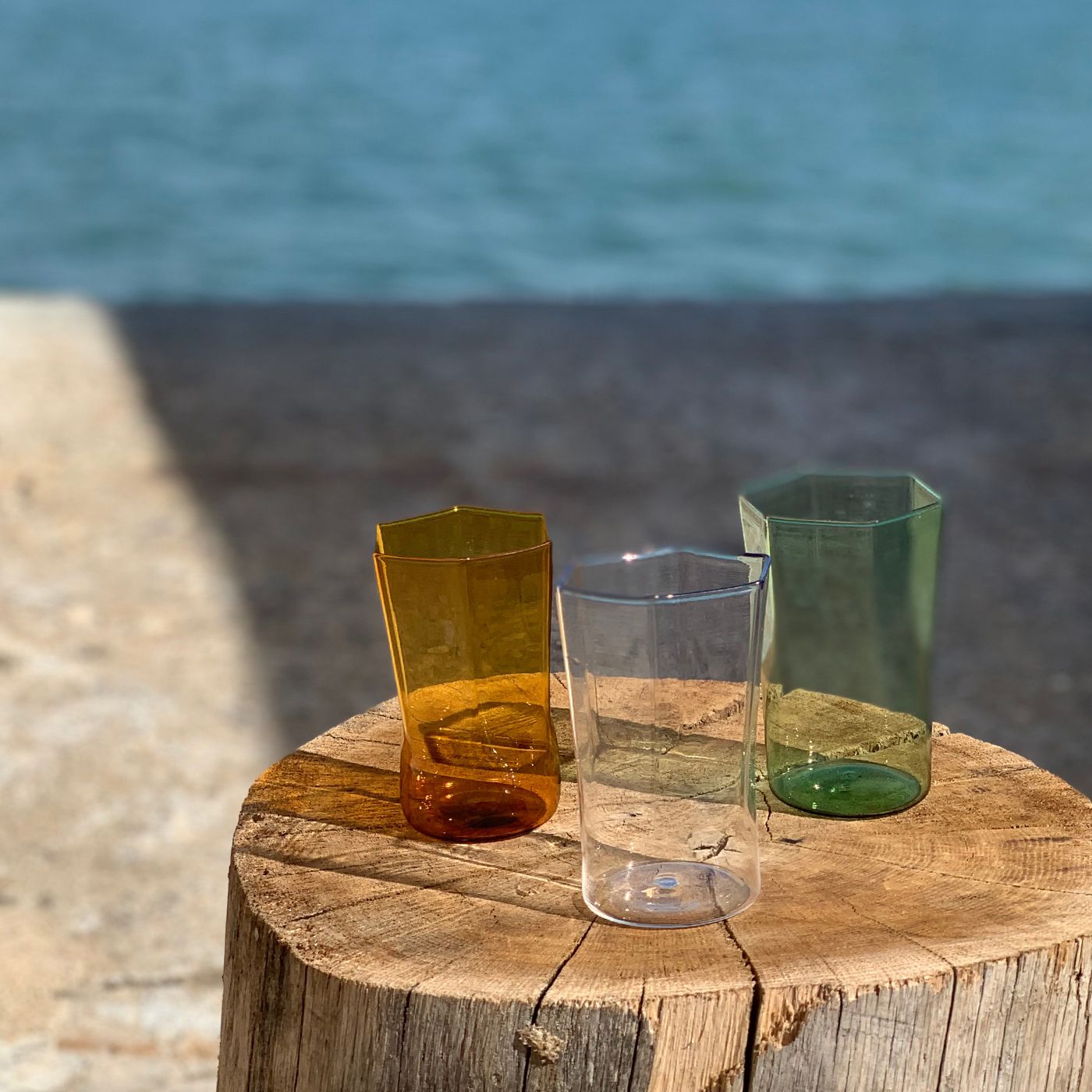 One of the pieces is the Macà, meaning "dented" in the Murano dialect. The glasses themselves have a very minimal design, but the smooth lines hide a very important story. The bottom of the Macà glasses, in fact, looks very much like the back of a plastic bottle, one of the many plastic bottles that unfortunately fill and pollute our seas. It is a glass, therefore, that in its simplicity seeks to push us to reflect on a strategic environmental issue for the health of the planet.