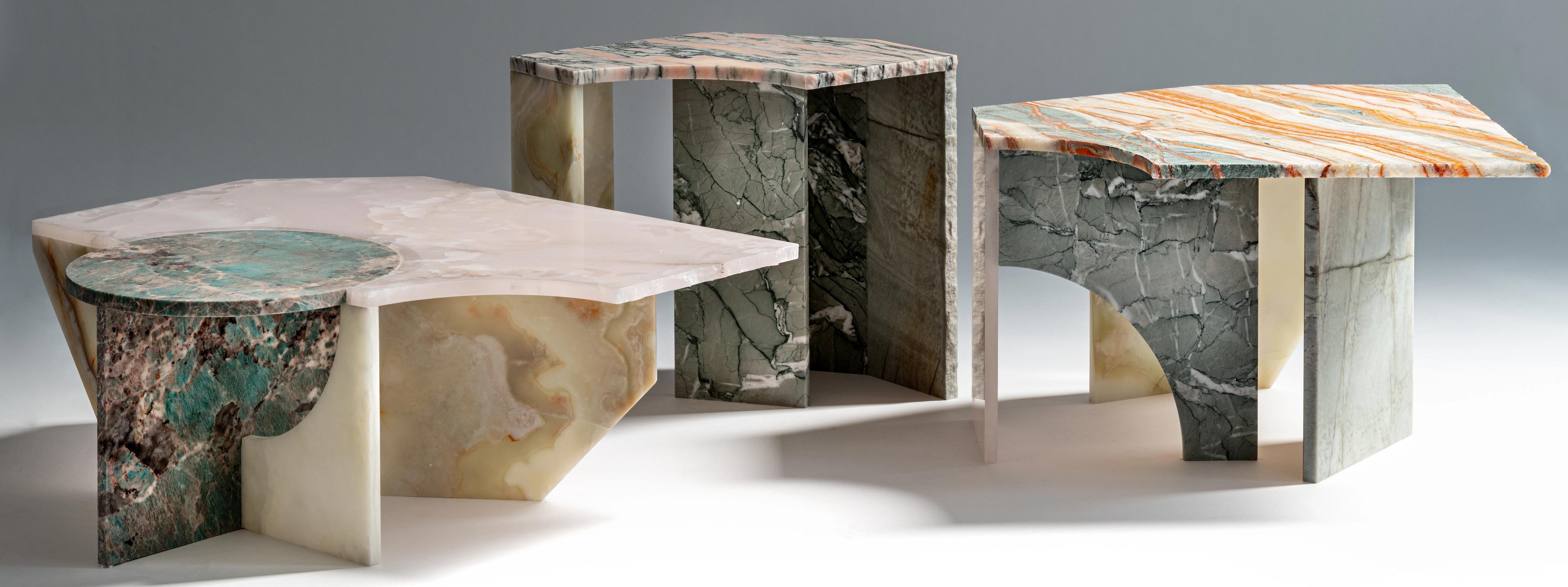 From the classic elegance of marble to the distinctiveness of travertine, stone offers a spectrum of textures, colors, and finishes that can complement any design style. Whether it's the warmth it brings when paired with wood, its interplay with light, or its ability to align with diverse color palettes, stone's versatility is unmatched. Natural stone stands out as a key element in interior decoration, providing both visual appeal and a unique tactile experience. Whether it's used as the prominent material, like in the Curl armchair by MGM Marmi e Graniti where the veining of marble stands out, in the Ossicle stool by Giobagnara or the Ottanta dining table by Ghidini 1961 where travertine is the protagonist, or when paired with other materials such as glass in the Pierce round dining table by Budri, copper in the Clis table lamp by Laura Meroni, or other types of stone as seen in the Ritagli chairs by Alimonti Milano or the Multicolor Colonnade bookcase by Salvatori designed by Pietro Lissoni. Each piece celebrates the uniqueness of this gorgeous material, thanks to the skilled hands of some of the finest Italian artisans who, with their expertise, highlight its beauty.