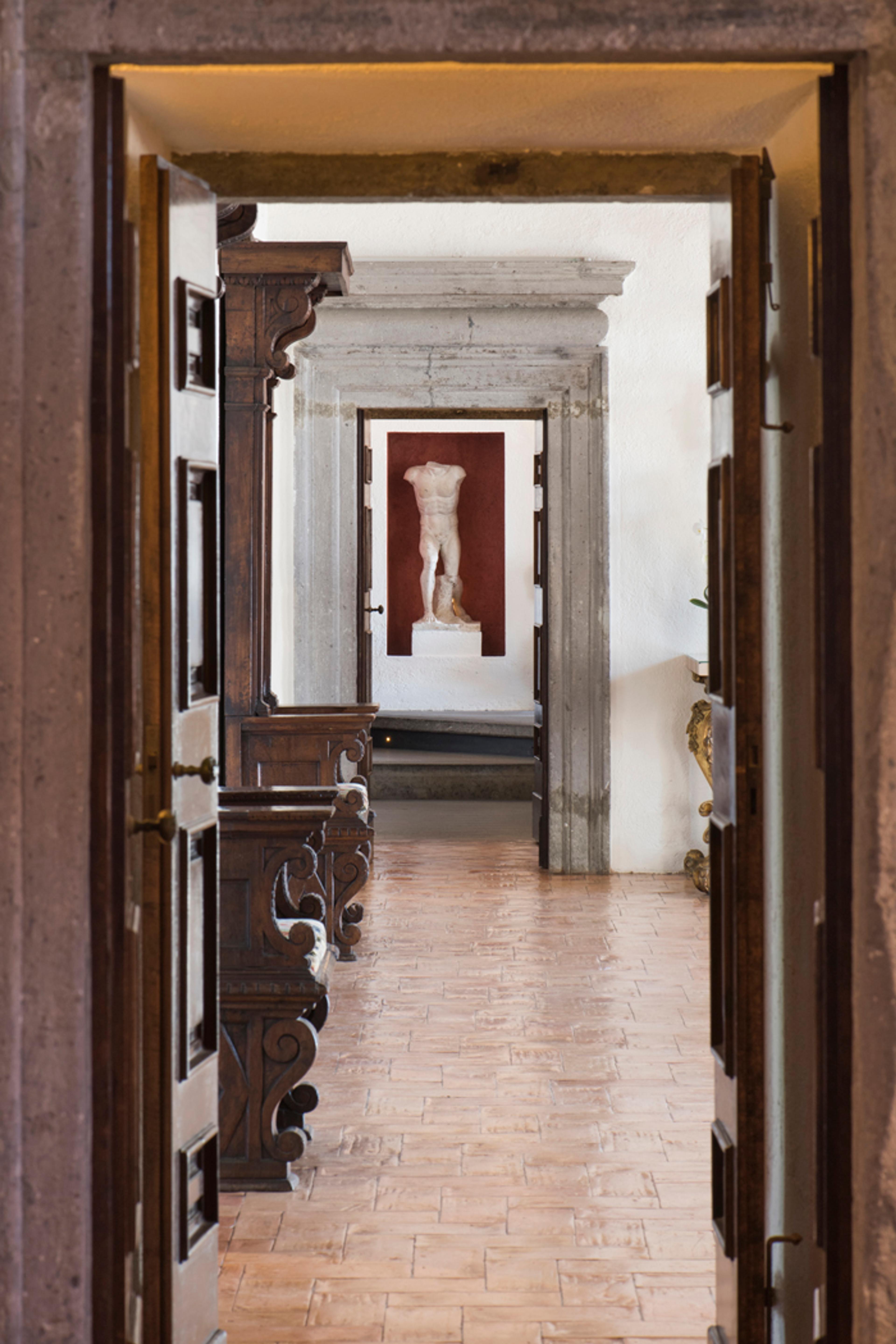 The entrance door leads you to a tree-lined drive until the ochre yellow facades of the hotel, where carriages once stopped. Majestic 17th Century tapestries, marble busts of Roman emperors, and an antiquarian map by Giovanni Battista Piranesi welcome the guests into the main lobby.