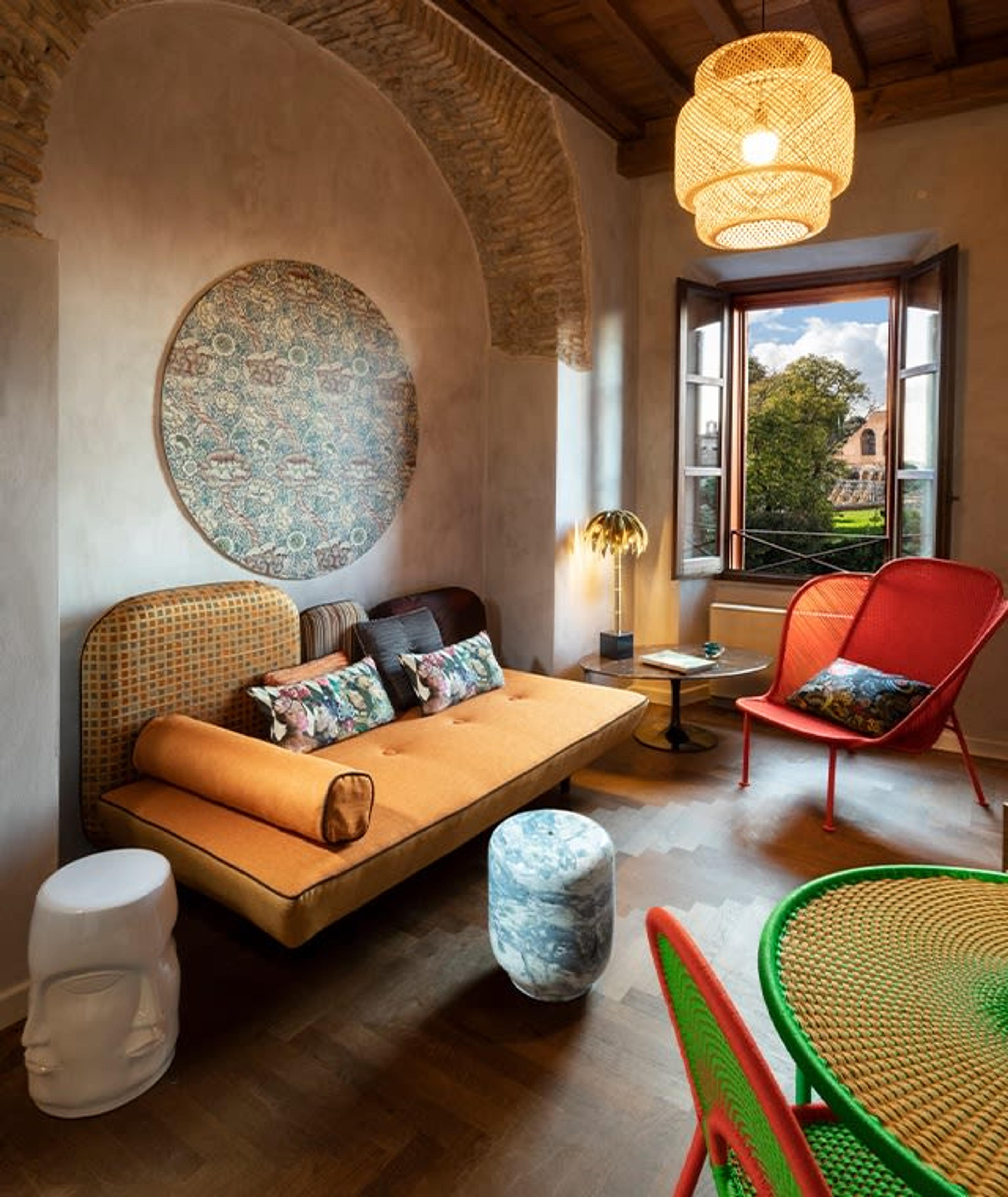 Palm Suite has been developed in a 18th-century building, just a few steps from the gardens of the Roman Imperial Forum and overlooking the Basilica of Maxentius and the Colosseum, and is owned by the Manfredi family who recently took up the project of transforming the palace into a hospitality venue. With excellent interior design choices and a focus on color, the space allows for a curated experience and a luxurious stay.