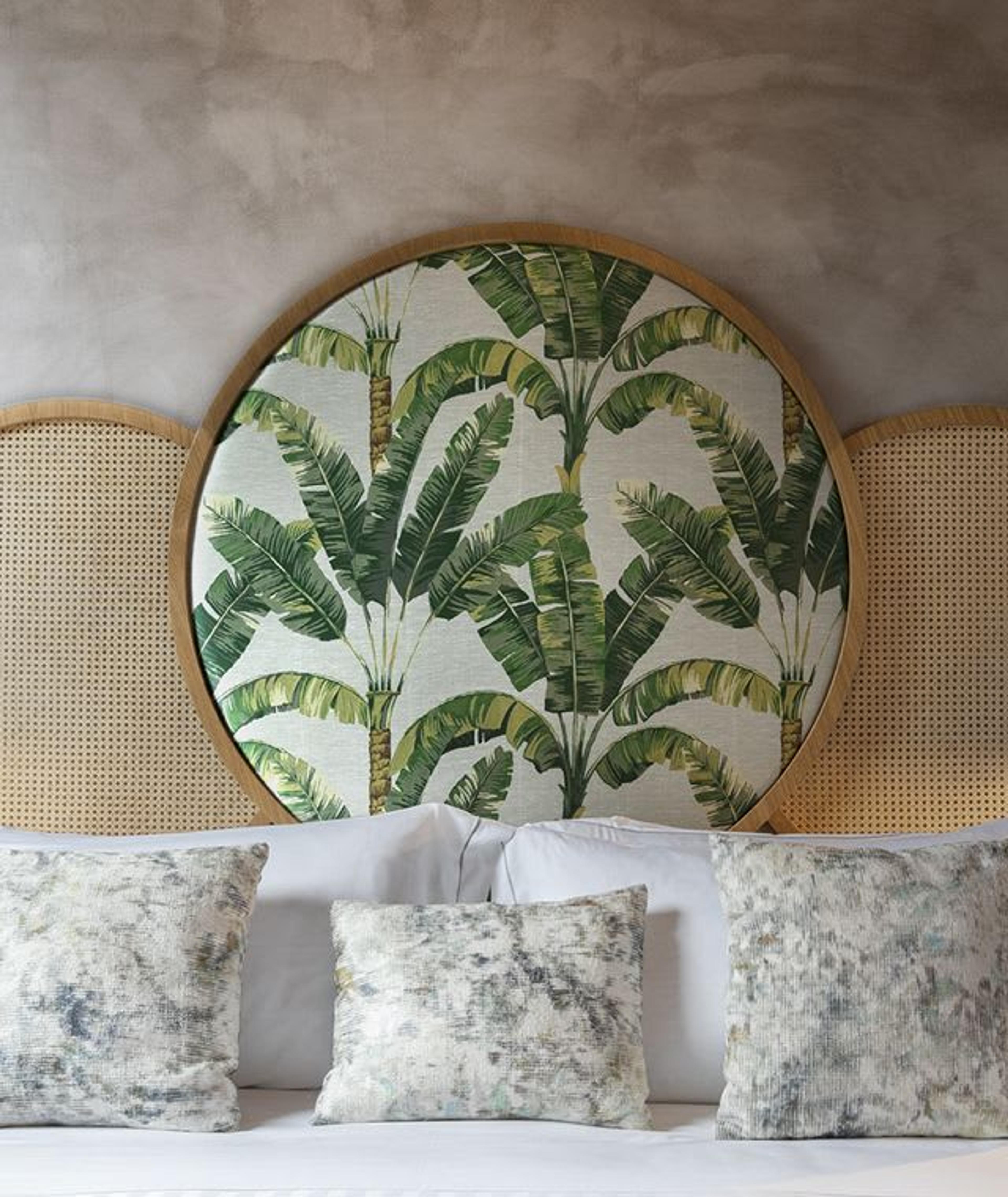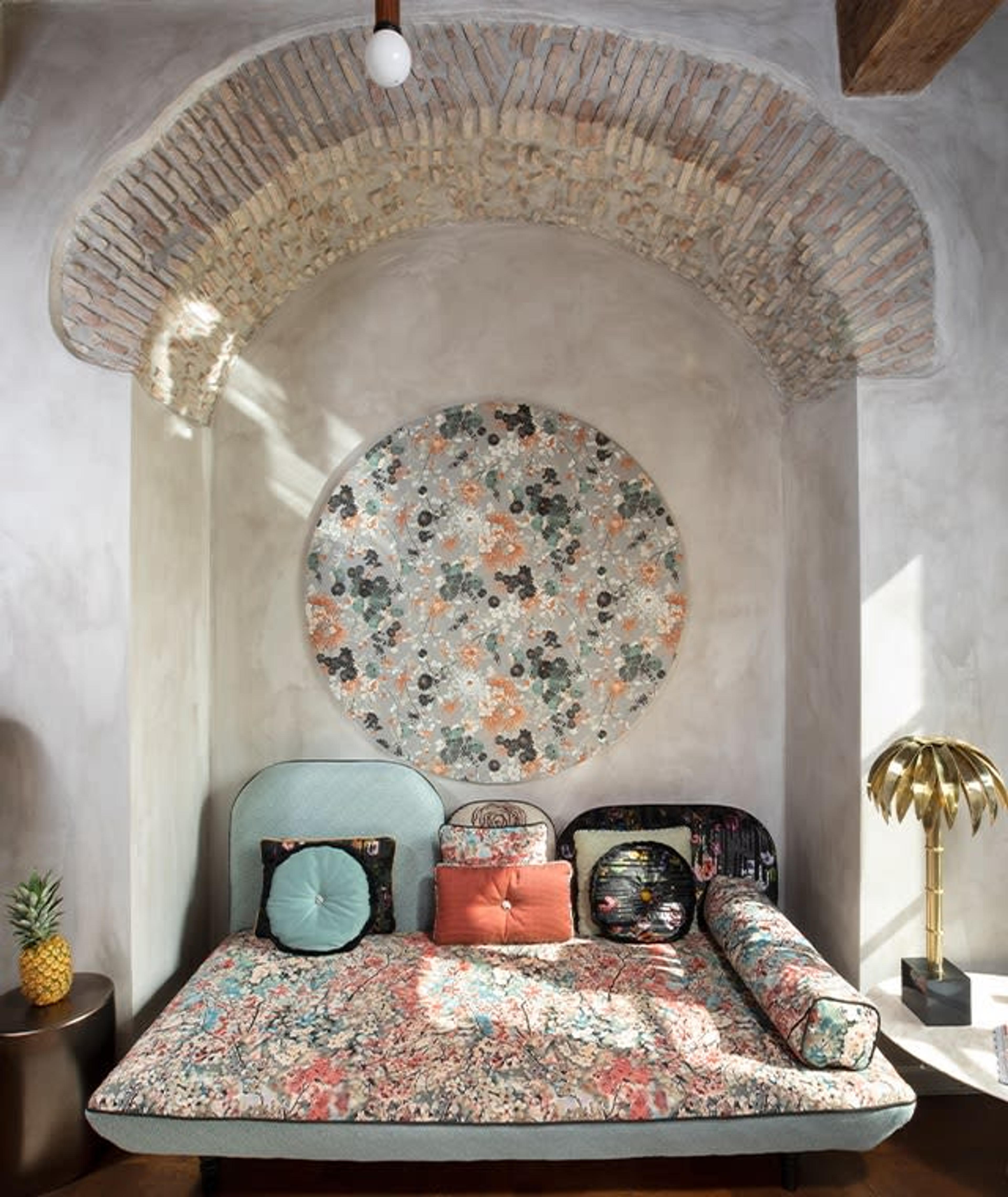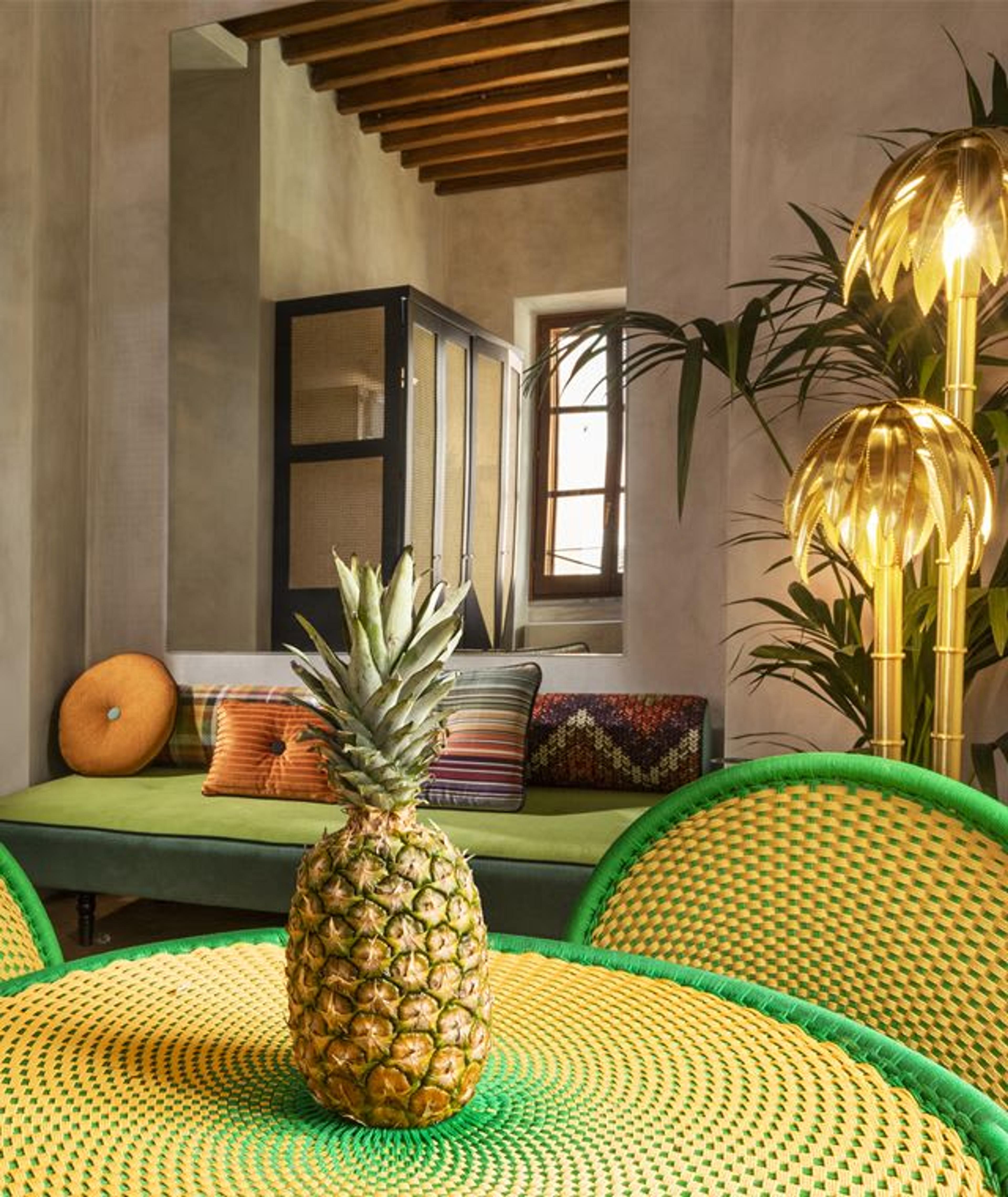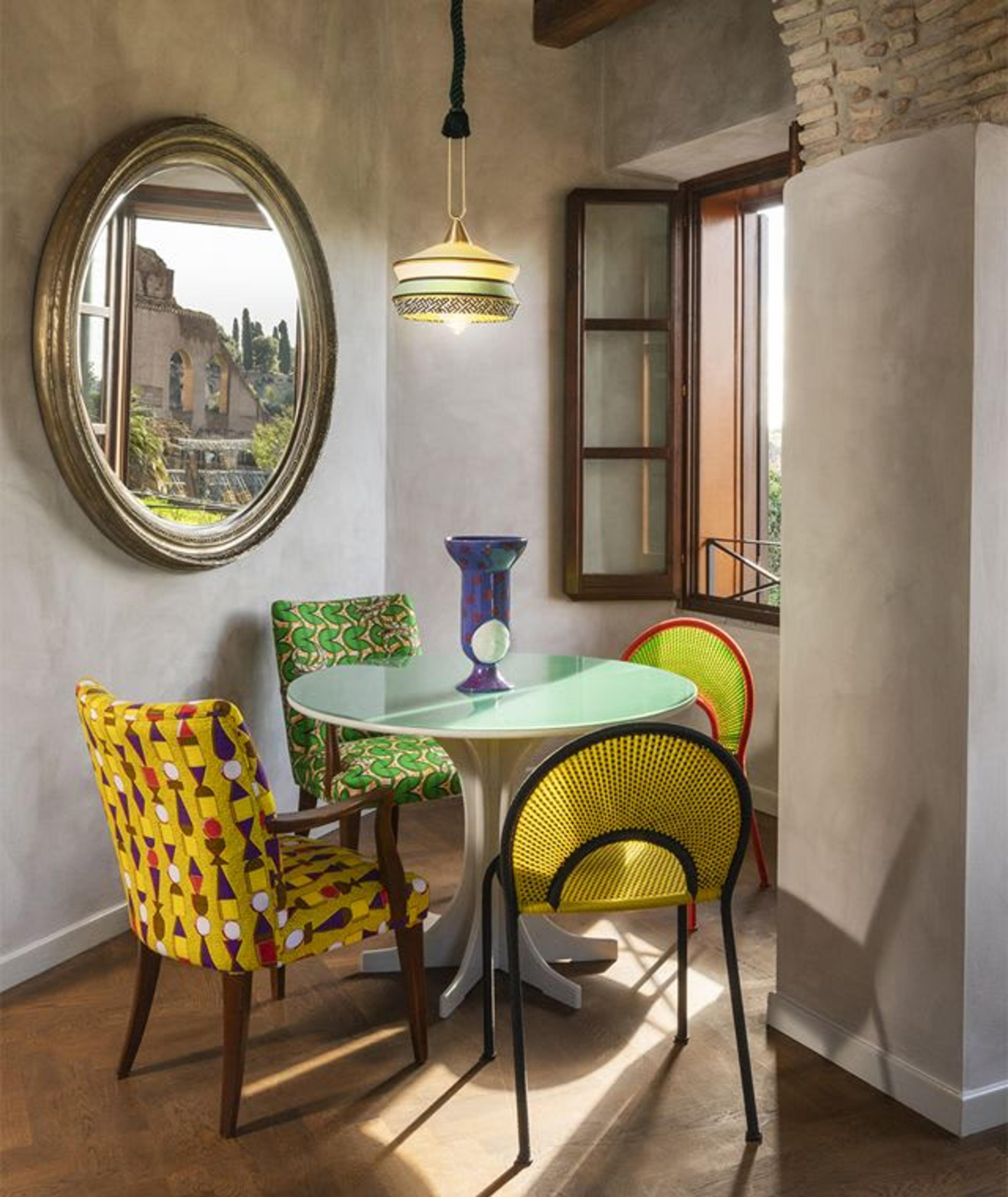 The interior design project was curated by Giorgia Dennerlein, an Italian-German architect and designer, inspired by the palm leitmotif that has been present as a decorative pattern throughout Rome since ancient times. The palm and floral theme are repeated throughout the décor, creating a soothing natural indoor/outdoor relationship. Bold, bright colors and exotic patterns dominate the spaces, enhanced by unique furnishings and accessories.