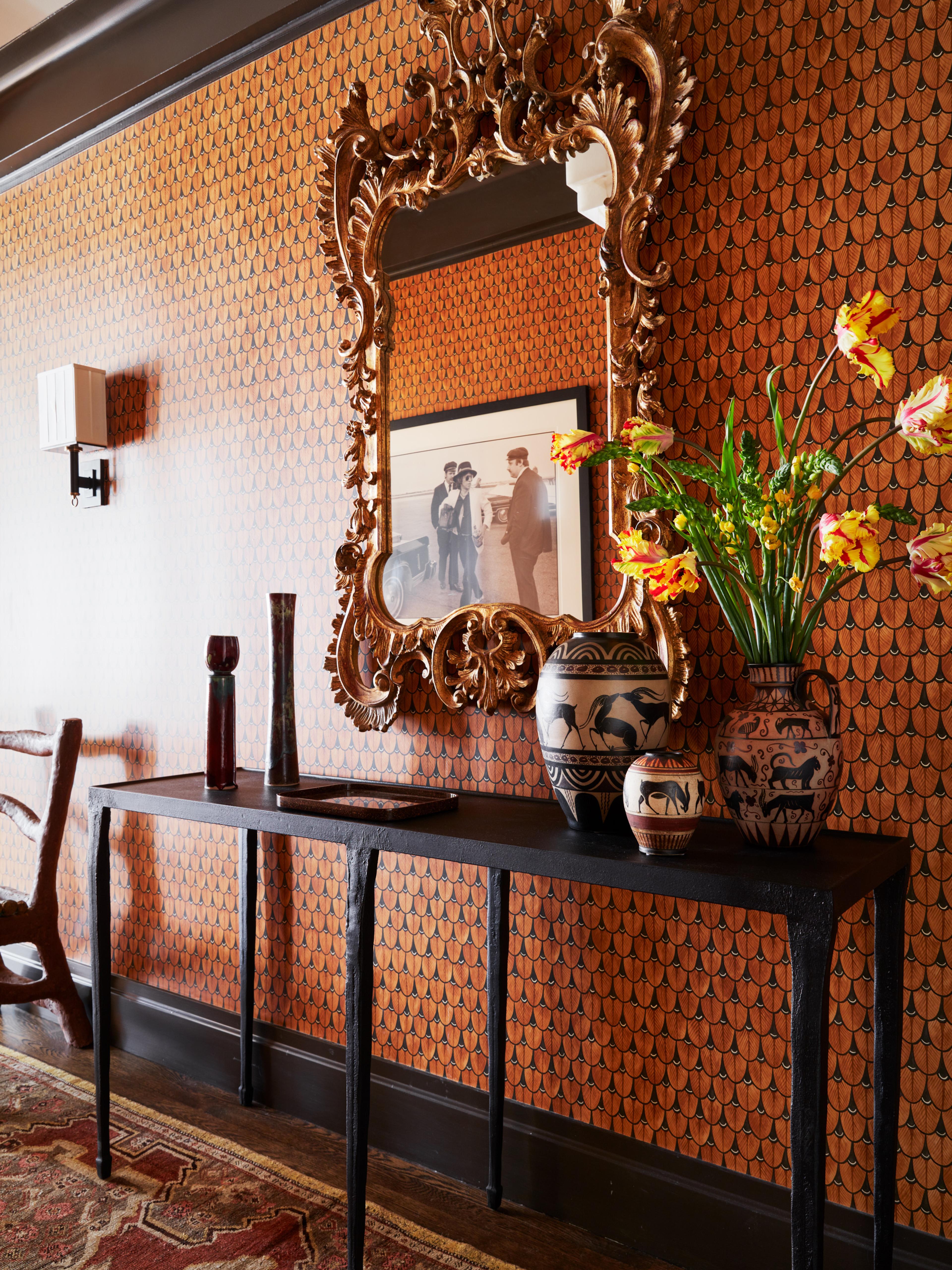 Speaking of uptown prewar apartments, I just moved to a new place myself in a building from 1929 designed by Van Wart and Wein who aren’t as well-known as some firms but designed some famous buildings including 10 Gracie Square, 40 5th Avenue and the Campanile. The apartment has an incredible, generous layout with big rooms and a wood burning fireplace and city views. My goal has been to take this classic space and make it a bit sexy so I’m channeling my inner 1970s and 1980s. I’ve also used it to showcase some of my own products (furniture, wallpaper, medicine cabinets, rugs and fabrics) and those of my many friends in the design industry. I’m trying to use something from all of my friends and favorite fabric houses.