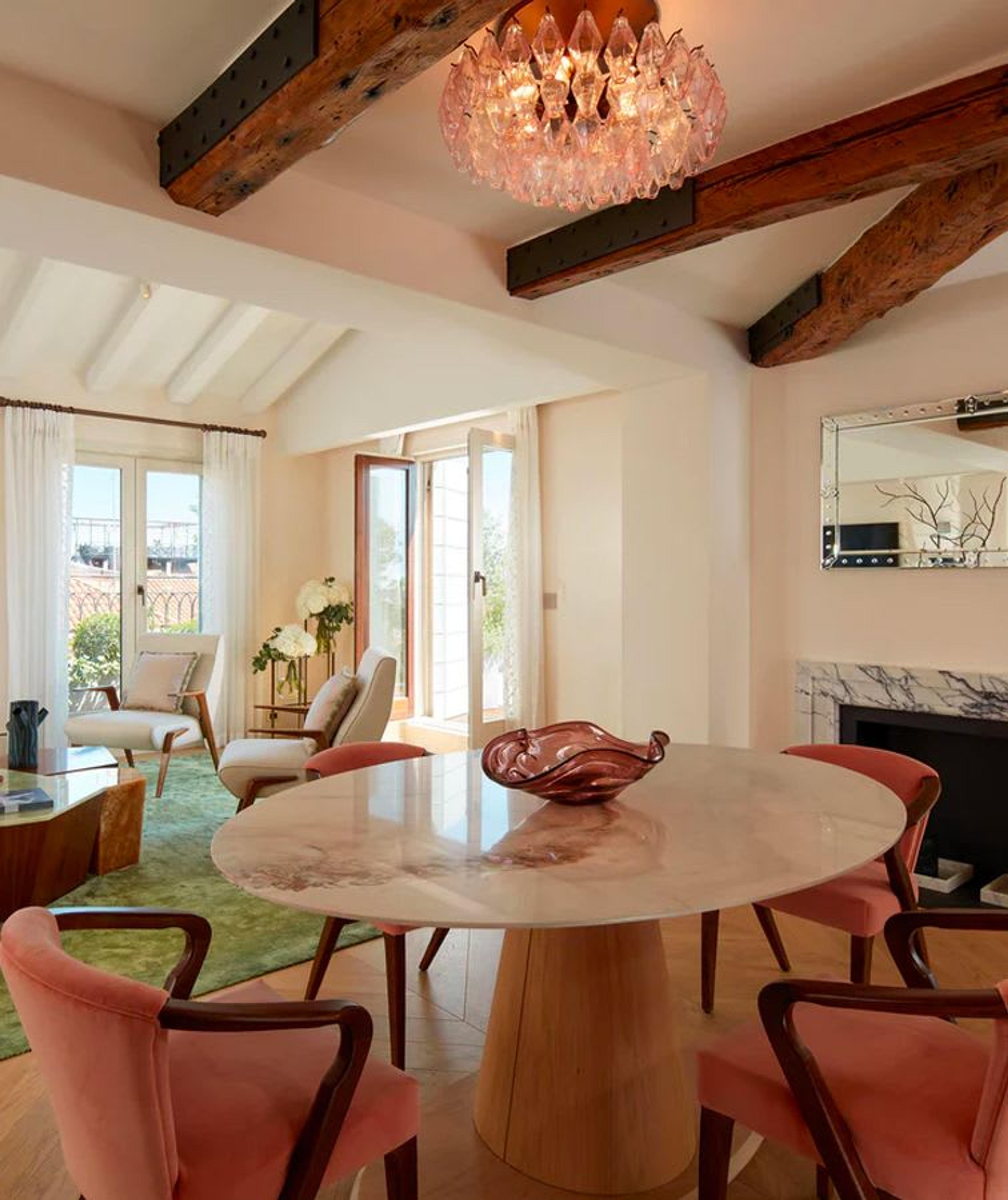 Los cinco "Palazzi" se han restaurado y amueblado teniendo en cuenta el patrimonio artístico y cultural del edificio, al tiempo que se les ha añadido un toque característico de glamour moderno. El exquisito diseño del hotel y su excepcional ubicación lo convierten en un santuario de lujo donde los huéspedes pueden disfrutar de un ambiente tranquilamente seductor, caracterizado por los tonos pastel y la abundancia de luz procedente del exterior.