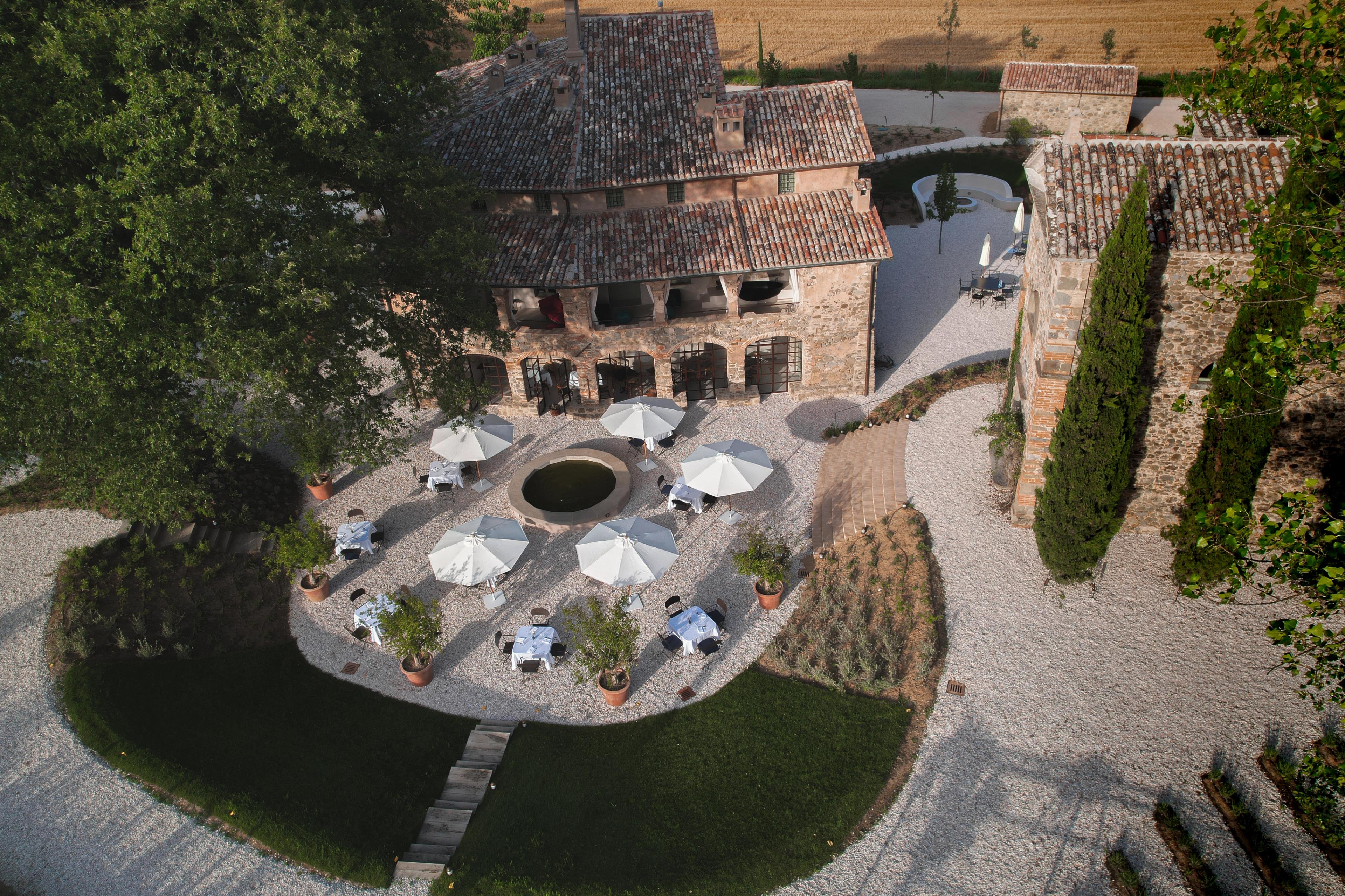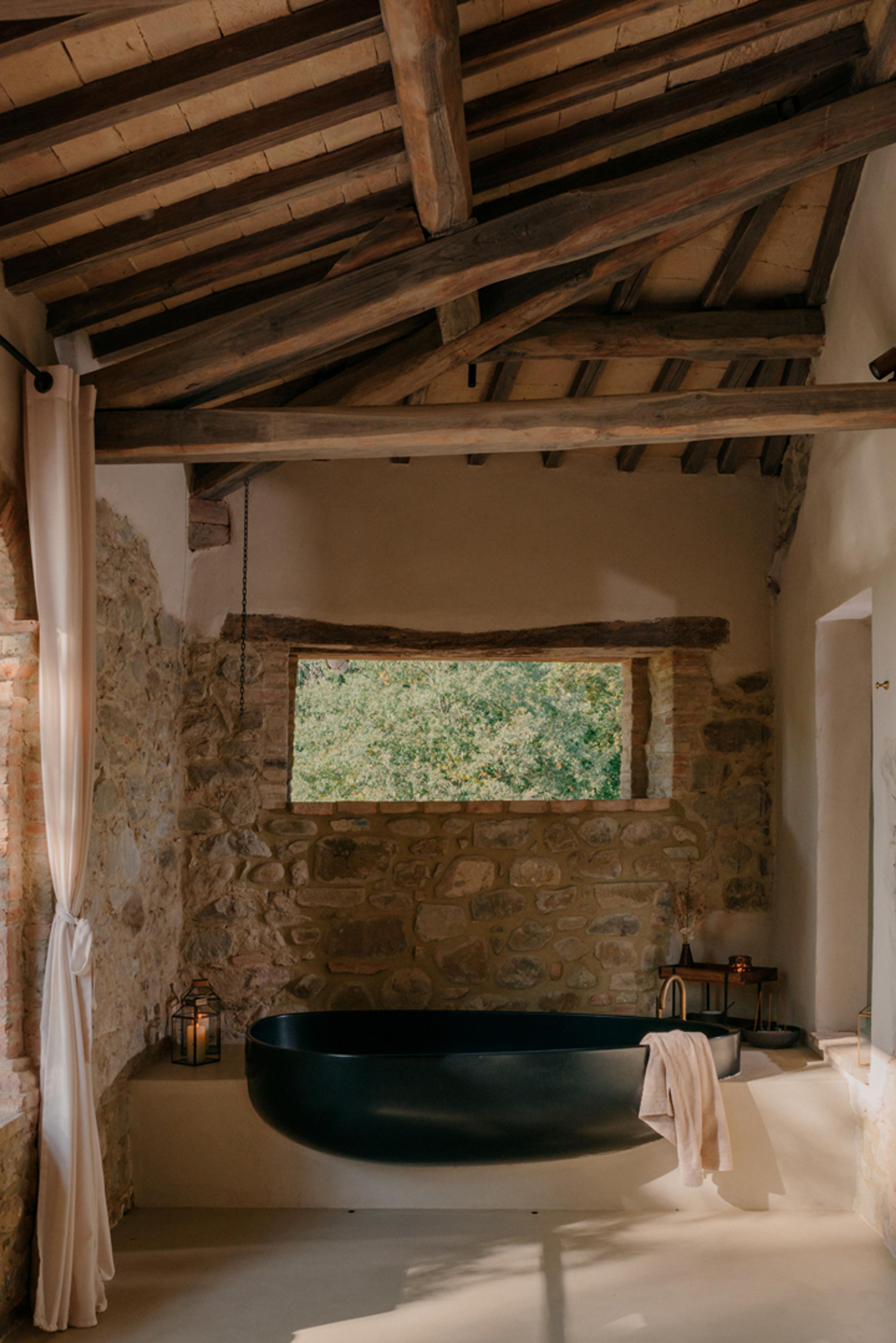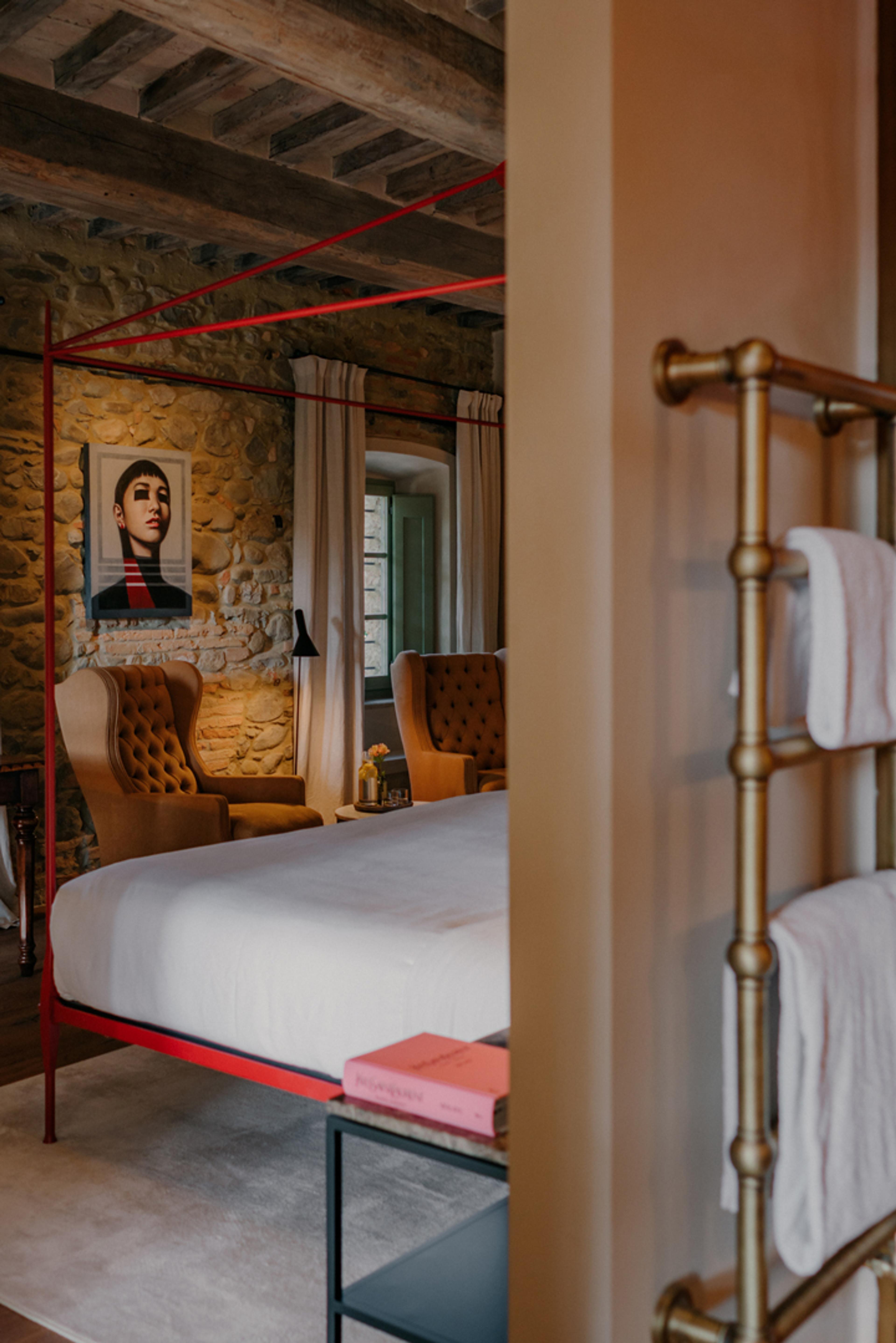 El diseñador decidió dar a cada área su propia identidad, con diferentes paletas de colores, materiales y estilos de mobiliario, sin modernizar completamente los edificios. Se preservaron los pisos de madera originales, los muros de piedra natural y los ladrillos de terracota a la vista, junto con los detalles de latón presentes en toda la propiedad. También se prestó especial atención a las obras de arte que adornan los espacios, seleccionadas por Matteo Pacini y creadas por más de diez artistas diferentes, cada uno aportando su estilo artístico al antiguo monasterio convertido en hotel.
