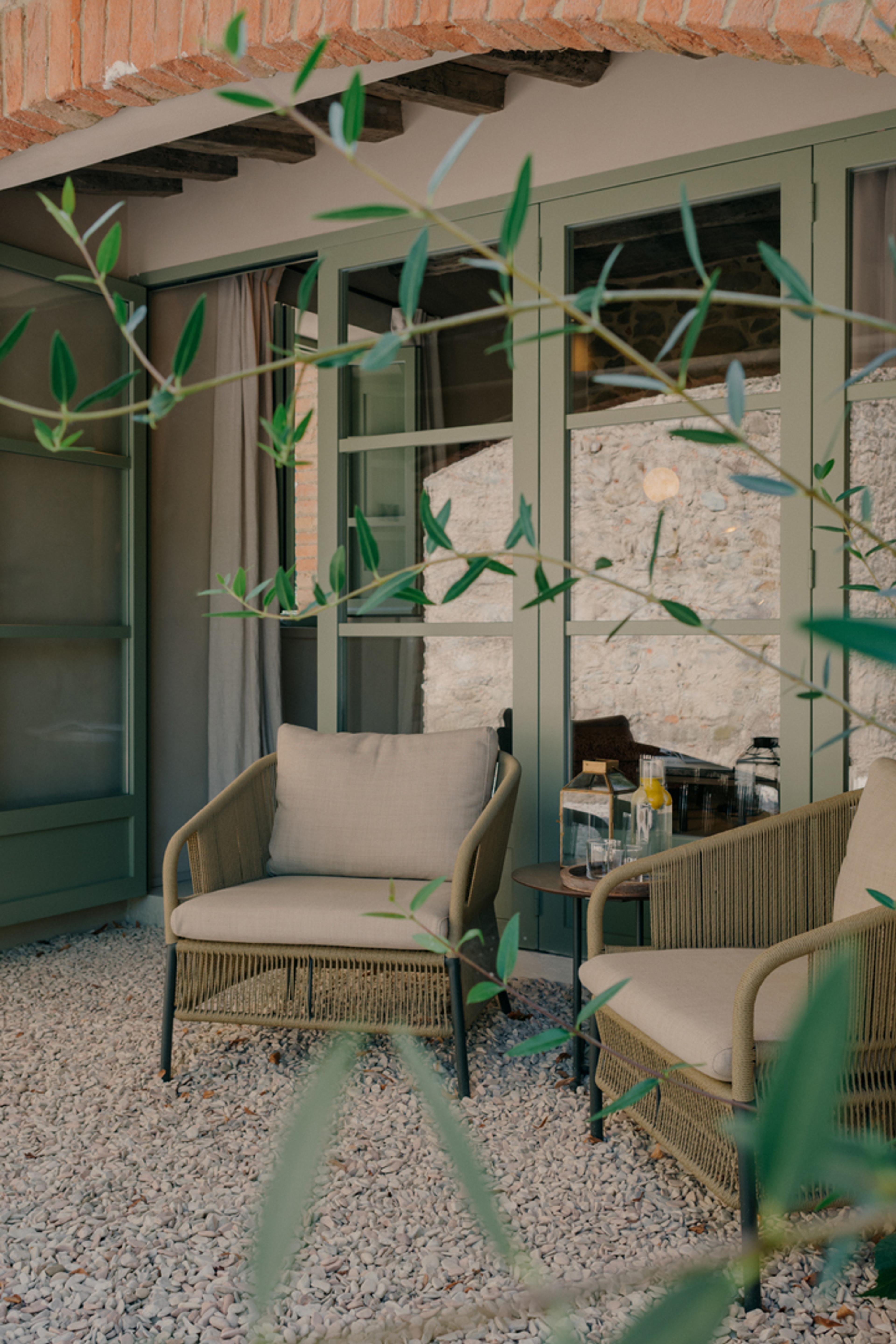 Dos de las suites cuentan con amplias terrazas con vistas a la campiña, diseñadas por la diseñadora italiana Paola Lenti, con maravillosas bañeras para disfrutar de un momento de relajación inmerso en la naturaleza. Las habitaciones del anexo, por otro lado, tienen sus propios jardines privados con magníficos muebles de exterior de la empresa veneciana Varaschin.