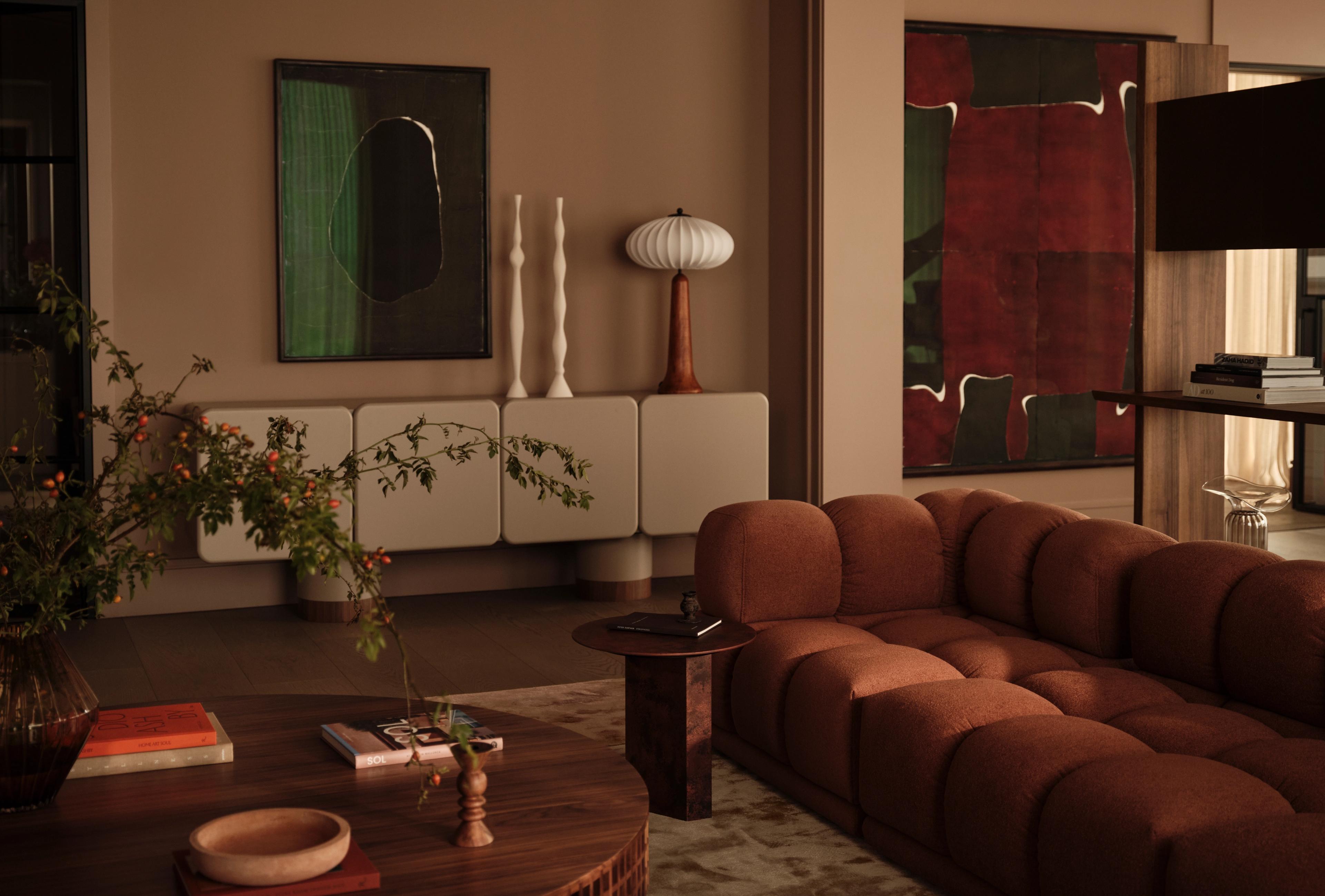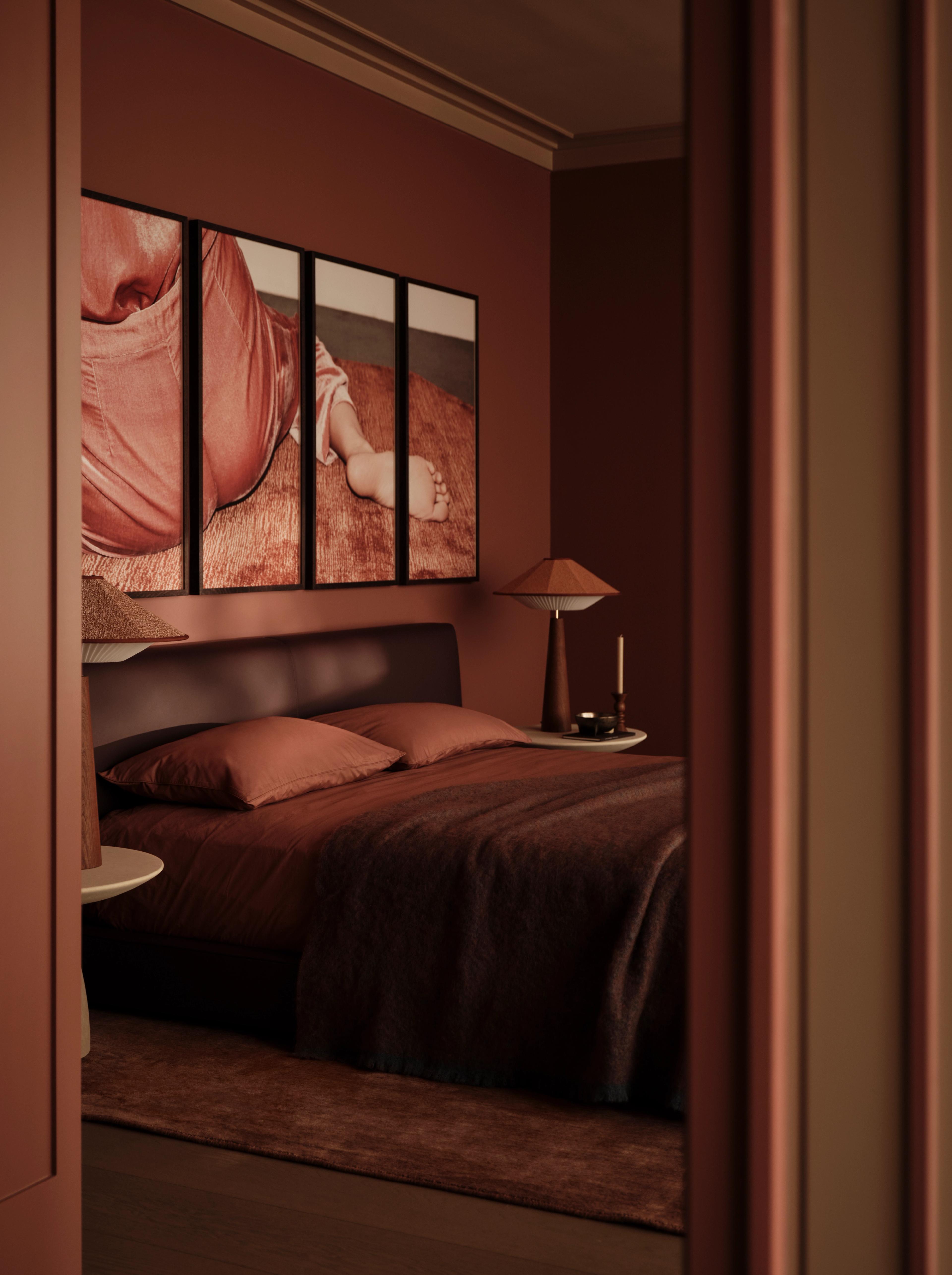 Inspirándose en los colores cambiantes del cielo y la luz siempre cambiante de la ciudad, la paleta fluye sin esfuerzo de una habitación a otra. Las paredes y los techos en tonos cálidos y terrosos crean cohesión y calma, mientras que los muebles escultóricos y la iluminación aportan dramatismo y escala. Maderas ricas, suaves bouclés y acabados artesanales de Artemest reflejan tanto la autenticidad como el refinamiento contemporáneo, suavizados con tonos rosados y siluetas orgánicas. La luz natural se aprovecha en todo el espacio, animando las superficies y profundizando la conexión con el horizonte.