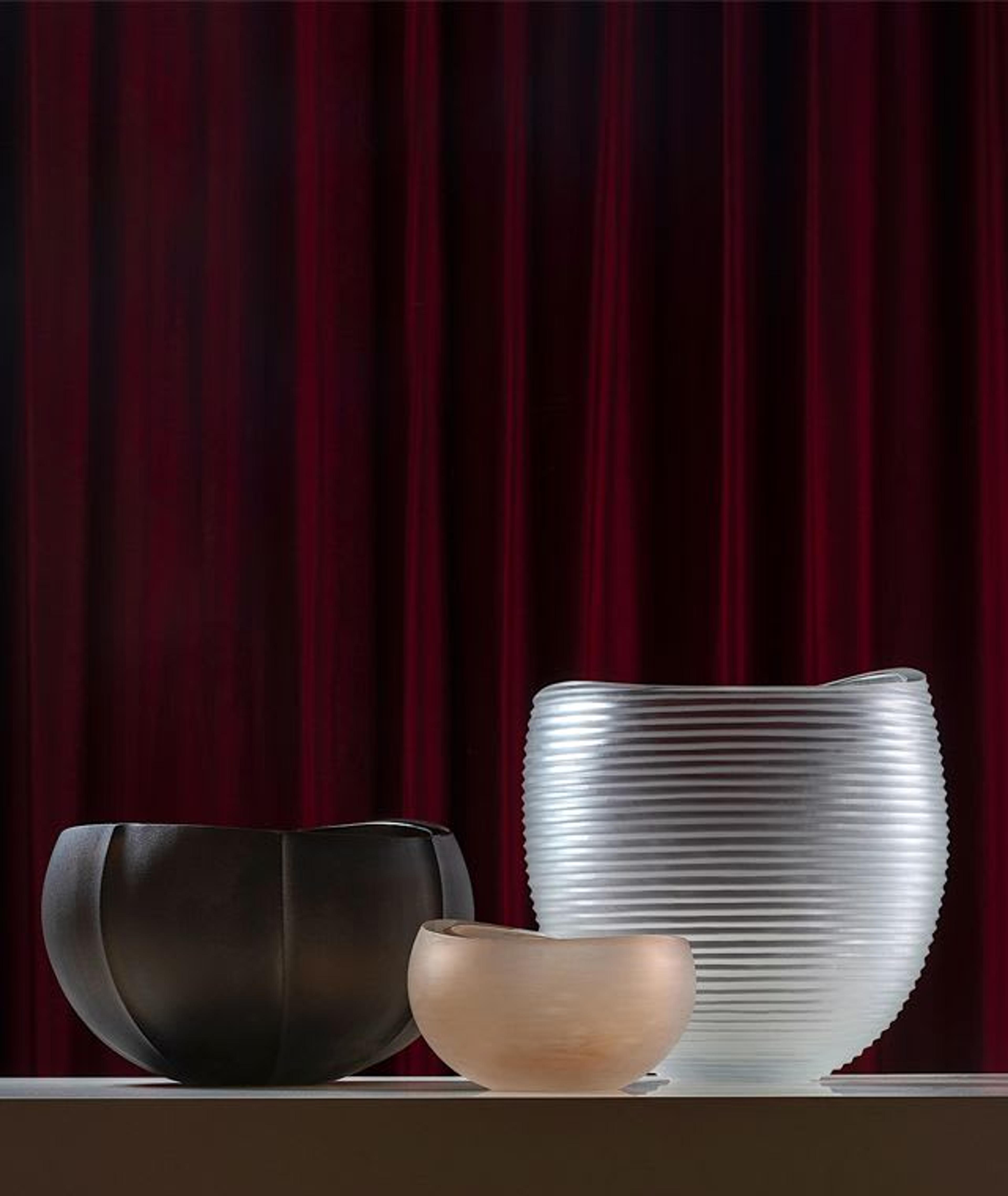 La colección Incisioni de Federico Pero se compone de jarrones, ceniceros, portavelas, candelabros e impresionantes lámparas de sobremesa -Haute y Petite- para una colección en la que las formas y los colores contemporáneos reinterpretan con gracia la tradición del cristal de Murano. Las nuevas lámparas Haute y Petite impulsan la investigación de Peri en torno al tema del grabado en vidrio. Bandas, pliegues, excavaciones acanaladas cubren las superficies de estas lámparas, suavizando su forma cilíndrica, interrumpida únicamente por las bases de aluminio cepillado.