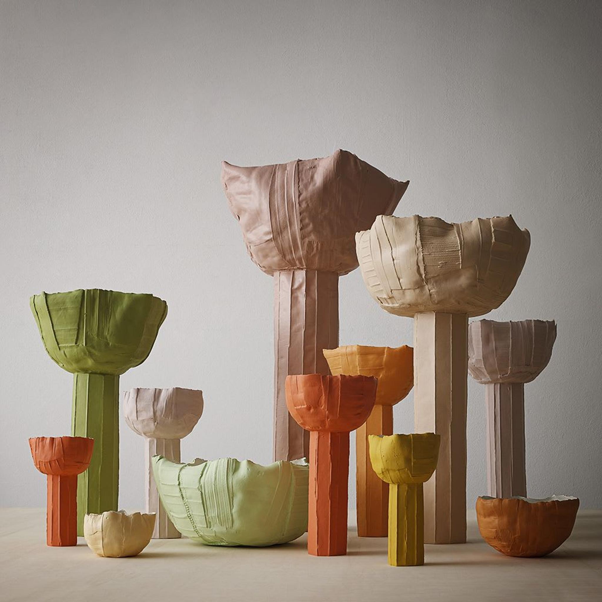 Une fois de plus, ce sont les formes de la nature qui inspirent la nouvelle collection d'objets en terre cuite de Paola Paronetto. L'image des boutons d'or, avec leurs couronnes généreuses et leurs tiges dansantes, suggère de petites structures audacieuses et des équilibres imaginatifs qui reconnaissent, comme toujours dans le travail de Paola, les imperfections, les asymétries et les irrégularités. Forçant les limites du matériau comme elle aime le faire, Paola plie sa technique à la rotondité, créant une famille d'objets qui ont la grâce d'une fleur sauvage et la sainteté d'un calice. Légers et fins comme du papier, mais charpentés et sculpturaux, ils naissent d'alchimies impossibles à reproduire, si bien que chacun a son âme et une petite histoire créative à raconter. Il y a ensuite les couleurs, que Paola conçoit comme pleines et opaques, libres d'interpréter les formes avec imagination, presque toujours inspirées par l'univers naturel, parfois par le monde de la fantaisie. Elle suscite le désir de mélanger les formes et les couleurs de la manière la plus variée et la plus spontanée, comme elles se présentent si merveilleusement dans la nature.