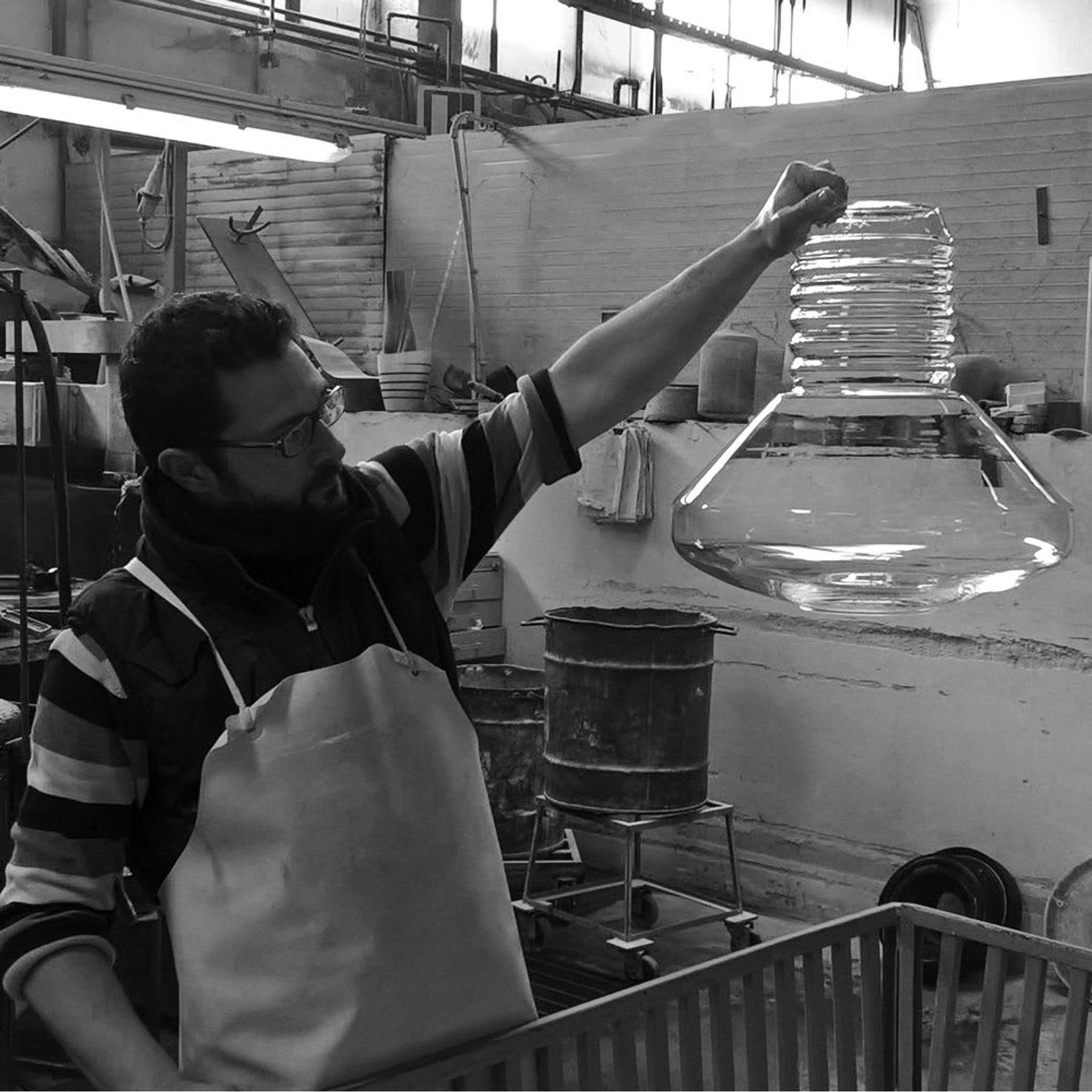 Inspiré par le travail du mouvement mid-moderniste, il allie le savoir-faire technique, le meilleur de l'art italien et sa passion pour le verre afin de créer des pièces qui fusionnent le design contemporain et la technologie innovante avec des matériaux de la plus haute qualité, méticuleusement produits avec les méthodes de traitement les plus fines.