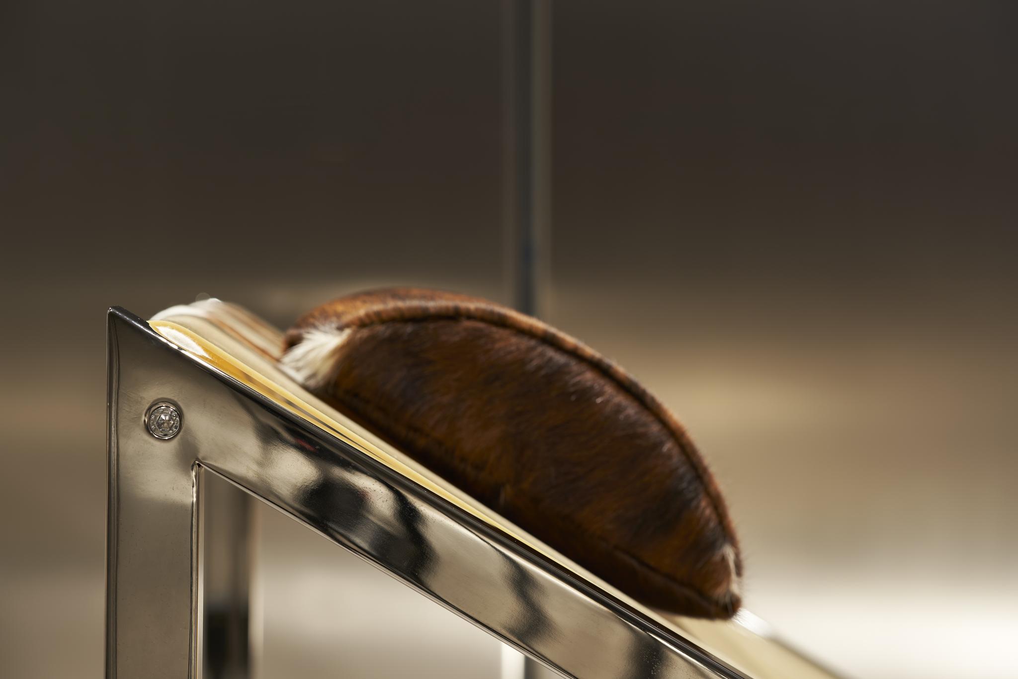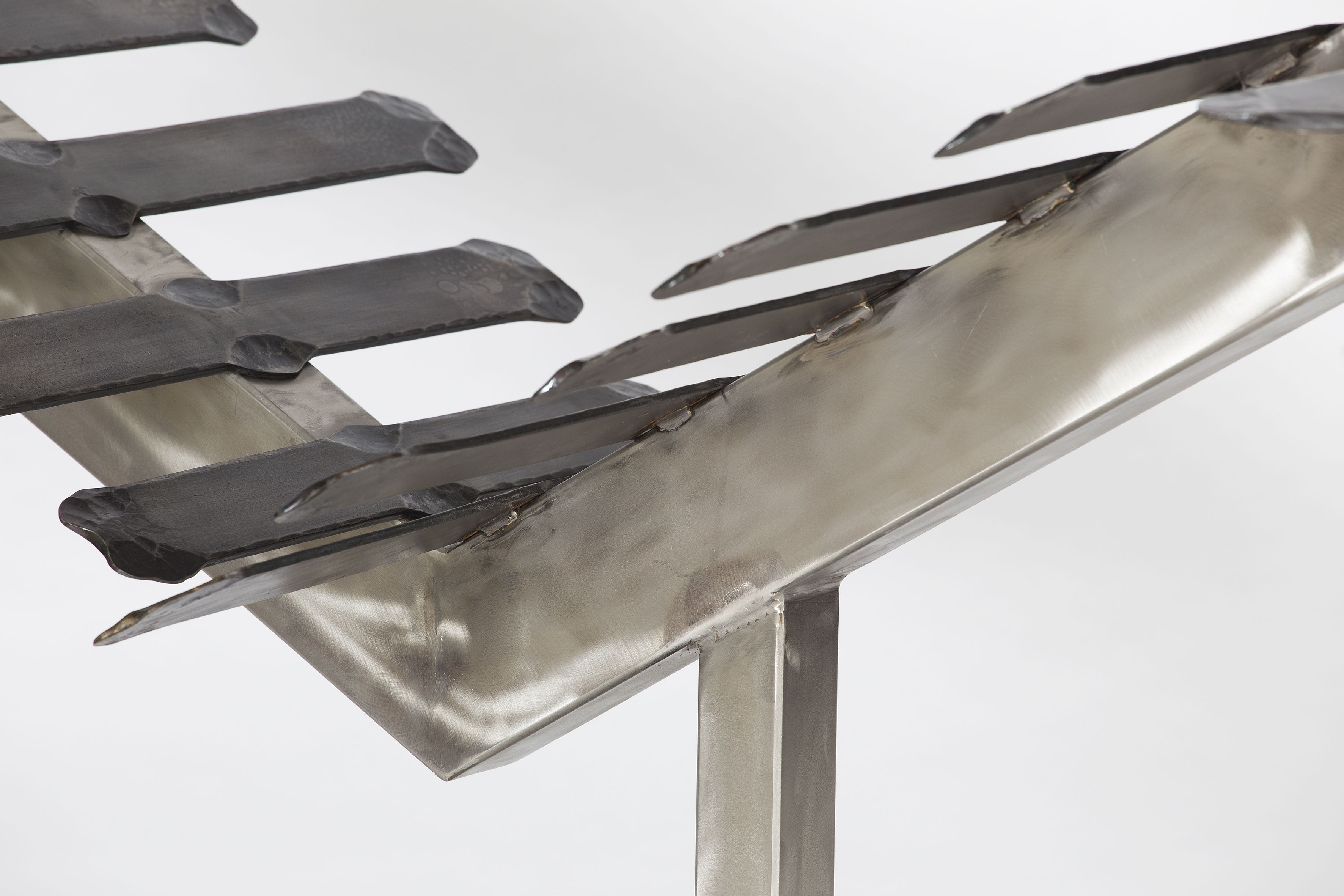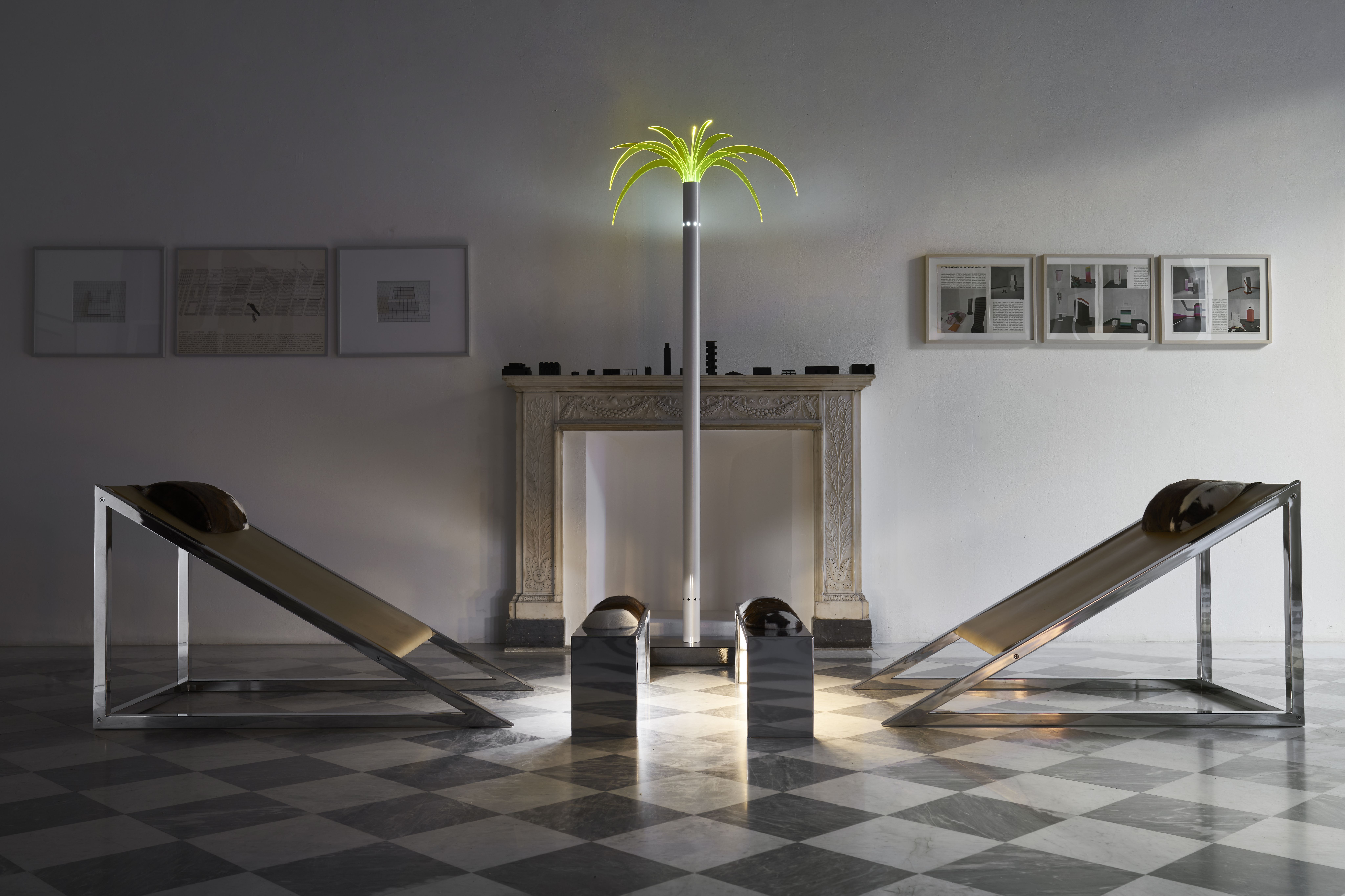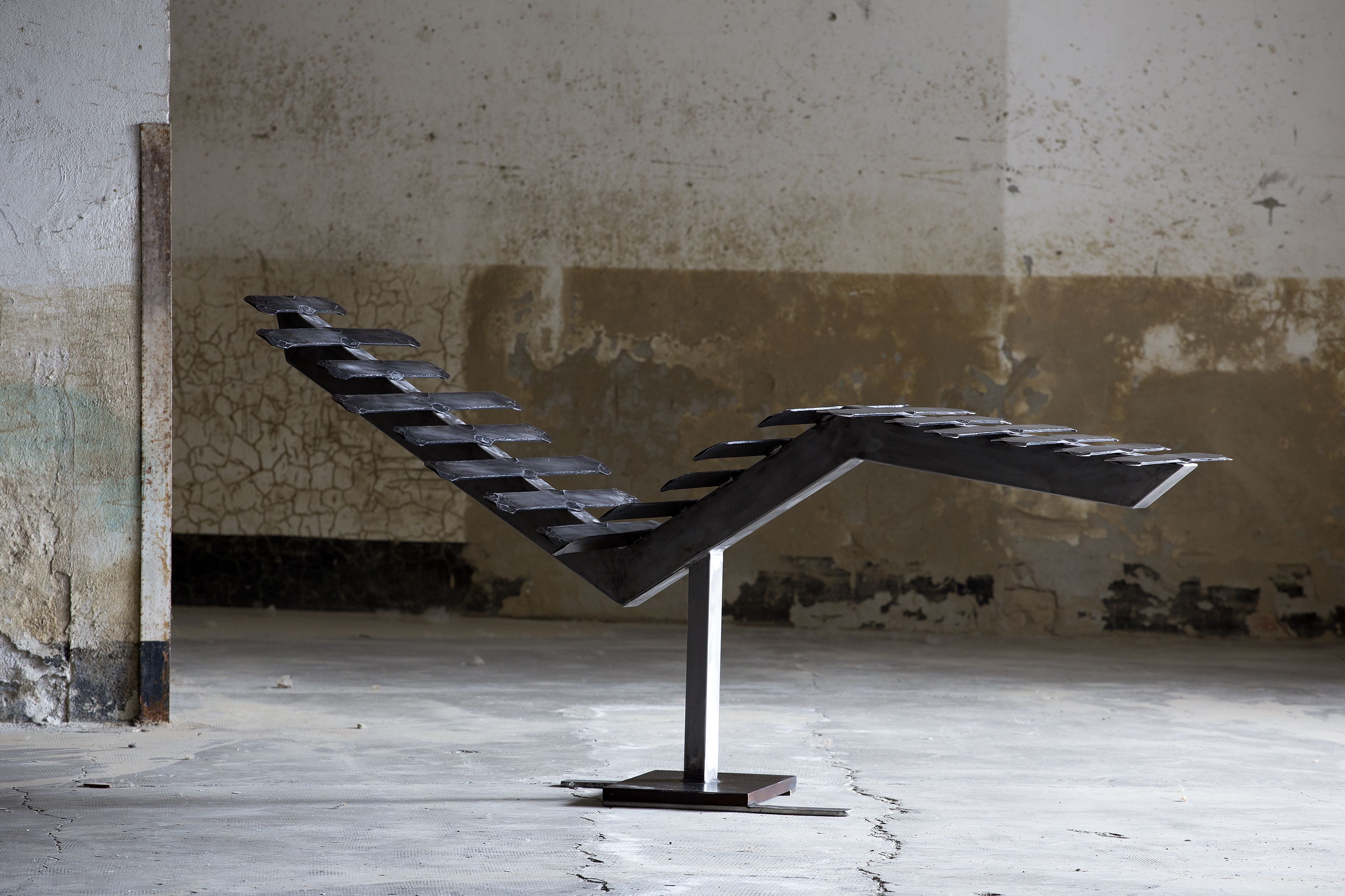 Pont raffiné et élégant entre l'art et le design, cette chaise longue est une sculpture étonnante habilement fabriquée à la main en acier inoxydable pour la base et en fer pour le siège, composée de 19 lattes, chacune soigneusement battue à la main. Toute imperfection témoigne du caractère unique de cet objet d'art et d'ameublement extraordinaire.