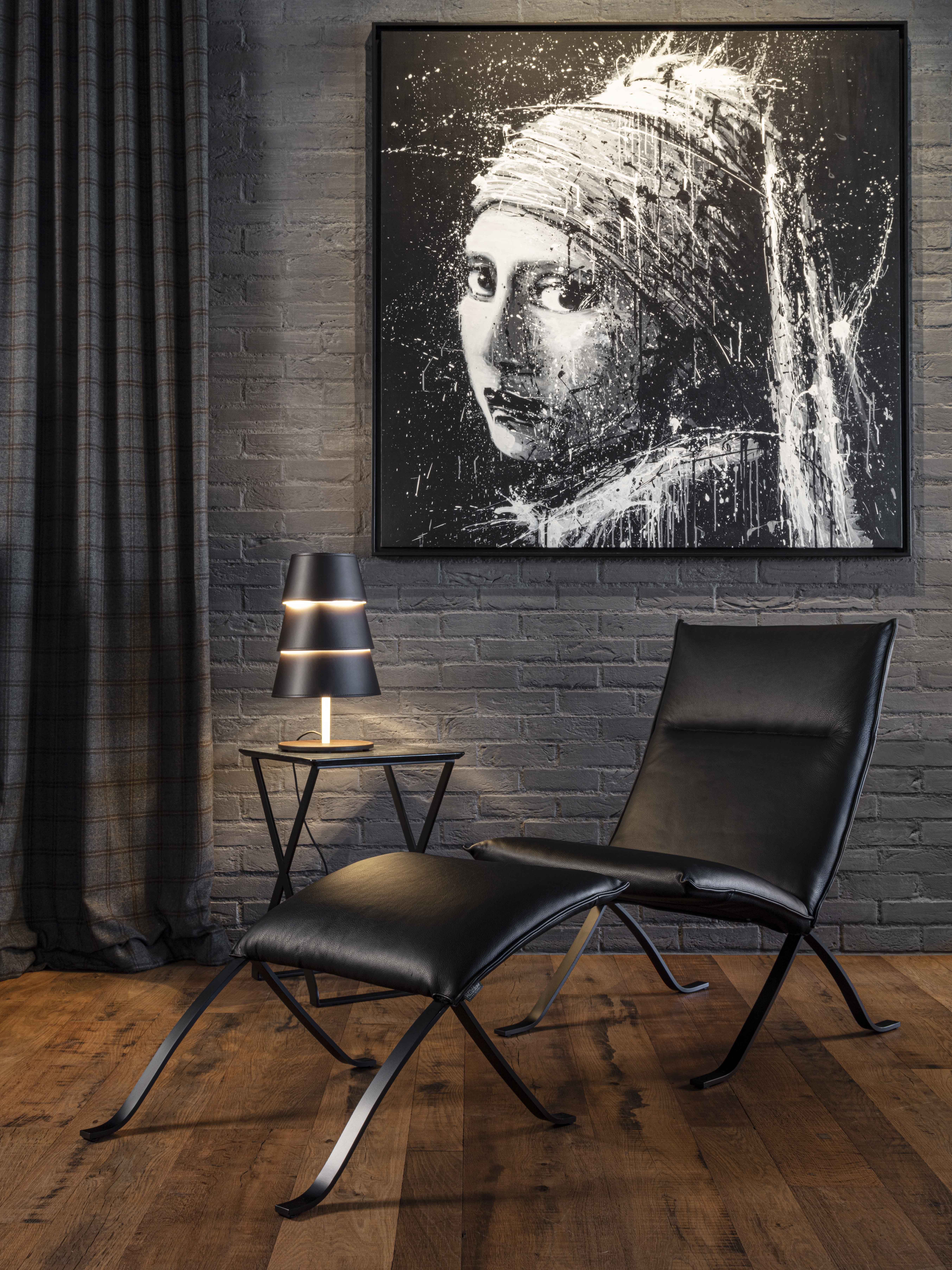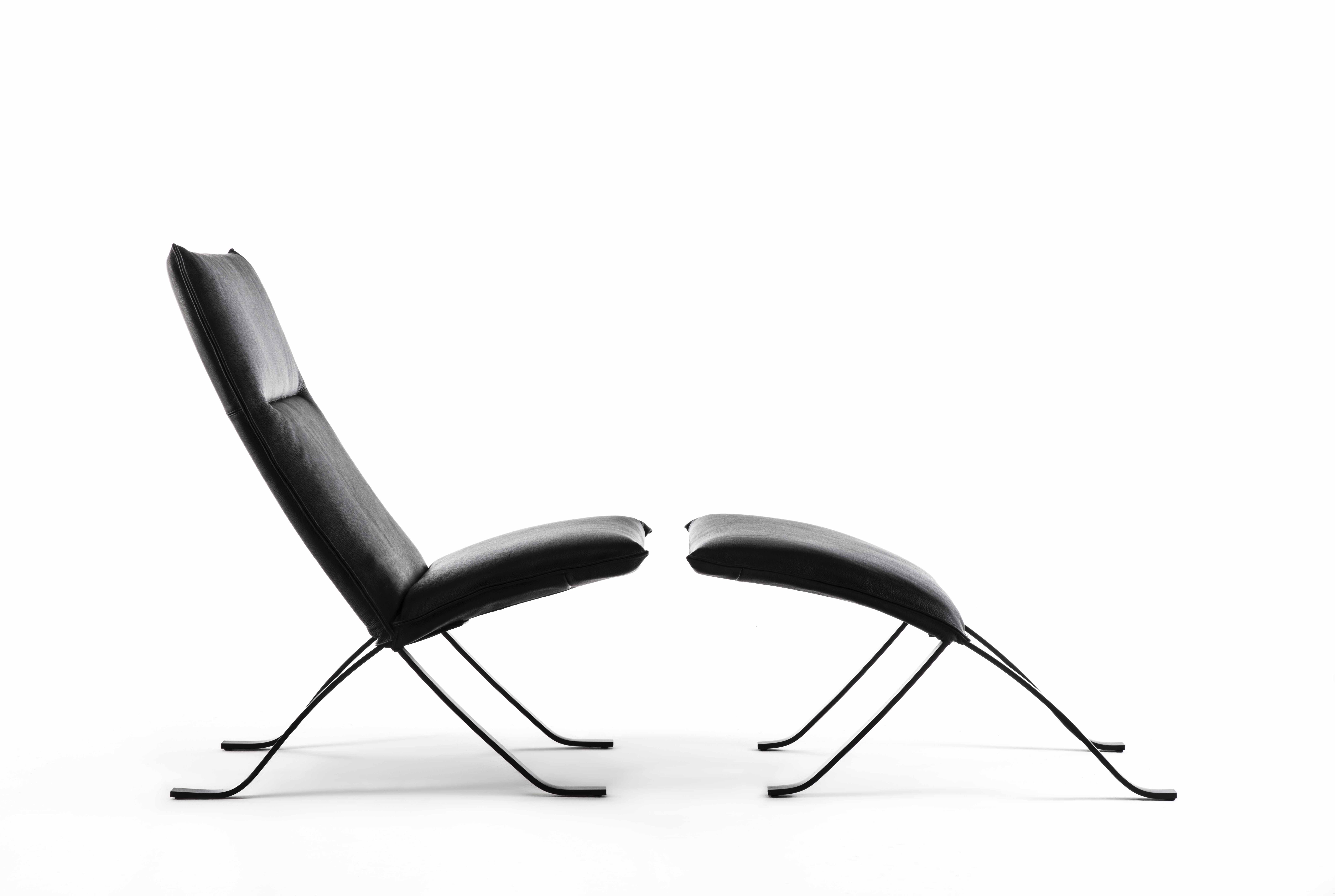 Cette superbe chaise longue à deux modules complémentaires - assise et repose-pieds - s'imposera de manière exclusive dans des contextes résidentiels et professionnels sophistiqués. Complétée par une structure métallique minimaliste et fluide laquée en noir, elle offre des moments de pure détente grâce à un rembourrage généreux enveloppé de cuir noir fin.