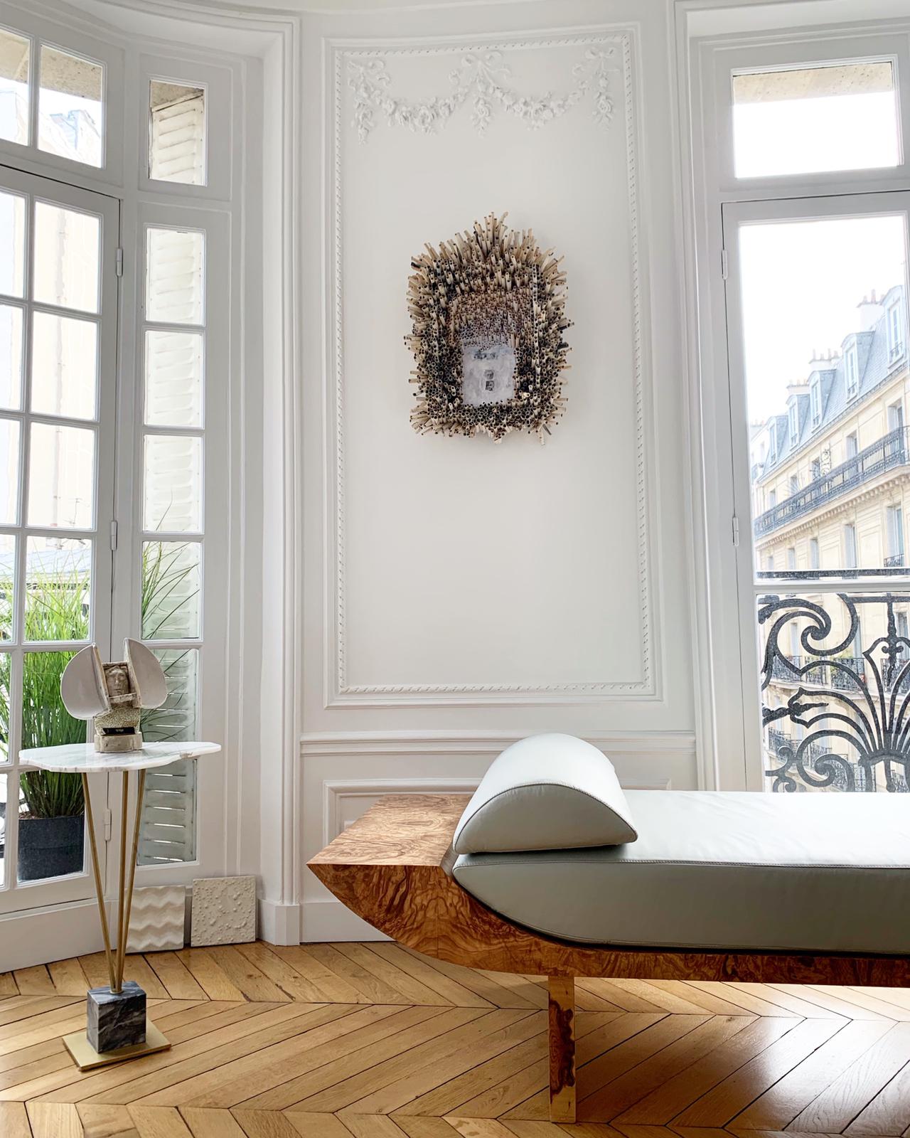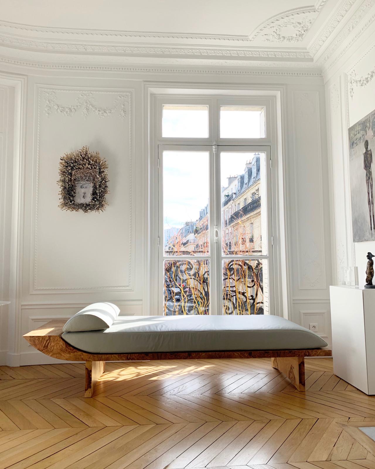 Inspirée par la lune qui illumine les nuits parisiennes sur les Champs-Élysées, cette création de Brigitte Legeandre déborde d'une élégance intemporelle. Le charme brut de la structure en bois réside dans l'utilisation de la bruyère d'olive, tandis qu'un confort sans faille est assuré par le siège en peluche avec coussin rembourré en latex et revêtu d'un cuir blanc qui confère au design son caractère éthéré distinctif.