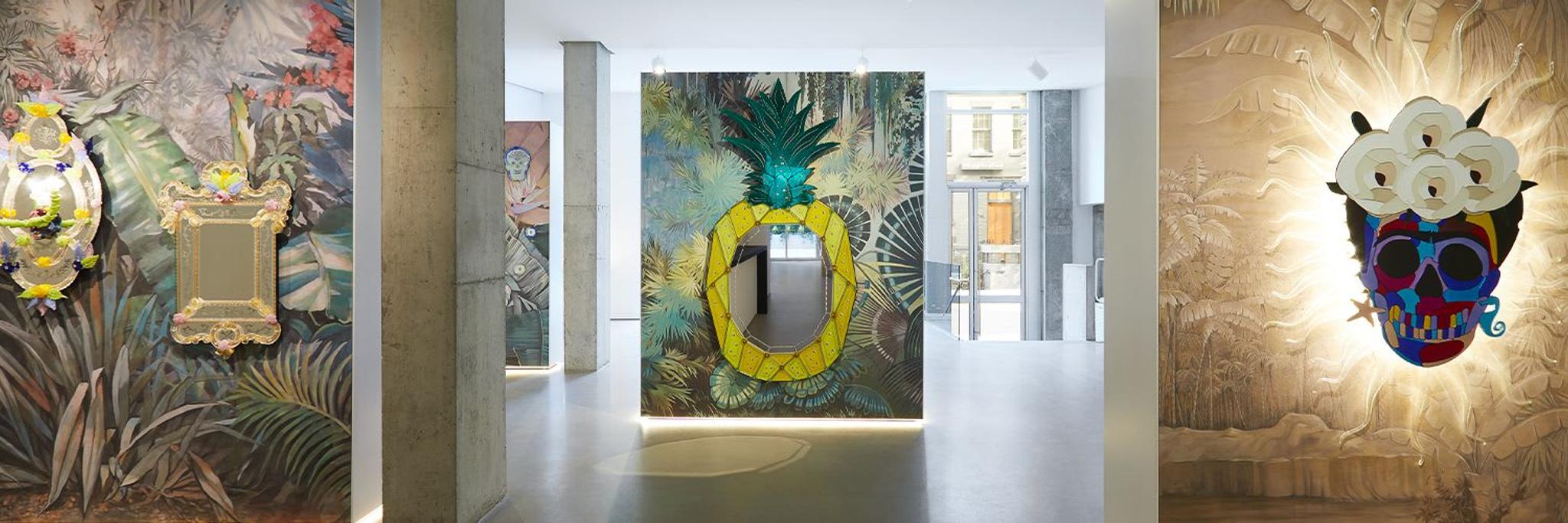 Inspiré par ses souvenirs d'enfance aux îles Turks et Caicos, Theodore a mélangé des formes familières comme des coraux, des coquillages et des ananas avec des symboles vénitiens classiques comme des lustres Rezzonico, des miroirs soufflés à la bouche et des souvenirs de Venise.