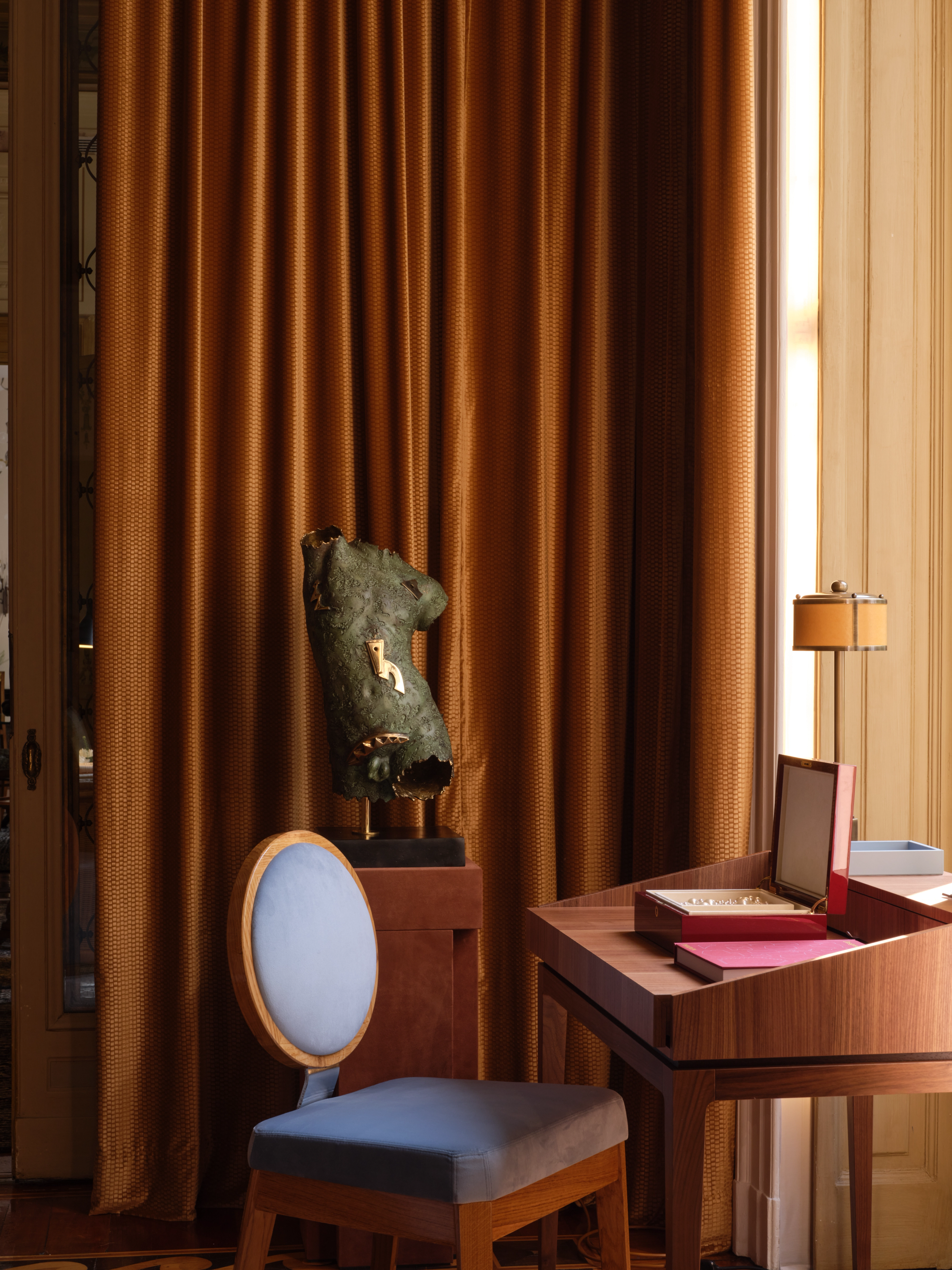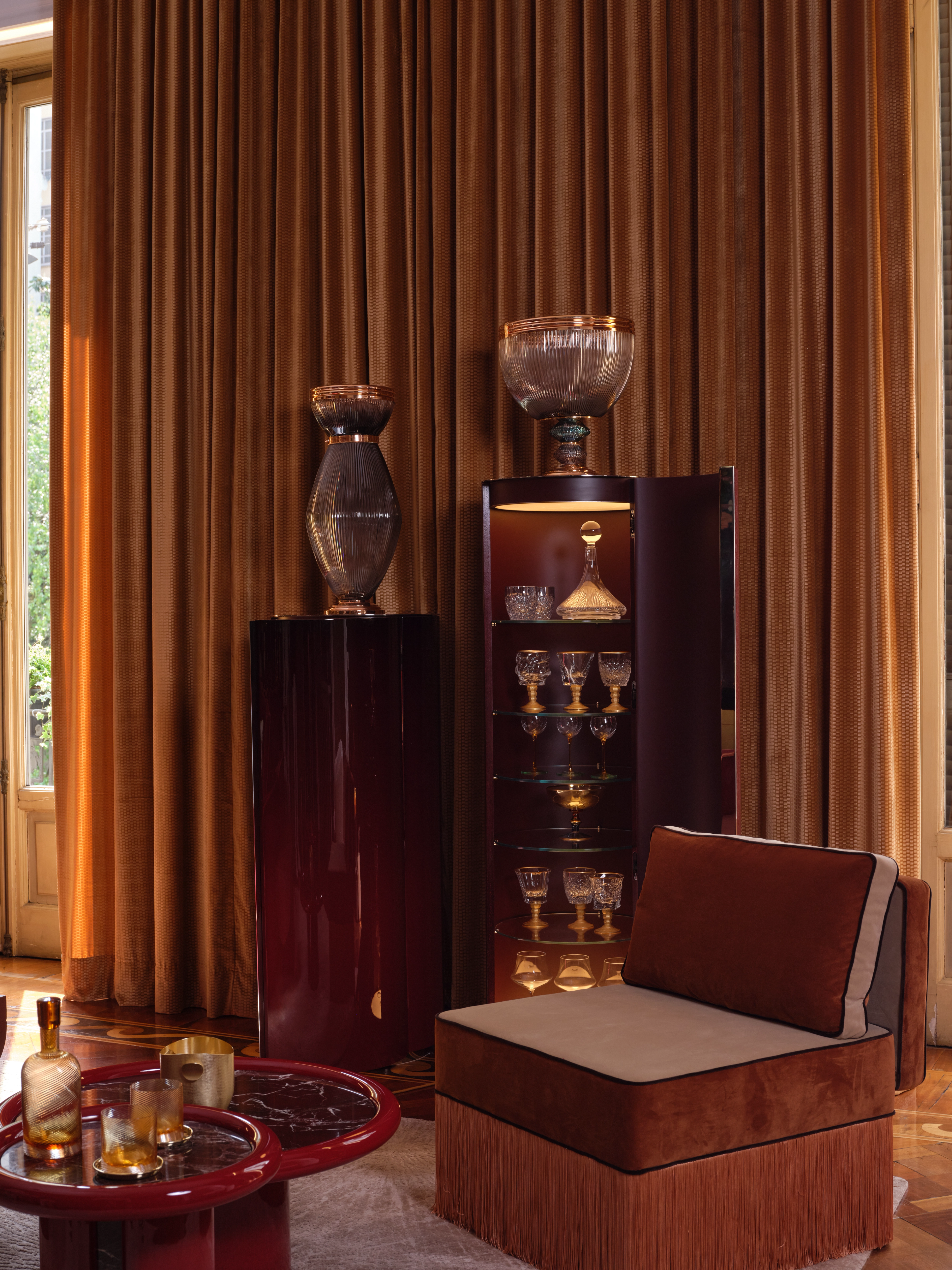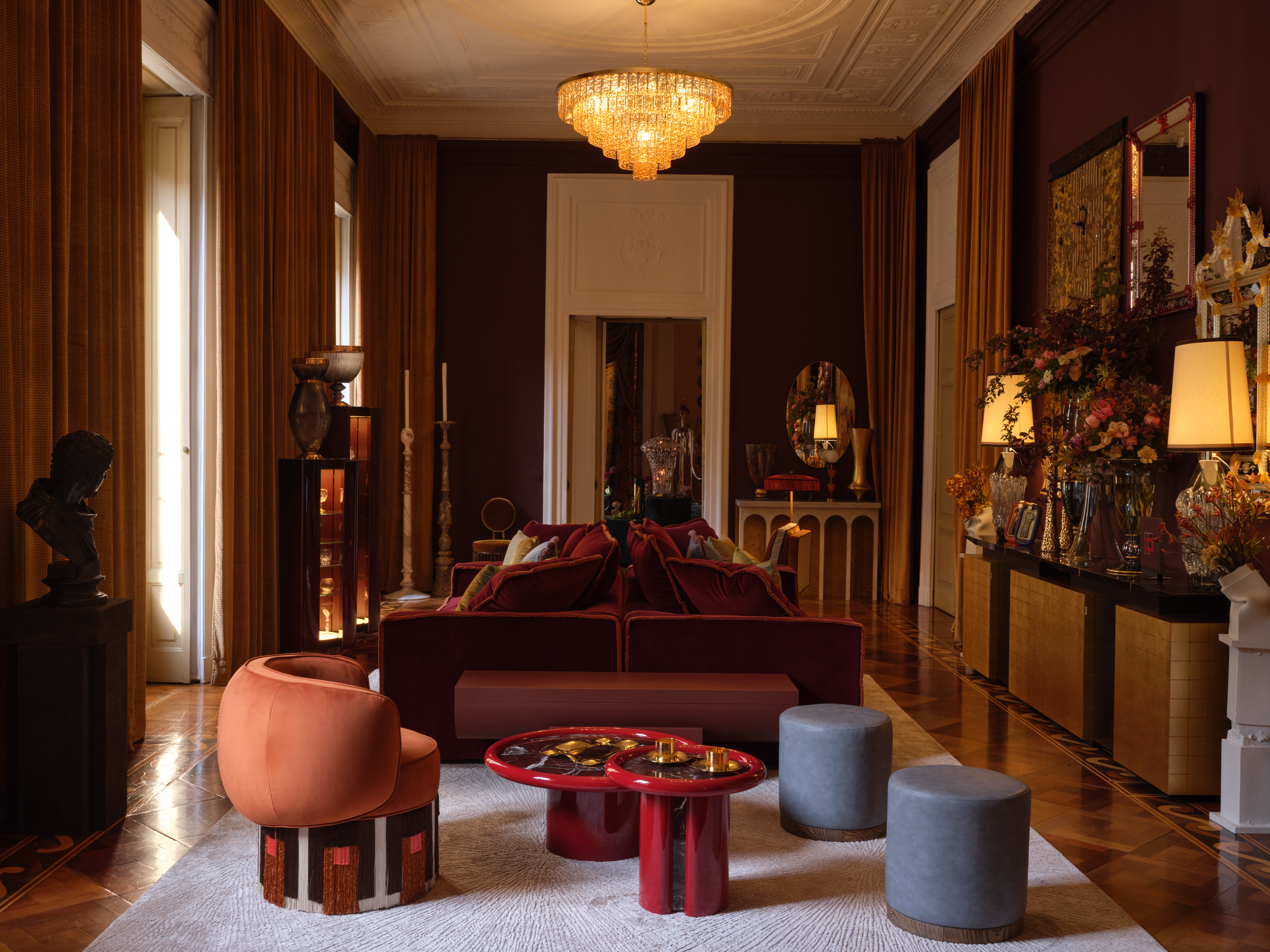 Inspiré par la grandeur de Rome et son héritage artistique durable, le Grand Salon par MAWD | March and White Design réinterprète l'architecture romaine classique et les traditions artisanales séculaires à travers une lentille contemporaine raffinée. Conçu comme un espace riche et atmosphérique, la pièce est définie par un jeu dramatique de lumière et d'ombre, où chiaroscuro forme une composition d'humeur de formes géométriques, de transitions douces et de matérialité superposée. Les rouges profonds sont équilibrés par la chaleur du parquet en bois, des touches de jaune doré doux, des détails en bronze chaud et des accents bleus maîtrisés, créant une palette qui semble ancrée, expressive et discrètement théâtrale. Les sièges en velours et les surfaces en marbre apportent intimité, permanence et raffinement classique, créant une pièce qui semble élégante, immersive et romaine.