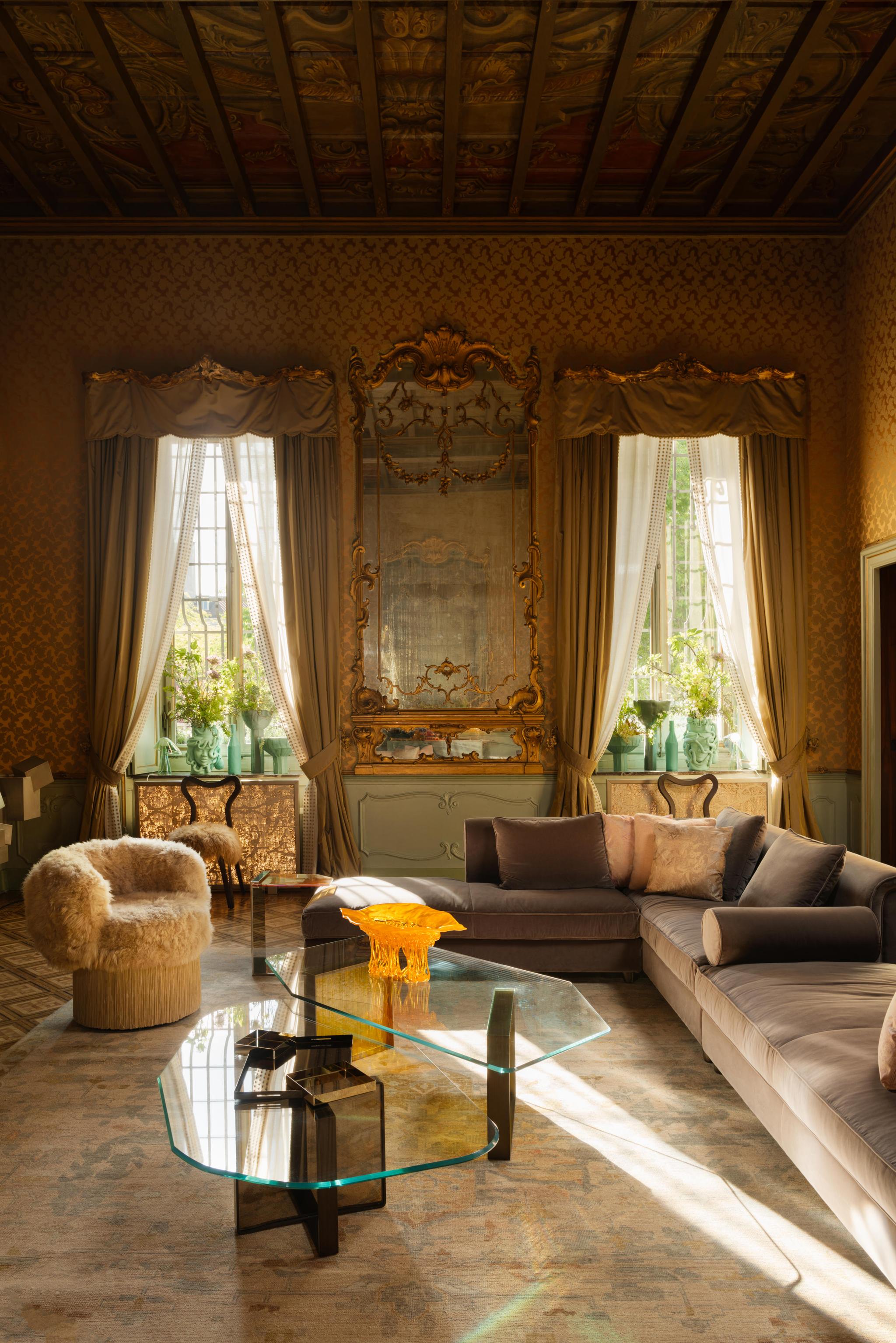 Le salon de L'Appartamento est un espace classique orné de murs dorés, de parquets et de hauts lambris. Reprenant les teintes chaudes des parquets, des murs ornés de tissus de brocart de soie dorée et des touches de vert céladon, Rottet Studio a choisi d'enrichir la palette de couleurs : tables basses en verre ambré coulé à la main, consoles en marbre vert, canapés et fauteuils rose saumon, tables en verre dichroïque qui reflètent toutes les teintes et la lumière ne sont que quelques-unes des pièces de mobilier qui ont été soigneusement sélectionnées pour que les visiteurs puissent les admirer en entrant dans le salon.